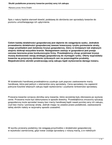 Skutki podatkowe przeceny towarów poniżej ceny ich zakupu Wpisany przez Anna Drabik Spis z natury będzie stanowił dowód, podstawę do obniżenia cen sprzedaży towarów do poziomu umożliwiającego ich upłynnienie. Celem każdej działalności gospodarczej jest dążenie do osiągnięcia zysku. Jednakże prowadzeniu działalności gospodarczej zawsze towarzyszy ryzyko poniesienia straty, czego przykładem jest światowy kryzys gospodarczy, który w mniejszym lub większym stopniu dotknął wszystkie branże. Następstwem zastoju w gospodarce jest presja cenowa tworzona przez konkurencyjne firmy. Przedsiębiorcy chcąc przetrwać kryzys muszą dostosować swoją strategię gospodarczą do wymagań rynku. Oferty wyprzedaży towarów są przyczyną obniżania rynkowych cen na poszczególne produkty. Niejednokrotnie obniżki przekraczają cenę zakupu bądź wytworzenia danego towaru. W działalności handlowej przedsiębiorca uzyskuje zysk poprzez zastosowanie marży handlowej, która jest jednym z elementów ceny sprzedaży. Cena sprzedaży ma zapewnić pokrycie kosztów własnych zakupu bądź wytworzenia i uzyskanie rentowności sprzedaży. Przecena towarów oznacza obniżkę ceny towarów, które wcześniej były oferowane po wyższej cenie. Przecena może być dokonywana w sposób dowolny. Przedsiębiorca zmuszony sytuacją gospodarczą może sprzedać towary bez marży handlowej bądź nawet poniżej ceny ich zakupu, czyli bez marży i ponosząc stratę. Jednak mając na uwadze prawo podatkowe, zastosowanie takiej obniżki należy w racjonalny sposób uzasadnić. W wyniku przeceny podatnicy nie osiągają przychodów z działalności gospodarczej w wysokości zamierzonej, gdyż towar zostaje sprzedany z niższą marżą, a w niektórych 1/9 Skutki podatkowe przeceny towarów poniżej ceny ich zakupu Wpisany przez Anna Drabik sytuacjach nawet poniżej kosztów zakupu, co w każdym przypadku powoduje obniżenie podstawy opodatkowania. Jednak takie działanie nie powoduje powstania dodatkowych kosztów oraz nie powoduje obowiązku obniżenia kosztów poniesionych na zakup bądź wytworzenie takich towarów. Co do zasady, przedsiębiorca sam decyduje, jakie ceny stosuje w obrocie gospodarczym, zatem sam ustala wysokość marży handlowej. Założeniem działalności gospodarczej jest osiągnięcie zysku, jednak najistotniejszym czynnikiem kształtującym ceny towarów jest prawo rynku. Taki pogląd potwierdza wyrok NSA w Szczecinie z dnia 19 maja 1999 r. sygn. SA/Sz 1045/98, w którym wskazano: (...) celem każdej działalności gospodarczej jest dążenie do osiągnięcia zysku, który w przypadku działalności handlowej uzyskuje się poprzez zastosowanie marży handlowej, to nie sposób z tego wyprowadzić prostego wniosku, że zysk taki musi wynikać zawsze z każdej indywidualnej operacji gospodarczej, niezależnie od czasu i warunków, w jakich jest przeprowadzana. Poza sytuacją na rynku istnieją również inne czynniki, którą mogą stanowić przyczynę obniżania ceny. Działanie takie może być skutkiem chęci szybszego pozbycia się towaru, który nie sprzedawał się dobrze po wyższej cenie bądź w celu uwolnienia miejsca w sklepie i magazynie na nowe towary lub z powodu stwierdzenia wad oferowanych produktów. Przedsiębiorcy prowadzący działalność handlową mogą ponieść szkodę, gdy towar zalega na półkach, gdy dochodzi do jego uszkodzenia albo utraty jego wartości, bliskiego przeterminowania, zakończenia sezonu, zmiany mody oraz wielu innych adekwatnych zdarzeń. Na obniżkę ceny może także wpłynąć przeprowadzona przez przedsiębiorcę kalkulacja finansowa, która wskazuje, że z ekonomicznego punktu widzenia bardziej opłacalne jest sprzedać towary poniżej ceny ich zakupu niż nie sprzedać ich w ogóle. Wtedy w celu zminimalizowania strata podatnicy często dokonują przeceny towarów. W takim przypadku to podatnik podejmuje decyzję o poniesieniu kosztów związanych z obniżką 2/9 Skutki podatkowe przeceny towarów poniżej ceny ich zakupu Wpisany przez Anna Drabik cen towarów poniżej ceny zakupu i sam ocenia ryzyko ekonomiczne i gospodarcze w tym zakresie. W wyroku NSA oz. w Krakowie z dnia 25 stycznia 2001 r. sygn. I SA/Kr 2312/98 czytamy: (...) nieprawdziwym jest już założenie, jakoby każda działalność musiała być dochodowa. Czasami racjonalny przedsiębiorca musi godzić się ponieść stratę na określonych transakcjach. W przypadku sprzedaży towarów poniżej ceny zakupu przedsiębiorca musi poprzeć taką decyzję dokumentami zawierającymi wiarygodne i rzetelne informacje na temat powodów takich działań. Przede wszystkim należy posiadać dokumenty odzwierciadlające ekonomiczne uzasadnienie tejże decyzji. Formalnym krokiem w tym zakresie będzie podjęcie uchwały przez organ decyzyjny w przedsiębiorstwie o obniżeniu ceny sprzedaży konkretnych towarów i w tej uchwale należy zawrzeć przyczyny podjęcia takiej decyzji oraz wskazać, których towarów decyzja dotyczy, a także po jakiej cenie chcemy dokonać ich sprzedaży. Kolejnym krokiem będzie sporządzenie spisu z natury towarów objętych planowaną obniżką ceny sprzedaży i ich wycena według ceny zakupu. Prawo podatkowe nie wskazuje wprost, jak powinny wyglądać dokumenty uzasadniające podjęcie decyzji o sprzedaży towarów poniżej ceny ich zakupu, jednak dokumenty te powinny również znaleźć odzwierciedlenie w księgach rachunkowych i w związku z tym muszą być zgodne z prawem bilansowym. W przypadku sprzedaży towarów po cenie niższej od ceny ich zakupu, nabycia czy kosztów wytworzenia, powoduje to utratę wartości tych towarów, a w ślad za tym rodzi konieczność aktualizacji wartości tych towarów. W tym celu należy ustalić stan ilościowy i wartościowy tych towarów w drodze spisu z natury. Spis z natury będzie stanowił dowód, podstawę do obniżenia cen sprzedaży do poziomu umożliwiającego ich upłynnienie. Prawidłowo 