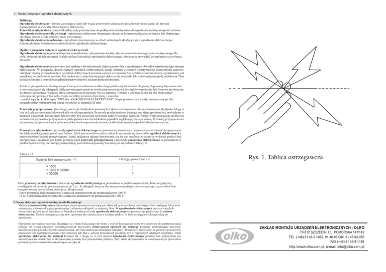 1. Normy dotycz¹ce ogrodzeñ elektrycznych. Definicje: Ogrodzenie elektryczne - bariera zawieraj¹ca jeden lub wiêcej przewodów elektrycznych izolowanych od ziemi, do których doprowadzone s¹ z elektryzatora impulsy elektryczne. Przewód przy³¹czeniowy - przewód elektryczny przeznaczony do pod³¹czenia elektryzatora do ogrodzenia elektrycznego lub uziomu. Ogrodzenia elektryczne dla zwierz¹t - ogrodzenie elektryczne obejmuj¹ce obszar, na którym znajduj¹ siê zwierzêta, lub obejmuj¹ce okreœlony obszar w celu ochrony przed zwierzêtami. Ogrodzenie elektryczne ochronne - ogrodzenie przeznaczone w celach ochronnych sk³adaj¹ce siê z ogrodzenia elektrycznego i fizycznych barier elektrycznie izolowanych od ogrodzenia elektrycznego. Ogólne wymagania dotycz¹ce ogrodzeñ elektrycznych. Ogrodzenie elektryczne powinno byæ tak zainstalowane i tak powinno dzia³aæ, aby nie stanowi³o ono zagro¿enia elektrycznego dla osób, zwierz¹t lub ich otoczenia. Nale¿y unikaæ konstrukcji ogrodzenia elektrycznego, która mo¿e prowadziæ do zapl¹tania siê zwierz¹t lub osób. Ogrodzenia elektryczne nie powinny byæ zasilane z dwóch ró¿nych elektryzatorów lub z niezale¿nych obwodów ogrodzenia tego samego elektryzatora. W przypadku dwóch ró¿nych ogrodzeñ elektrycznych, ka¿dy zasilany z ró¿nych elektryzatorów niezale¿nych czasowo, odleg³oœæ miêdzy przewodami tych ogrodzeñ elektrycznych powinna wynosiæ co najmniej 2 m. Je¿eli ta szczelina miedzy ogrodzeniami jest zamykana, to zamkniecie powinno byæ wykonane z nieprzewodz¹cego elektrycznie materia³u lub izolowanej przegrody metalowej. Drut kolczasty lub drut o ostrych krawêdziach nie powinien byæ zasilany przez elektryzator. Ka¿da czêœæ ogrodzenia elektrycznego, która jest instalowana wzd³u¿ drogi publicznej lub œcie¿ek dla pieszych powinny byæ oznaczone w powtarzaj¹cych siê odstêpach tablicami ostrzegawczymi na trwale przymocowanymi do s³upków ogrodzenia lub firmowo przykrêcone do drutów ogrodzenia. Wymiary tablic ostrzegawczych powinny byæ co najmniej 100 mm x 200 mm. Kolor t³a obu stron tablicy ostrzegawczej powinien byæ ¿ó³ty. Napis na tablicy powinien byæczarny i zawieraæ: - symbol wg rys. 1, albo napis “UWAGA - OGRODZENIE ELEKTRYCZNE”. Napis powinien byæ trwa³y, umieszczony po obu stronach tablicy ostrzegawczej i mieæ wysokoœæ co najmniej 25 mm. Przewody przy³¹czeniowe, które biegn¹ wewn¹trz budynków powinny byæ skutecznie izolowane od czêœci uziemionej budynku. Mog¹ w tym byæ celu zastosowane izolowane kable wysokiego napiêcia. Przewody przy³¹czeniowe, biegn¹ce pod ziemi¹ powinny byæ prowadzone w kana³ach z materia³u izolacyjnego lub powinny byæ stosowane izolowane kable wysokiego napiêcia. Nale¿y wzi¹æ pod uwagê mo¿liwoœæ uszkodzenia przewodów przy³¹czeniowych kopytami zwierz¹t lub ko³ami pojazdów zag³êbiaj¹cymi siê w ziemiê. Przewody przy³¹czeniowe nie powinny byæ prowadzone w tych samych kana³ach co przewody sieciowe, kable telekomunikacyjne lub kable informatyczne. Przewody przy³¹czeniowe i przewody ogrodzenia elektrycznego nie powinny krzy¿owaæ siê z napowietrznymi liniami energetycznymi lub telekomunikacyjnymi ponad tymi liniami. Je¿eli jest to mo¿liwe,nale¿y unikaæ krzy¿owania siê przewodów ogrodzeñ elektrycznych z napowietrznymi liniami energetycznymi. Je¿eli unikniêcie takiego krzy¿owania siê nie jest mo¿liwe to nale¿y je wykonaæ poni¿ej linii energetycznej i mo¿liwie pod katem prostym,Je¿eli przewody przy³¹czeniowe i przewody ogrodzenia elektrycznego s¹ prowadzone w pobli¿u napowietrznej linii energetycznej odstêpy powietrzne nie powinny byæ mniejsze ni¿ podane w tablicy T1. Tablica T1 Napiecie linii energetyczne - V = 1000 > 1000 = 33000 > 33000 Odstêpy powietrzne - m Rys. 1. Tablica ostrzegawcza 3 4 8 Je¿eli przewody przy³¹czeniowe i przewody ogrodzenia elektrycznego s¹ prowadzone w pobli¿u napowietrznej linii energetycznej ichodleg³oœæ od ziemi nie powinna przekraczaæ 2 m. Ta odleg³oœæ dotyczy obu stron prostopad³ego rzutu zewnêtrznych przewodów linii energetycznej na powierzchniê ziemi przy odleg³oœciach: - 2 m w przypadku linii energetycznej o napiêciu znamionowym nie przekraczaj¹cym 1000 V; - 15 m. w przypadku linii energetycznej o napiêciu znamionowym przekraczaj¹cym 1000 V. 2. Normy dotycz¹ce ogrodzeñ elektrycznych dla zwierz¹t. Miedzy uziomem elektryzatora i dowolnym innym systemem uziemiaj¹cym, takim jak system ochrony uziemiaj¹cy linii zasilaj¹cej lub system uziemiaj¹cy telekomunikacyjny, powinna byæ zachowana odleg³oœæ co najmniej 10 m. W ogrodzeniach elektrycznych przeznaczonych do odstraszania ptaków przed siadaniem na budynkach ¿adne przewody ogrodzenia elektrycznego nie powinny byæ pod³¹czone do uziomu elektryzatora. Tablica ostrzegawcza wg. rys. 1 powinna byæ umieszczona w ka¿dym punkcie, w którym mog¹ mieæ dostêp ludzie do ogrodzenia. Ogrodzenie nie naelektryzowane, sk³adaj¹ce siê z drutu kolczastego lub drutu o ostrych krawêdziach mo¿e byæ stosowane do podtrzymywania jednego lub wiêcej odczepów naelektryzowanych przewodów elektrycznych ogrodzeñ dla zwierz¹t. Elementy podtrzymuj¹ce przewody naelektryzowane powinny byæ tak skonstruowane, aby by³a zachowana minimalna odleg³oœæ 150 mm tych przewodów od pionowej p³aszczyzny przewodów nie naelektryzowanych. Drut kolczasty lub drut o ostrych krawêdziach powinien byæ w regularnych odstêpach uziemiany. Je¿eli ogrodzenie elektryczne dla zwierz¹t krzy¿uje siê z drog¹, to w tym miejscu ogrodzenia elektrycznego powinny byæ umieszczone nie naelektryzowane bramki lub w skrzy¿owaniu powinny byæ przewidziane prze³azy. Przy takim skrzy¿owaniu na elektryzowanym przewodzie powinny byæ zawieszone tabliczki ostrzegawcze (rys. 1). ZAK£AD MONTA¯U URZ¥DZEÑ ELEKTRONICZNYCH - OLKO 70-812 SZCZECIN, UL. POMORSKA 141/143 TEL. (+48) 91 46-91-992, 91 46-93-084, 91 46-93-085 F