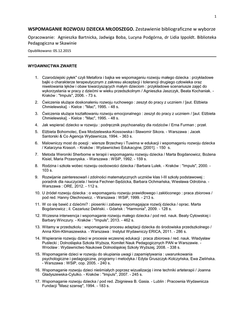 1 WSPOMAGANIE ROZWOJU DZIECKA MŁODSZEGO. Zestawienie bibliograficzne w wyborze Opracowanie: Agnieszka Bartnicka, Jadwiga Boba, Lucyna Podgórna, dr Lidia Ippoldt. Biblioteka Pedagogiczna w Skawinie Opublikowano: 05.12.2015 WYDAWNICTWA ZWARTE 1. Czarodziejski pyłek" czyli Metafora i bajka we wspomaganiu rozwoju małego dziecka : przykładowe bajki o charakterze terapeutycznym z zakresu akceptacji i tolerancji drugiego człowieka oraz niwelowania lęków i obaw towarzyszących małym dzieciom : przykładowe scenariusze zajęć do wykorzystania w pracy z dziećmi w wieku przedszkolnym / Agnieszka Jaszczyk, Beata Kochaniak. Kraków : "Impuls", 2006. - 73 s. 2. Ćwiczenia służące doskonaleniu rozwoju ruchowego : zeszyt do pracy z uczniem / [aut. Elżbieta Chmielewska]. - Kielce : "Mac", 1995. - 48 s. 3. Ćwiczenia służące kształtowaniu rozwoju emocjonalnego : zeszyt do pracy z uczniem / [aut. Elżbieta Chmielewska]. - Kielce : "Mac", 1995. - 48 s. 4. Jak wspierać dziecko w rozwoju : podręcznik psychoanalizy dla rodziców / Erna Furman ; przeł. 5. Elżbieta Bohomolec, Ewa Modzelewska-Kossowska i Sławomir Sikora. - Warszawa : Jacek Santorski & Co Agencja Wydawnicza, 1994. - 363 s. 6. Malowniczy most do poezji : wiersze Brzechwy i Tuwima w edukacji i wspomaganiu rozwoju dziecka / Katarzyna Krasoń. - Kraków : Wydawnictwo Edukacyjne, [2001]. - 150 s. 7. Metoda Weroniki Sherborne w terapii i wspomaganiu rozwoju dziecka / Marta Bogdanowicz, Bożena Kisiel, Maria Przasnyska. - Warszawa : WSiP, 1992. - 159 s. 8. Rodzina i szkoła wobec rozwoju osobowości dziecka / Barbara Lulek. - Kraków : "Impuls", 2000. 103 s. 9. Rozwijanie zainteresowań i zdolności matematycznych uczniów klas I-III szkoły podstawowej : poradnik dla nauczyciela / Iwona Fechner-Sędzicka, Barbara Ochmańska, Wiesława Odrobina. Warszawa : ORE, 2012. - 112 s. 10. U źródeł rozwoju dziecka : o wspomaganiu rozwoju prawidłowego i zakłóconego : praca zbiorowa / pod red. Hanny Olechnowicz. - Warszawa : WSiP, 1999. - 213 s. 11. W co się bawić z dziećmi? : piosenki i zabawy wspomagające rozwój dziecka / oprac. Marta Bogdanowicz ; il. Cezariusz Deliński. - Gdańsk : "Harmonia", 2009. - 128 s. 12. Wczesna interwencja i wspomaganie rozwoju małego dziecka / pod red. nauk. Beaty Cytowskiej i Barbary Winczury. - Kraków : "Impuls", 2013. - 462 s. 13. Witamy w przedszkolu : wspomaganie procesu adaptacji dziecka do środowiska przedszkolnego / Anna Klim-Klimaszewska. - Warszawa : Instytut Wydawniczy ERICA, 2011. - 286 s. 14. Wspieranie rozwoju dzieci w procesie wczesnej edukacji : praca zbiorowa / red. nauk. Władysław Puślecki ; Dolnośląska Szkoła Wyższa, Komitet Nauk Pedagogicznych PAN w Warszawie. Wrocław : Wydawnictwo Naukowe Dolnośląskiej Szkoły Wyższej, 2008. - 338 s. 15. Wspomaganie dzieci w rozwoju do skupiania uwagi i zapamiętywania : uwarunkowania psychologiczne i pedagogiczne, programy i metodyka / Edyta Gruszczyk-Kolczyńska, Ewa Zielińska. - Warszawa : WSiP, cop. 2005. - 240 s. 16. Wspomaganie rozwoju dzieci nieśmiałych poprzez wizualizację i inne techniki arteterapii / Joanna Gładyszewska-Cylulko. - Kraków : "Impuls", 2007. - 245 s. 17. Wspomaganie rozwoju dziecka / pod red. Zbigniewa B. Gasia. - Lublin : Pracownia Wydawnicza Fundacji "Masz szansę", 1994. - 183 s. 2 18. Wspomaganie rozwoju społecznego dziecka / Joanna Grochulska. - Wrocław [etc.] : Zakład Narodowy im. Ossolińskich, 1992. - 152 s. 19. Wspólnie z dziećmi : o wspieraniu rozwoju małego dziecka : praktyka i teoria / pod red. Haliny Mazur [i in.]. - Łódź : Oficyna Wydawnicza "Tercja", 2005. - 423 s. 20. Zarys terapii dziecka : metody psychologicznej i pedagogicznej pomocy wspomagającej rozwój dziecka / Barbara Kaja ; Akademia Bydgoska im. Kazimierza Wielkiego. - Bydgoszcz : Wydawnictwo Uczelniane Akademii Bydgoskiej, 2001. - 169 s. ARTYKUŁY Z CZASOPISM 1. "Jesteśmy badaczami drzewa kasztanowca" : autorski projekt edukacyjny wspomagający rozwój dzieci w wieku wczesnoszkolnym / Krystyna Kaba // Życie Szkoły. - 2012, nr 8, s. 16-18 2. Będę uczniem : zabawy wspomagające rozwój dziecka sześcioletniego / Beata Bielska // Bliżej Przedszkola. - 2010, nr 10, s. 74-78 3. Dokumentowanie przebiegu zajęć wczesnego wspomagania rozwoju dziecka / Grażyna Kowalczyk // Rewalidacja. - 2010, nr 2, s. 59-63 4. Gry planszowe jako narzędzie wspomagania rozwoju wczesnych kompetencji matematycznych / Krzysztof Cipora, Monika Szczygieł // Edukacja. - 2013, nr 3, s. 60-75 5. Holenderski system wspierania rozwoju dzieci / Hanna Krauze-Sikorska, Kinga Kuszak // Życie Szkoły. - 2008, nr 3, s. 52-59 6. Innowacyjne spojrzenie / Bronisława Dymara // Bliżej Przedszkola. - 2010, nr 7/8, s. 68-69 7. Jak przedszkole może wspomagać rozwój twórczej aktywności dziecka - na przykładzie doświadczeń brytyjskich / Barbara Bilewicz-Kuźnia // Wychowanie na co Dzień. - 2008, nr 1-2, s. 3436 8. Jak rozwijać zdolności dziecka? / Elżbieta Marek // Życie Szkoły. - 2010, nr 1, s. 59-62 9. Jak wspierać sprawność manualną na starcie szkolnym? / Katarzyna Nadrowska // Życie Szkoły. - 2011, nr 9, s. 54-62 10. Jak wspomagać rozwój motoryczny dziecka sześcioletniego? / Katarzyna Nadrowska // Życie Szkoły. - 2011, nr 8, s. 48-56 11. Jak wspomagać starsze przedszkolaki w rozwijaniu zdolności do zapamiętywania - na przykładzie nauki wierszy / Edyta Gruszczyk-Kolczyńska // Bliżej Przedszkola. - 2012, nr 3, s. 8-11 12. Jesteśmy różni, ale tak samo ważni... : scenariusz zajęć z zakresu wspomagania rozwoju społecznego dla dzieci pięcio-, sześcioletnich / Magdalena Żujew // Bliżej Przedszkola. 2013, nr 5, s. 48-50 13. Kiedy coś buduję, to z kolegą współpracuję : wspomaganie rozwoju społecznego dziecka / Monika Majewska // Bliżej Przedszkola. - 2012, nr 10, s. 82-83 14. Model zajęć muzyczno - słowno - ruchowych wspomagający rozwój dzieci o zróżnicowanym poziomie intelektualnym w młodszym wieku szkol