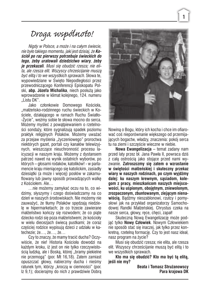 1 Droga wspólnoto! Nigdy w Polsce, a może i na całym świecie, nie było takiego momentu, jaki jest dzisiaj, że Kościół po raz pierwszy potrzebuje świeckich do tego, żeby uratowali dziedzictwo wiary, żeby je przekazali. Musi się obudzić rzesza; nie elita, ale rzesza elit. Wszyscy chrześcijanie muszą być elitą i to we wszystkich sprawach. Słowa te, wypowiedziane w Święto Niepodległości przez przewodniczącego Konferencji Episkopatu Polski, abp. Józefa Michalika, niech posłużą jako wprowadzenie w klimat kolejnego, 124. numeru „Listu DK”. Jako członkowie Domowego Kościoła, „małżeńsko-rodzinnego ruchu świeckich w Kościele, działającego w ramach Ruchu Światło-Życie”, weźmy sobie te słowa mocno do serca. Możemy myśleć z powątpiewaniem o rzetelności sondaży, które sygnalizują spadek poziomu praktyk religijnych Polaków. Możemy uważać za przejaw myślenia „życzeniowego” proroctwa niektórych gazet, portali czy kanałów telewizyjnych, wieszczące nieuchronność procesu laicyzacji w naszym kraju. Możemy z dystansem patrzeć nawet na wynik ostatnich wyborów, po których – głosami rodaków, katolików! - w parlamencie kraju mieniącego się katolickim, zasiadły dziesiątki (a może i więcej) posłów w zakamuflowany lub jawny sposób prowadzących walkę z Kościołem. Ale… …nie możemy zamykać oczu na to, co widzimy, słyszymy i czego doświadczamy na co dzień w naszych środowiskach. Nie możemy nie zauważyć, że tłumy Polaków spędzają niedzielę w hipermarketach; że co trzecie zawierane małżeństwo kończy się rozwodem; że co piąte dziecko rodzi się poza małżeństwem; że kościoły w wielu diecezjach świecą pustkami; że coraz częściej rodzice wypisują dzieci z udziału w katechezie; że…, że…, że… Czy to znaczy, że mamy tracić ducha? Oczywiście, że nie! Historia Kościoła dowodzi na każdym kroku, iż jest on nie tylko rzeczywistością ludzką, ale i Boską, której „bramy piekielne nie przemogą” (por. Mt 16,18). Zatem zamiast opuszczać głowy, nabierzmy ducha i nieśmy ratunek tym, którzy „kroczą w ciemności” (por. Iz 9,1); docierajmy do nich z prawdziwie Dobrą Nowiną o Bogu, który ich kocha i chce im ofiarować coś nieporównanie większego od przemijających bogactw, władzy, znaczenia: pokój serca tu na ziemi i szczęście wieczne w niebie. Nowa Ewangelizacja – temat zadany nam przed laty przez bł. Jana Pawła II, powraca dziś z całą ostrością jako stojące przed nami wyzwanie. Zatroszczmy się zatem o wzrastanie w świętości małżeńskiej i skuteczny przekaz wiary w naszych rodzinach, po czym wyjdźmy dalej: ku naszym krewnym, sąsiadom, kolegom z pracy, mieszkańcom naszych miejscowości, ku uśpionym, obojętnym, zniewolonym, zrozpaczonym, zbuntowanym, ziejącym nienawiścią. Bądźmy nieszablonowi, rzutcy i pomysłowi jak na przykład organizatorzy Samochodowej Randki Małżeńskiej. Chrystus czeka na nasze serca, głowy, ręce, chęci, zapał! Skuteczną Nową Ewangelizację może podjąć tylko Nowy Człowiek. Nowym Człowiekiem nie sposób stać się inaczej, jak tylko przez konkretną, rzetelną formację. Czy to jest nasz ideał, nasz program na życie? Musi się obudzić rzesza; nie elita, ale rzesza elit. Wszyscy chrześcijanie muszą być elitą i to we wszystkich sprawach. Kto ma się obudzić? Kto ma być tą elitą, jeśli nie my? Beata i Tomasz Strużanowscy Para krajowa DK 2 Nie bójcie się! Oto zwiastuję wam radość wielką! Łk 2,10 Kochani! Z nadzieją, że ten numer „Listu” dotrze na czas do Waszych rąk, składamy Wam najserdeczniejsze życzenia świąteczne. Niech uroczystość Bożego Narodzenia, podczas której na nowo uświadomimy sobie, jak wielką miłością obdarzył nas Ojciec (por. 1 J 3,1), odświeży Waszą wiarę, napełni Was nową nadzieją i wleje w serca moc do tego, by jeszcze bardziej kochać. Niech będą to święta wolne od rutyny, obfitujące w duchowe odkrycia, napełniające zapałem do tego, by „iść i głosić”. Niech będzie to czas uważnego wpatrzenia się w losy Świętej Rodziny i odnalezienia w nich inspiracji dla naszego indywidualnego, małżeńskiego i rodzinnego wzrostu. Podnieś rękę, Boże Dziecię i pobłogosław nam wszystkim! Redakcja „Listu DK” Zdjęcia na okładkach: okładka zewnętrzna I – fot. Zbigniew Fidos; okładka wewnętrzna II – fot. Grzegorz Śliwowski oraz archiwum redakcji; okładka wewnętrzna III – archiwum redakcji ; okładka zewnętrzna IV – fot. Stanisław Składanowski. Odpowiedzialni za treść LISTU: Beata i Tomasz Strużanowscy, ks. Marek Borowski SAC; redakcja merytoryczna oraz redakcja działu „Formacja”: Beata i Tomasz Strużanowscy, e-mail: tomekstruzanowski@ op.pl; redakcja działu „Znaki czasu” oraz projekt okładki: Agnieszka i Tomasz Talagowie, e-mail: listdk@ op.pl; redakcja działu „Z życia DK”: Elżbieta i Mirosław Wrotek, e-mail: [email protected]; redakcja działu „Świadectwa”: Jolanta i Mirosław Słobodowie, e-mail: [email protected]; opracowanie graficzne: Piotr Sinielewicz, e-mail: [email protected]; druk i oprawa: Comernet, ul. Głuska 6, 20-439 Lublin; prenumerata i zmiany ilości zamawianych egzemplarzy: Sekretariat DK, ul. Jagiellońska 100, 34-450 Krościenko n. Dunajcem, e-mail: [email protected], tel. 18/ 262 39 42. Wpłaty za LIST (przez osoby odpowiedzialne za dystrybucję) na konto: 13 1560 1108 0000 9060 0019 2403 GETIN BANK, z dopiskiem „za LIST nr 124”. „Domowy Kościół. List do wspólnot rodzinnych” jest pismem formacyjno-informacyjnym kierowanym do członków Domowego Kościoła – gałęzi rodzinnej Ruchu Światło-Życie. Ukazuje się od 1975 roku. Pierwszym redaktorem był Sługa Boży ks. Franciszek Blachnicki (1921-1987). Do użytku wewnętrznego Kościoła Rzymskokatolickiego w Polsce. Grudzień 2011 – luty 2012. 3 SPIS TREŚCI WSTĘP Z ŻYCIA DK Od redakcji . . . . . . 