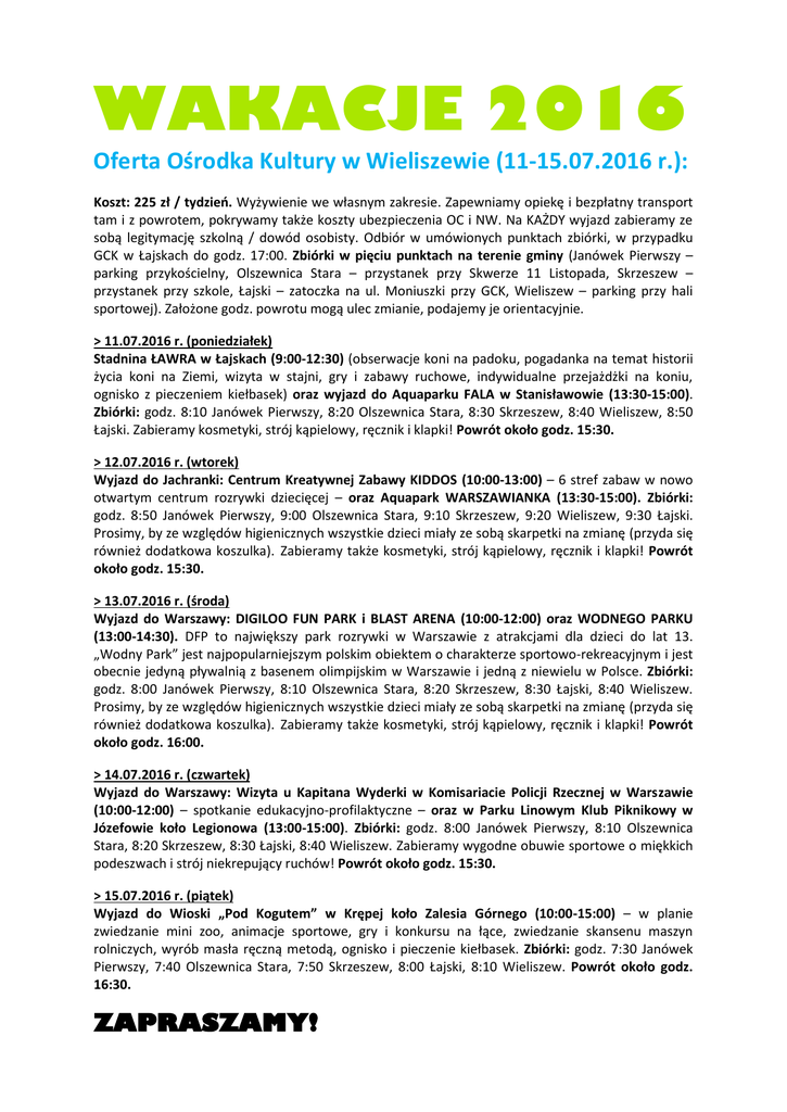 WAKACJE 2016 Oferta Ośrodka Kultury w Wieliszewie (11-15.07.2016 r.): Koszt: 225 zł / tydzień. Wyżywienie we własnym zakresie. Zapewniamy opiekę i bezpłatny transport tam i z powrotem, pokrywamy także koszty ubezpieczenia OC i NW. Na KAŻDY wyjazd zabieramy ze sobą legitymację szkolną / dowód osobisty. Odbiór w umówionych punktach zbiórki, w przypadku GCK w Łajskach do godz. 17:00. Zbiórki w pięciu punktach na terenie gminy (Janówek Pierwszy – parking przykościelny, Olszewnica Stara – przystanek przy Skwerze 11 Listopada, Skrzeszew – przystanek przy szkole, Łajski – zatoczka na ul. Moniuszki przy GCK, Wieliszew – parking przy hali sportowej). Założone godz. powrotu mogą ulec zmianie, podajemy je orientacyjnie. > 11.07.2016 r. (poniedziałek) Stadnina ŁAWRA w Łajskach (9:00-12:30) (obserwacje koni na padoku, pogadanka na temat historii życia koni na Ziemi, wizyta w stajni, gry i zabawy ruchowe, indywidualne przejażdżki na koniu, ognisko z pieczeniem kiełbasek) oraz wyjazd do Aquaparku FALA w Stanisławowie (13:30-15:00). Zbiórki: godz. 8:10 Janówek Pierwszy, 8:20 Olszewnica Stara, 8:30 Skrzeszew, 8:40 Wieliszew, 8:50 Łajski. Zabieramy kosmetyki, strój kąpielowy, ręcznik i klapki! Powrót około godz. 15:30. > 12.07.2016 r. (wtorek) Wyjazd do Jachranki: Centrum Kreatywnej Zabawy KIDDOS (10:00-13:00) – 6 stref zabaw w nowo otwartym centrum rozrywki dziecięcej – oraz Aquapark WARSZAWIANKA (13:30-15:00). Zbiórki: godz. 8:50 Janówek Pierwszy, 9:00 Olszewnica Stara, 9:10 Skrzeszew, 9:20 Wieliszew, 9:30 Łajski. Prosimy, by ze względów higienicznych wszystkie dzieci miały ze sobą skarpetki na zmianę (przyda się również dodatkowa koszulka). Zabieramy także kosmetyki, strój kąpielowy, ręcznik i klapki! Powrót około godz. 15:30. > 13.07.2016 r. (środa) Wyjazd do Warszawy: DIGILOO FUN PARK i BLAST ARENA (10:00-12:00) oraz WODNEGO PARKU (13:00-14:30). DFP to największy park rozrywki w Warszawie z atrakcjami dla dzieci do lat 13. „Wodny Park” jest najpopularniejszym polskim obiektem o charakterze sportowo-rekreacyjnym i jest obecnie jedyną pływalnią z basenem olimpijskim w Warszawie i jedną z niewielu w Polsce. Zbiórki: godz. 8:00 Janówek Pierwszy, 8:10 Olszewnica Stara, 8:20 Skrzeszew, 8:30 Łajski, 8:40 Wieliszew. Prosimy, by ze względów higienicznych wszystkie dzieci miały ze sobą skarpetki na zmianę (przyda się również dodatkowa koszulka). Zabieramy także kosmetyki, strój kąpielowy, ręcznik i klapki! Powrót około godz. 16:00. > 14.07.2016 r. (czwartek) Wyjazd do Warszawy: Wizyta u Kapitana Wyderki w Komisariacie Policji Rzecznej w Warszawie (10:00-12:00) – spotkanie edukacyjno-profilaktyczne – oraz w Parku Linowym Klub Piknikowy w Józefowie koło Legionowa (13:00-15:00). Zbiórki: godz. 8:00 Janówek Pierwszy, 8:10 Olszewnica Stara, 8:20 Skrzeszew, 8:30 Łajski, 8:40 Wieliszew. Zabieramy wygodne obuwie sportowe o miękkich podeszwach i strój niekrepujący ruchów! Powrót około godz. 15:30. > 15.07.2016 r. (piątek) Wyjazd do Wioski „Pod Kogutem” w Krępej koło Zalesia Górnego (10:00-15:00) – w planie zwiedzanie mini zoo, animacje sportowe, gry i konkursu na łące, zwiedzanie skansenu maszyn rolniczych, wyrób masła ręczną metodą, ognisko i pieczenie kiełbasek. Zbiórki: godz. 7:30 Janówek Pierwszy, 7:40 Olszewnica Stara, 7:50 Skrzeszew, 8:00 Łajski, 8:10 Wieliszew. Powrót około godz. 16:30. ZAPRASZAMY!