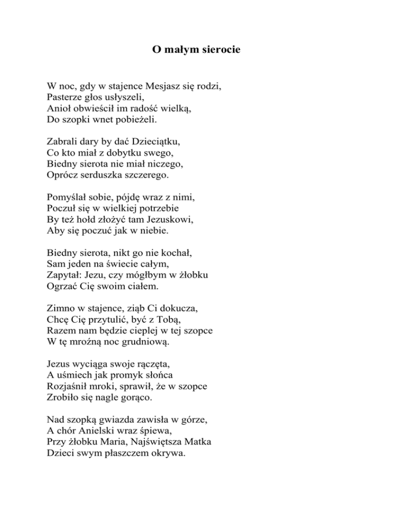 O małym sierocie W noc, gdy w stajence Mesjasz się rodzi, Pasterze głos usłyszeli, Anioł obwieścił im radość wielką, Do szopki wnet pobieżeli. Zabrali dary by dać Dzieciątku, Co kto miał z dobytku swego, Biedny sierota nie miał niczego, Oprócz serduszka szczerego. Pomyślał sobie, pójdę wraz z nimi, Poczuł się w wielkiej potrzebie By też hołd złożyć tam Jezuskowi, Aby się poczuć jak w niebie. Biedny sierota, nikt go nie kochał, Sam jeden na świecie całym, Zapytał: Jezu, czy mógłbym w żłobku Ogrzać Cię swoim ciałem. Zimno w stajence, ziąb Ci dokucza, Chcę Cię przytulić, być z Tobą, Razem nam będzie cieplej w tej szopce W tę mroźną noc grudniową. Jezus wyciąga swoje rączęta, A uśmiech jak promyk słońca Rozjaśnił mroki, sprawił, że w szopce Zrobiło się nagle gorąco. Nad szopką gwiazda zawisła w górze, A chór Anielski wraz śpiewa, Przy żłobku Maria, Najświętsza Matka Dzieci swym płaszczem okrywa.