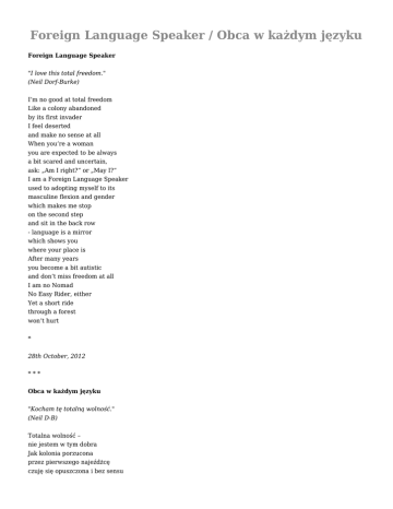 Foreign Language Speaker / Obca w każdym języku Foreign Language Speaker "I love this total freedom." (Neil Dorf-Burke) I’m no good at total freedom Like a colony abandoned by its first invader I feel deserted and make no sense at all When you’re a woman you are expected to be always a bit scared and uncertain, ask: „Am I right?” or „May I?” I am a Foreign Language Speaker used to adopting myself to its masculine flexion and gender which makes me stop on the second step and sit in the back row - language is a mirror which shows you where your place is After many years you become a bit autistic and don’t miss freedom at all I am no Nomad No Easy Rider, either Yet a short ride through a forest won’t hurt * 28th October, 2012 *** Obca w każdym języku "Kocham tę totalną wolność." (Neil D-B) Totalna wolność – nie jestem w tym dobra Jak kolonia porzucona przez pierwszego najeźdżcę czuję się opuszczona i bez sensu Kiedy jest się kobietą należy być nieco bojaźliwą i niepewną, pytać: „Mam rację?” albo: „Czy mogę?” Jestem obca w każdym języku, uznaję przewagę męskich rodzajników, które każą mi stać o stopień niżej i siadać w ostatnim rzędzie - język to lustro, w którym wyraźnie widać, gdzie twoje miejsce Po latach ma się coś z autysty i wcale ci nie brak wolności Nie jestem w końcu Nomadą ani Swobodnym Jeźdźcem Choć przejażdżka motorem przez las nie zaszkodzi * 28 października 2012 * tłumaczenie z oryginału angielskiego Ewa Parma