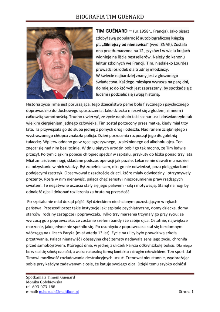 BIOGRAFIA TIM GUENARD TIM GUÉNARD – (ur.1958r., Francja). Jako pisarz zdobył swą popularność autobiograficzną książką pt. „Silniejszy od nienawiści” (wyd. ZNAK). Została ona przetłumaczona na 12 języków i w wielu krajach widnieje na liście bestsellerów. Należy do kanonu lektur szkolnych we Francji. Tim, niedaleko Lourdes prowadzi ośrodek dla trudnej młodzieży. W świecie najbardziej znany jest z głoszonego świadectwa. Każdego miesiąca wyrusza na parę dni, do miejsc do których jest zapraszany, by spotkać się z ludźmi i podzielić się swoją historią. Historia życia Tima jest poruszająca. Jego dzieciństwo pełne bólu fizycznego i psychicznego doprowadziło do duchowego spustoszenia. Jako dziecko mierzył się z głodem, zimnem i całkowitą samotnością. Trudno uwierzyć, że życie napisało taki scenariusz i doświadczyło tak wielkim cierpieniem jednego człowieka. Tim został porzucony przez matkę, kiedy miał trzy lata. Ta przywiązała go do słupa jednej z polnych dróg i odeszła. Nad ranem zziębniętego i wystraszonego chłopca znalazła policja. Dzień porzucenia rozpoczął jego długoletnią tułaczkę. Wpierw oddano go w ręce agresywnego, uzależnionego od alkoholu ojca. Ten znęcał się nad nim bezlitośnie. W dniu piątych urodzin pobił go tak mocno, że Tim ledwie przeżył. Po tym ciężkim pobiciu chłopiec spędził w szpitalu, przykuty do łóżka ponad trzy lata. Miał zmiażdżone nogi, składane podczas operacji jak puzzle. Lekarze nie dawali mu nadziei na odzyskanie w nich władzy. Był zupełnie sam, nikt go nie odwiedzał, poza pielęgniarkami podającymi zastrzyk. Obserwował z zazdrością dzieci, które miały odwiedziny i otrzymywały prezenty. Rosła w nim nienawiść, paląca chęć zemsty i niezrozumienie praw rządzących światem. Te negatywne uczucia stały się jego paliwem - siłą i motywacją. Stanął na nogi by odnaleźć ojca i dokonać rozliczenia za brutalną przeszłość. Po szpitalu nie miał dokąd pójść. Był dzieckiem niechcianym pozostającym w rękach państwa. Przeszedł przez takie instytucje jak: szpitale psychiatryczne, domy dziecka, domy starców, rodziny zastępcze i poprawczaki. Tylko trzy marzenia trzymały go przy życiu: że wyrzucą go z poprawczaka, że zostanie szefem bandy i że zabije ojca. Ostatnie, największe marzenie, jako jedyne nie spełniło się. Po usunięciu z poprawczaka stał się bezdomnym włóczęgą na ulicach Paryża (miał wtedy 13 lat). Życie na ulicy było prawdziwą szkołą przetrwania. Paląca nienawiść i obsesyjna chęć zemsty nadawała sens jego życiu, chroniła przed samobójstwem. Któregoś dnia, w jednej z uliczek Paryża odkrył szkołę boksu. Dla niego boks stał się szkołą czułości, a walka naturalną formą kontaktu z drugim człowiekiem. Ten sport dał Timowi możliwość rozładowania destrukcyjnych uczuć. Trenował nieustannie, wyobrażając sobie przy każdym zadawanym ciosie, że katuje swojego ojca. Dzięki temu szybko odniósł Spotkania z Timem Guenard Monika Gołębiewska tel. 693-073-188 e-mail: [email protected] Strona 1 BIOGRAFIA TIM GUENARD sukces – został mistrzem Francji w boksie. Wzrosła jego popularność w środowisku przestępczym, więc miał utorowaną drogę do spełnienia swojego drugiego marzenia – zostania szefem gangu. Uciekł w przemoc i hulaszcze życie. Pod tą maską twardziela kryła się ogromna tęsknota za miłością, rodziną i dobrym życiem. Wola życia i nie gasnąca nadzieja spowodowała, że zaczął przyciągać do siebie ludzi o dobrym sercu. Te wyjątkowe spotkania, pomału sprowadziły go na właściwą drogę. Jego przebudzenie i proces wewnętrznej przemiany nabrał rozpędu wraz z zaprzyjaźnieniem się z o.Thomasem Philippe (współzałożycielem wspólnoty L’arche). W L’arche Tim nawiązał kontakt i podejmował się opieki nad osobami niepełnosprawnymi. Skruszał i padł na kolana w swoim sercu. W końcu odnalazł bezwarunkową akceptację i miłość, poczuł się potrzebny. Miłość przezwyciężyła nienawiść. Przebaczenie rodzicom (przede wszystkim ojcu) wyzwoliło go i otworzyło drogę do szczęśliwego i spełnionego życia. Tim jest teraz osobą głęboko wierzącą. Jest chrześcijaninem, pozostającym przyjacielem wielu religii. Miłuje różnorodność, sam siebie określa „globtroterem różnic”. Obecnie Tim Guénard mieszka w Pirenejach, niedaleko Lourdes, w pięknym domu położonym na górskim zboczu. Posiada kochającą rodzinę – żonę, czworo dzieci oraz wnuki. Zajmuje się pszczelarstwem, prowadzeniem gospodarstwa i resocjalizacją młodzieży. Wybudował kilka domów by móc dawać dach nad głową i szansę powrotu do życia podobnym do siebie, z takim samym „startem”. Jest często zapraszany w różne zakątki świata, aby opowiedzieć historię swojego życia. Jest wdzięczny za każde doświadczenie, które miało miejsce w jego życiu, gdyż doprowadziło go do tego, co ma dzisiaj – WIELKIEGO SZCZĘŚCIA I MIŁOŚCI. Głoszone przez niego świadectwo ma moc odmieniania ludzkiego życia. Spotkania z Timem Guenard Monika Gołębiewska tel. 693-073-188 e-mail: [email protected] Strona 2