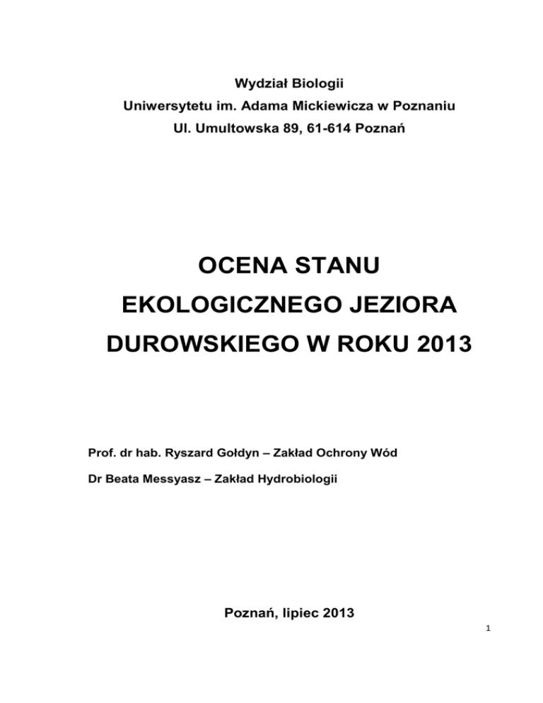 Wydział Biologii Uniwersytetu im. Adama Mickiewicza w Poznaniu Ul. Umultowska 89, 61-614 Poznań OCENA STANU EKOLOGICZNEGO JEZIORA DUROWSKIEGO W ROKU 2013 Prof. dr hab. Ryszard Gołdyn – Zakład Ochrony Wód Dr Beata Messyasz – Zakład Hydrobiologii Poznań, lipiec 2013 1 Treść opracowania Str. 1. Podstawy opracowania 3 2. Stan ekologiczny jeziora w trakcie rekultywacji - fizyko- 5 chemiczne właściwości wody w Jeziorze Durowskim 3. Stan ekologiczny Jeziora Durowskiego w oparciu o glony 32 4. Makrofity jako wskaźnik stanu ekologicznego określonego 79 podczas rekultywacji Jeziora Durowskiego 5. Badania makrobezkręgowców. stan ekologiczny Jeziora Durowskiego podczas procesu jego rekultywacji 96 6. Zbiorowiska ryb jako wskaźnik stanu ekologicznego Jeziora 120 Durowskiego 7. Stan ekologiczny jeziora podczas jego rekultywacji – 137 „Zarządzanie Jeziorem” 8. Podsumowanie 160 2 1. Podstawy opracowania Podstawą opracowania jest umowa zawarta z Gminą Miejską Wągrowiec nr 17/2013DNiPK/UAM z maja 2013 roku (OR.2151.15.2013). Na jej podstawie dokonano opracowania wyników badań fizyczno-chemicznych i biologicznych jeziora Durowskiego, przeprowadzonych w pierwszej połowie lipca 2013 roku. Celem niniejszego opracowania jest ocena stanu ekologicznego ekosystemu Jeziora Durowskiego. Wymagania Ramowej Dyrektywy Wodnej w zakresie oceny stanu ekologicznego ekosystemu jeziornego uwzględniają obok parametrów fizyczno-chemicznych jakości wód takŜe parametry biologiczne: makrofity, fitoplankton, fitobentos (peryfiton), makrozoobentos oraz ryby. KaŜdy parametr biologiczny rozpatrywany jest pod względem struktury gatunkowej zbiorowiska (bogactwo, róŜnorodność), jego liczebności i udziału gatunków wskaźnikowych. Ocena ostateczna obejmuje klasyfikację tych wskaźników jako średnią kilku matriksów i przyporządkowanie uzyskanej punktacji do skali 5 klas stanu ekologicznego wód. Badania na jeziorze Durowskim prowadzono od 30 czerwca do 6 lipca 2013 roku. W cyklu dobowym wykonano pomiary parametrów fizyczno-chemicznych wody (przezroczystość wody, temperatura wody, przewodnictwo elektrolityczne, pH, TDS, % nasycenia wody tlenem, stęŜenie tlenu rozpuszczonego w wodzie) w profilu pionowym co 1 m na 4 stanowiskach o głębokości nie mniejszej niŜ 10 m. W celu określenie stęŜenia pierwiastków biogennych (N, P) pobrano próby wody do analiz laboratoryjnych. Równolegle na tych samych stanowiskach pobrano próby do analiz koncentracji chlorofilu-a w warstwie powierzchniowej (głębokość 0m) i próby wody do analiz fitoplanktonu. Zbiorowisko fitoplanktonu analizowano pod względem struktury gatunkowej, liczebności i biomasy oraz udziału frakcji sinic w zbiorowisku glonów. Te same badania przeprowadzono na dopływie i odpływie Strugi Gołanieckiej oraz w płytkim basenie północnej części jeziora. Badania strefy litoralu obejmowały fitobentos (peryfiton), hydromakrofity oraz ryby. Polska metoda makrofitowa (dla jezior) oparta jest na systemie oceny opracowanym w latach 80-ych przez Prof. M. Rejewskiego z UMK w Toruniu, a następnie modyfikowanym przez dr H. Ciecierską z Uniwersytetu Warmińsko-Mazurskiego w Olsztynie. W trakcie badań uwzględniono wszystkie elementy waŜne do oceny stanu ekologicznego jeziora Durowskiego: liczbę taksonów, ich zbiorowisk, maksymalny zasięg i głębokość ich występowania, ocena obfitości (skala obfitości, % powierzchni fitolitoralu, długość 3 porośniętej linii brzegowej) oraz gatunki referencyjne czy wskaźnikowe dla degradacji. Badano takŜe fitobentos (peryfiton) jako waŜny element biologiczny w ocenie stanu ekologicznego jeziora Durowskiego. W przypadku fitobentosu obliczono indeks okrzemkowy dla 8 stanowisk rozmieszczonych wzdłuŜ linii brzegowej jeziora. Ocena stanu ekologicznego jeziora Durowskiego oparta była takŜe na wynikach badań zbiorowisk makrozoobentosu zarówno w strefie pelagialu jak i litoralu. Analizowano bogactwo i róŜnorodność tej grupy organizmów (całkowita liczba rodzin, liczba rodzin EPT, indeks Shannona-Weavera), jej obfitość i liczebność oraz tolerancję na degradację. Wyniki uzyskane w trakcie przeprowadzonych w lipcu 2013 roku badań porównano przy wszystkich analizowanych parametrach biologicznych z wynikami z roku 2010, 2011 i 2012, kiedy jezioro Durowskie poddane było pierwszemu etapowi rekultywacji. Podjęto takŜe próbę ustalenia praktycznych rozwiązań w celu określenia warunków uzyskania zrównowaŜonego rozwoju jeziora i jego zlewni (rozdział 7). Układ niniejszego opracowania obejmuje ocenę stanu ekologicznego jeziora Durowskiego na podstawie kolejnych parametrów fizyczno-chemicznych i biologicznych. 4 STAN EKOLOGICZNY JEZIORA W TRAKCIE REKULTYWACJI Fizyko-chemiczne właściwości wody w Jeziorze Durowskim Zespół badawczy CzyŜ Magdalena (1) Damptey Gyasi Frederick (2) Frankiewicz Monika (1) Melenciuc Raluca (3) Popescul Ovidiu Alexandru (3) Supervisor: Dr.Wu Naicheng (2) 1. UAM 2. CAU 3. UAIC 5 Wstęp Biorąc pod uwagę całą powierzchnię Ziemi, 71% jest zajmowane przez wodę, a tylko 2,75% z tej ilości stanowią wody słodkie. Wody słodkie są esencją ludzkiego Ŝycia, a takŜe wielu naturalnych systemów, które umoŜliwiają człowiekowi przetrwanie. WciąŜ rozszerzająca się działalność człowieka w takich sektorach jak przemysł, rolnictwo, turystyka, rekreacja w znacznym stopniu zmieniają zasoby naszej planet w wodę, poprzez modyfikację jej fizycznych, chemicznych i biologicznych właściwości Jezioro Durowskie jest jeziorem polodowcowym o wydłuŜonym kształcie, leŜące na terenie Pojezierza Chodzieskiego, w okolicy Wągrowca (Centralna Polska). Powierzchnia jeziora zajmuje 143 ha i stanowi waŜną część wągrowieckiego krajobrazu (tabela 1). Jest to lokalny ekosystem uŜywany do wędkarstwa, turystyki, rekreacji, edukacji i badań. Przez jezioro dopływa rzeka Struga Gołaniecka, która ciągle dostarcza mu biogenów z te