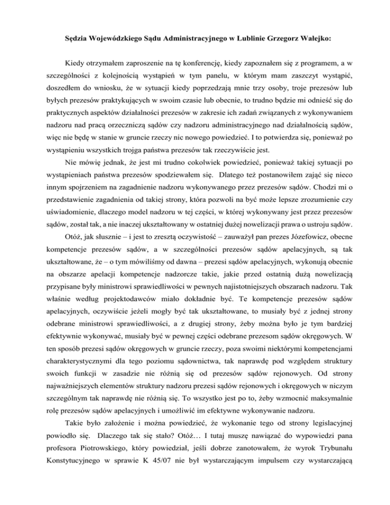 Sędzia Wojewódzkiego Sądu Administracyjnego w Lublinie Grzegorz Wałejko: Kiedy otrzymałem zaproszenie na tę konferencję, kiedy zapoznałem się z programem, a w szczególności z kolejnością wystąpień w tym panelu, w którym mam zaszczyt wystąpić, doszedłem do wniosku, że w sytuacji kiedy poprzedzają mnie trzy osoby, troje prezesów lub byłych prezesów praktykujących w swoim czasie lub obecnie, to trudno będzie mi odnieść się do praktycznych aspektów działalności prezesów w zakresie ich zadań związanych z wykonywaniem nadzoru nad pracą orzeczniczą sądów czy nadzoru administracyjnego nad działalnością sądów, więc nie będę w stanie w gruncie rzeczy nic nowego powiedzieć. I to potwierdza się, ponieważ po wystąpieniu wszystkich trojga państwa prezesów tak rzeczywiście jest. Nie mówię jednak, że jest mi trudno cokolwiek powiedzieć, ponieważ takiej sytuacji po wystąpieniach państwa prezesów spodziewałem się. Dlatego też postanowiłem zająć się nieco innym spojrzeniem na zagadnienie nadzoru wykonywanego przez prezesów sądów. Chodzi mi o przedstawienie zagadnienia od takiej strony, która pozwoli na być może lepsze zrozumienie czy uświadomienie, dlaczego model nadzoru w tej części, w której wykonywany jest przez prezesów sądów, został tak, a nie inaczej ukształtowany w ostatniej dużej nowelizacji prawa o ustroju sądów. Otóż, jak słusznie – i jest to zresztą oczywistość – zauważył pan prezes Józefowicz, obecne kompetencje prezesów sądów, a w szczególności prezesów sądów apelacyjnych, są tak ukształtowane, że – o tym mówiliśmy od dawna – prezesi sądów apelacyjnych, wykonują obecnie na obszarze apelacji kompetencje nadzorcze takie, jakie przed ostatnią dużą nowelizacją przypisane były ministrowi sprawiedliwości w pewnych najistotniejszych obszarach nadzoru. Tak właśnie według projektodawców miało dokładnie być. Te kompetencje prezesów sądów apelacyjnych, oczywiście jeżeli mogły być tak ukształtowane, to musiały być z jednej strony odebrane ministrowi sprawiedliwości, a z drugiej strony, żeby można było je tym bardziej efektywnie wykonywać, musiały być w pewnej części odebrane prezesom sądów okręgowych. W ten sposób prezesi sądów okręgowych w gruncie rzeczy, poza swoimi niektórymi kompetencjami charakterystycznymi dla tego poziomu sądownictwa, tak naprawdę pod względem struktury swoich funkcji w zasadzie nie różnią się od prezesów sądów rejonowych. Od strony najważniejszych elementów struktury nadzoru prezesi sądów rejonowych i okręgowych w niczym szczególnym tak naprawdę nie różnią się. To wszystko jest po to, żeby wzmocnić maksymalnie rolę prezesów sądów apelacyjnych i umożliwić im efektywne wykonywanie nadzoru. Takie było założenie i można powiedzieć, że wykonanie tego od strony legislacyjnej powiodło się. Dlaczego tak się stało? Otóż… I tutaj muszę nawiązać do wypowiedzi pana profesora Piotrowskiego, który powiedział, jeśli dobrze zanotowałem, że wyrok Trybunału Konstytucyjnego w sprawie K 45/07 nie był wystarczającym impulsem czy wystarczającą inspiracją dla ustawodawcy. Nie mogę się z tym zgodzić, dlatego że akurat tak się złożyło, że wyrok został wydany w początkowym okresie pracy nad projektem dużej zmiany ustawy o ustroju sądów powszechnych i wyrok ten musiał być odczytywany w czasie tych prac, musiał być uwzględniony i musiały być z niego wyciągnięte wnioski. To, że wyrok potwierdził konstytucyjną legalność modelu nadzoru wcale nie oznaczało, że ta legalność jest dana na zawsze. I w związku z tym nieco inne było stanowisko projektodawców w czasie prac nad projektem ustawy niż te, które tutaj zaprezentował pan sędzia Niemcewicz, który wykazał, wynikającą ze swoich praktycznych doświadczeń, niewiarę w zdolność do zmiany stanowiska Trybunału Konstytucyjnego. Przeciwnie, właśnie… (Dr Ryszard Piotrowski: Panie Sędzio, to jest nieporozumienie. Ja mówiłem, że ustawodawca nie uwzględnił wyroku Trybunału, który powiedział: rób co chcesz, nie musisz trwać przy tym bezsensownym nadzorze. I gdyby ustawodawca był chciał, to by zrobił, co trzeba. Ale nie chciał, ponieważ nie czyta dokładnie uzasadnień i projektodawcy dokładnie uzasadnień nie czytają, a co najważniejsze nie chciał, bo mu to jest wygodne. Chcę, żeby był, oprócz korpusu urzędników, jeszcze korpus sędziów. To wszystko.) Tym niemniej ten wyrok stał się jednak inspiracją i impulsem do podjęcia prac nad takim właśnie ukształtowaniem nowego modelu nadzoru. (Dr Ryszard Piotrowski: Tak.) Tak, co do tego … cieszę się, że pan profesor w tej sytuacji zgadza się ze mną. (Wypowiedź poza mikrofonem) (Wesołość na sali) I teraz co do tego kierunku inspiracji. Jeżeli dobrze wczytać się w uzasadnienie orzeczenia Trybunału Konstytucyjnego to cóż się okazuje? Okazuje się, że tak naprawdę Trybunał dostrzegał, że w poprzedni model nadzoru wpisane jest pewne potencjalne niebezpieczeństwo przekraczania granicy kompetencji przez ministra sprawiedliwości, w taki sposób, że można byłoby stwierdzić, że te kompetencje mogą naruszyć niezawisłość sędziowską albo niezależność sądów. Stwierdził jednocześnie, że praktyka jest tak ukształtowana, że to się nie dzieje, że są pewne instrumenty, które pozwalają na wykonanie tego nadzoru w sposób konstytucyjny. I tutaj właśnie Trybunał miał na myśli między innymi także instytucję delegowania sędziów do Ministerstwa Sprawiedliwości. No, ale w związku z tym można było stwierdzić, że w ten sposób w model nadzoru poprzednio obowiązujący była wpisana pewna pokusa prowadząca do sięgnięcia do takich instrumentów, które będą w tę niezawisłość sędziowską wkraczały. I właśnie po to, żeby na przyszłość wyeliminować możliwość takiej pokusy, a wła
