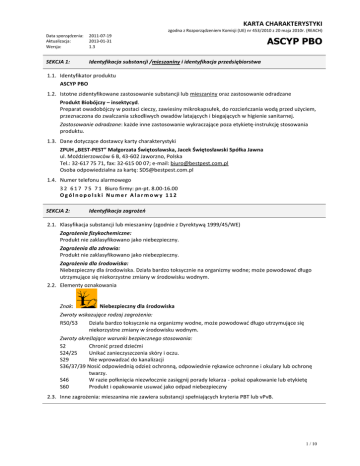 KARTA CHARAKTERYSTYKI zgodna z Rozporządzeniem Komisji (UE) nr 453/2010 z 20 maja 2010r. (REACH) Data sporządzenia: Aktualizacja: Wersja: 2011-07-19 2013-01-31 1.3 SEKCJA 1: Identyfikacja substancji /mieszaniny i identyfikacja przedsiębiorstwa ASCYP PBO 1.1. Identyfikator produktu ASCYP PBO 1.2. Istotne zidentyfikowane zastosowanie substancji lub mieszaniny oraz zastosowanie odradzane Produkt Biobójczy – insektycyd. Preparat owadobójczy w postaci cieczy, zawiesiny mikrokapsułek, do rozcieńczania wodą przed użyciem, przeznaczona do zwalczania szkodliwych owadów latających i biegających w higienie sanitarnej. Zastosowanie odradzane: każde inne zastosowanie wykraczające poza etykietę-instrukcję stosowania produktu. 1.3. Dane dotyczące dostawcy karty charakterystyki ZPUH „BEST-PEST” Małgorzata Świętosławska, Jacek Świętosławski Spółka Jawna ul. Moździerzowców 6 B, 43-602 Jaworzno, Polska Tel.: 32-617 75 71, fax: 32-615 00 07; e-mail: [email protected] Osoba odpowiedzialna za kartę: [email protected] 1.4. Numer telefonu alarmowego 3 2 6 1 7 7 5 7 1 Biuro firmy: pn-pt. 8.00-16.00 Ogólnopolski Numer Alarmowy 112 SEKCJA 2: Identyfikacja zagrożeń 2.1. Klasyfikacja substancji lub mieszaniny (zgodnie z Dyrektywą 1999/45/WE) Zagrożenia fizykochemiczne: Produkt nie zaklasyfikowano jako niebezpieczny. Zagrożenia dla zdrowia: Produkt nie zaklasyfikowano jako niebezpieczny. Zagrożenia dla środowiska: Niebezpieczny dla środowiska. Działa bardzo toksycznie na organizmy wodne; może powodować długo utrzymujące się niekorzystne zmiany w środowisku wodnym. 2.2. Elementy oznakowania Znak: Niebezpieczny dla środowiska Zwroty wskazujące rodzaj zagrożenia: R50/53 Działa bardzo toksycznie na organizmy wodne, może powodować długo utrzymujące się niekorzystne zmiany w środowisku wodnym. Zwroty określające warunki bezpiecznego stosowania: S2 Chronić przed dziećmi S24/25 Unikać zanieczyszczenia skóry i oczu. S29 Nie wprowadzać do kanalizacji S36/37/39 Nosić odpowiednią odzież ochronną, odpowiednie rękawice ochronne i okulary lub ochronę twarzy. S46 W razie połknięcia niezwłocznie zasięgnij porady lekarza - pokaż opakowanie lub etykietę S60 Produkt i opakowanie usuwać jako odpad niebezpieczny 2.3. Inne zagrożenia: mieszanina nie zawiera substancji spełniających kryteria PBT lub vPvB. 1 / 10 KARTA CHARAKTERYSTYKI zgodna z Rozporządzeniem Komisji (UE) nr 453/2010 z 20 maja 2010r. (REACH) Data sporządzenia: Aktualizacja: Wersja: 2011-07-19 2013-01-31 1.3 SEKCJA 3: Skład/informacja o składnikach ASCYP PBO 3.2. Mieszaniny Składniki niebezpieczne obecne w mieszaninie: Nazwa: cypermetryna w postaci mikrokapsułek [cypermethrin cis/trans +/- 40/60] 3(2,2-dichlorowinylo)-2,2-dimetylocyklopropanokarboksylan.alfa.-cyjano-3-fenokybenzylu Zawartość: Nr WE: Nr CAS: Annex I Index 50 g/l [ok. 5 % wag.] 257-842-9 52315-07-8 607-421-00-4 Klasyfikacja zgodnie z Dyrektywą 67/548/EWG z poprawkami: Xn R20/22; Xi R37; N R50-53 Klasyfikacja zgodnie z Rozporządzeniem 1272/2008/WE: Acute Tox. 4 H302 H332; STOT SE 3 H335; Nazwa: Aquatic Acute 1 H400, Aqutic Chronic 1 H410 butoksylan piperonylu eter 2-(2-butoksyetoksy)etylo-6-propylpiperonylowy/ butotlenek piperonylu/ PBO Zawartość: Nr WE: Nr CAS: Annex I Index 150 g/l [ok. 15 % wag.] 200-076-7 51-03-6 numeru nie nadano Klasyfikacja zgodnie z Dyrektywą 67/548/EWG z poprawkami: N R50-53 Klasyfikacja zgodnie z Rozporządzeniem 1272/2008/WE: Aquatic Acute 1 H400, Aqutic Chronic 1 H410 Odniesienia do innych sekcji: pełne brzmienie zwrotów znajduje się w sekcji 16 karty. SEKCJA 4: Środki pierwszej pomocy 4.1. Opis środków pierwszej pomocy Po spożyciu Wypłukać usta wodą, o ile poszkodowany jest przytomny. Wezwać natychmiast lekarza Skażenie oka Przemywać płynem do przemywania oczu lub czystą wodą, utrzymując powieki otwarte, przez co najmniej 15 minut. Skonsultować się z lekarzem. Skażenie skóry Zdjąć natychmiast skażoną odzież. Obmyć skórę wodą, a następnie wodą i mydłem. Narażenie inhalacyjne Wyprowadzić poszkodowanego z zasięgu narażenia, zapewnić mu dostęp świeżego powietrza i spoczynek. Indywidualne wyposażenie ochronne dla osób udzielających pierwszej pomocy nie jest wymagane. 4.2. Najważniejsze ostre i opóźnione objawy oraz skutki narażenia narażenie wziewne: kaszel, katar, objawy astmatyczne i inne objawy nadwrażliwości, duszność, po połknięciu: wzmożone wydzielanie śliny, nudności, wymioty, biegunka, skóra: podrażnienie, zaczerwienienie, obrzęk i odczyny uczuleniowe. 2 / 10 KARTA CHARAKTERYSTYKI zgodna z Rozporządzeniem Komisji (UE) nr 453/2010 z 20 maja 2010r. (REACH) Data sporządzenia: Aktualizacja: Wersja: 2011-07-19 2013-01-31 1.3 ASCYP PBO 4.3. Wskazania dotyczące wszelkiej natychmiastowej pomocy lekarskiej i szczególnego postępowania z poszkodowanym Cypermetryna należy do toksyn kanałów sodowych, powoduje obniżenie progu pobudzenia nerwów czuciowych i przedłużone pobudzenie neuronalne. Antidotum - brak. Stosować leczenie objawowe. Centra Informacji Toksykologicznej Warszawa 22 619 66 54 Gdańsk 58 682 04 04 Łódź 42 631 47 25 Poznań 61 847 69 46 SEKCJA 5: Kraków 12 411 99 99 Postępowanie w przypadku pożaru Zalecenia ogólne Usunąć z zagrożonego obszaru osoby niepowołane, niebiorące udziału w likwidowaniu pożaru. Usunąć źródła zapłonu, nie palić. W razie potrzeby wezwać Straż Pożarną tel. 998. Nie dopuszczać do przedostania się substancji do kanalizacji, zbiorników i cieków wodnych. 5.1. Środki gaśnicze Właściwe środki gaśnicze Gaśnice pianowe, śniegowe (CO2), proszkowe lub mgła wodna Niewłaściwe środki gaśnicze Nie stosować wody w formie silnego strumienia wodnego. Spływającą wodę ograniczać, np. tymczasową barierą ziemną. 5.2. Szczególe zagrożenia związane z substancja lub mieszaniną W wyniku pożaru mogą powstawać toksyczne gazy i opary: tlenki węgla(CO, CO2), tl