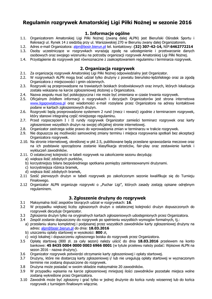 Regulamin rozgrywek Amatorskiej Ligi Piłki Nożnej w sezonie 2016 1. Informacje ogólne 1.1. 1.2. 1.3. 1.4. Organizatorem Amatorskiej Ligi Piłki Nożnej (zwaną dalej ALPN) jest Bieruński Ośrodek Sportu i Rekreacji ul. Rynek 14 z siedzibą przy ul. Warszawskiej 270 w Bieruniu zwany dalej Organizatorem. Adres e-mail Organizatora: [email protected] tel. kontaktowy: (32) 307-42-14, NIP:6462772214 Osoby uczestniczące w rozgrywkach wyrażają zgodę na udostępnienie i przetwarzanie danych osobowych oraz swojego wizerunku na potrzeby organizacji rozgrywek Amatorskiej Ligi Piłki Nożnej. Przystąpienie do rozgrywek jest równoznaczne z zaakceptowaniem regulaminu i terminarza rozgrywek. 2. Organizacja rozgrywek 2.1. 2.2. 2.3. 2.4. 2.5. 2.6. 2.7. 2.8. 2.9. 2.10. 2.11. a) b) c) d) 2.11 2.12 Za organizację rozgrywek Amatorskiej Ligi Piłki Nożnej odpowiedzialny jest Organizator. W rozgrywkach ALPN mogą brać udział tylko drużyny z powiatu bieruńsko-lędzińskiego oraz za zgodą Organizatora z miejscowości i gmin ościennych. Rozgrywki są przeprowadzane na trawiastych boiskach środowiskowych oraz innych, których lokalizacja została wskazana na karcie zgłoszeniowej złożonej u Organizatora. Nazwa zespołu musi być polskojęzyczna i nie może być zmieniana w czasie trwania rozgrywek. Oficjalnym źródłem informacji o rozgrywkach i decyzjach Organizatorów jest strona internetowa www.ligapowiatowa.pl oraz wiadomości e-mail rozsyłane przez Organizatora na adresy kontaktowe podane w kartach zgłoszeniowych drużyn. Rozgrywki będą przeprowadzone systemem 2 rund (mecz i rewanż) zgodnie z terminarzem rozgrywek, który stanowi integralną część niniejszego regulaminu. Przed rozpoczęciem I i II rundy rozgrywek Organizator zamieści terminarz rozgrywek oraz karty zgłoszeniowe wszystkich drużyn na swojej oficjalnej stronie internetowej. Organizator zastrzega sobie prawo do wprowadzania zmian w terminarzu w trakcie rozgrywek. Nie dopuszcza się możliwości samowolnej zmiany terminu i miejsca rozgrywania spotkań bez akceptacji Organizatora rozgrywek. Na stronie internetowej, określonej w pkt 2.5, publikowane będą przesłane sprawozdania meczowe oraz na ich podstawie sporządzona zostanie klasyfikacja strzelców, fair-play oraz zestawienie kartek i wykluczeń zawodników. O ostatecznej kolejności w tabeli rozgrywek na zakończenie sezonu decydują: większa ilość zdobytych punktów, korzystniejszy bilans bezpośredniego spotkania pomiędzy zainteresowanymi drużynami. korzystniejsza różnica bramek, większa ilość zdobytych bramek, Sześć pierwszych drużyn w tabeli rozgrywek po zakończonym sezonie kwalifikuje się do Turnieju Finałowego. Organizator ALPN organizuje rozgrywki o „Puchar Ligi”, których zasady zostają opisane odrębnym regulaminem. 3. Zgłoszenie drużyny do rozgrywek 3.1 3.2 3.3 3.4 a) b) c) 3.5 3.6 3.7 3.8 3.9 3.10 Maksymalna ilość zespołów biorących udział w rozgrywkach: 16. W przypadku większej liczby zgłoszonych drużyn o ostatecznej kolejności drużyn dopuszczonych do rozgrywek decyduje Organizator. Zgłoszenia drużyn tylko na oryginalnych kartach zgłoszeniowych udostępnionych przez Organizatora. Zespół zostanie dopuszczony do rozgrywek po spełnieniu wszystkich wymogów formalnych, tj.: przesłaniu skanu kompletnej i podpisanej przez wszystkich zawodników karty zgłoszeniowej drużyny na adres: [email protected] do dnia: 18.03.2016 uiszczeniu opłaty startowej w wysokości: 800 zł, wizji lokalnej i dopuszczeniu zgłoszonego boiska do rozgrywek przez Organizatora. Opłatę startową (800 zł. za cały sezon) należy uiścić do dnia 18.03.2016 przelewem na konto bankowe: 45 8435 0004 0000 0003 6966 0001 (w tytule przelewu należy podać: Wpisowe ALPN na sezon 2016 - nazwa drużyny). Organizator rozgrywek potwierdzi otrzymanie karty zgłoszeniowej i opłaty startowej. Drużyny, które nie dostarczą karty zgłoszeniowej i/ lub nie uregulują opłaty startowej w wyznaczonym terminie nie zostaną dopuszczone do rozgrywek. Drużyna może posiadać w swoim składzie maksymalnie 20 zawodników. W przypadku wpisania na karcie zgłoszeniowej mniejszej ilości zawodników pozostałe miejsca wolne zostaną wykreślone przez Organizatora. Zawodnik może być zgłoszony i grać tylko w jednej drużynie do końca rundy wiosennej lub do końca rozgrywek z turniejem finałowym włącznie. 3.11 W czasie trwania I rundy spotkań nie można dokonywać żadnych zmian w składzie drużyny. 3.12 Przed rozpoczęciem II rundy spotkań Organizator zezwala na wprowadzenie maksymalnie 5 zmian zawodników w poprzednio zgłoszonej liście (do limitu 20 zawodników). 3.13 Termin przesłania skanu kompletnej i podpisanej przez wszystkich zawodników listy zgłoszeniowej drużyny na rundę rewanżową rozgrywek określi Organizator w trakcie trwania rundy wiosennej. 3.14 Wprowadza się limit wieku dla osób uczestniczących w rozgrywkach - ukończony 17 rok życia. 3.15 Osoby niepełnoletnie biorą udział w rozgrywkach po dostarczeniu do Organizatorów oświadczenia następującej treści: Bieruń, dnia........................ Oświadczenie Niniejszym oświadczam, że ogólny stan zdrowia mojego syna pozwala, aby mógł wziąć udział w rozgrywkach Amatorskiej Ligi Piłki Nożnej organizowanych przez Bieruński Ośrodek Sportu i Rekreacji w 2016 roku. Jednocześnie wyrażam zgodę na udział dziecka w w/w rozgrywkach. imię i nazwisko zawodnika: .................................... podpis rodzica/opiekuna .............................. 4. Zasady gry 4.1 4.2 4.3 4.4 4.5 4.6 4.7 4.8 4.9 4.10 4.11 4.12 4.13 4.14 a) b) c) Czas gry: 2 x 40 minut, czas przerwy w meczu: 10 minut. Liczba zawodników w grze: 7 + 1 (bramkarz). Nie obowiązuje przepis o „spalonym”. Maksymalny dopuszczalny wymiar boiska: 75m długości, 55m szerokości. Zespół ma być gotowy do gry o wyznaczonej godzinie, przewidzianej terminarzem rozgrywek. Czas oczekiwania na drużynę wynos