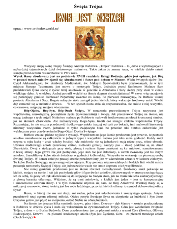 Święta Trójca ◄ oprac.: www.orthodoxworld.ru/ Wszyscy znają ikonę Trójcy Świętej Andreja Rublowa. „Trójca” Rublowa – to jedno z wybitniejszych i najbardziej tajemniczych dzieł światowego malarstwa. Takie jakim je znamy teraz, to wielkie dzieło sztuki stanęło przed oczami restauratorów w 1919 roku. Wątek ikony zbudowany jest na podstawie XVIII rozdziału Księgi Rodzaju, gdzie jest opisane, jak Bóg w postaci trzech aniołów zjawił się Abrahamowi i Sarze pod dębem w Mamre. Wielu świętych ojców (św. Cyryl Aleksandryjski, św. Ambroży Mediolański, św. Maksym Spowiednik) było przekonanych, że w tym miejscu Starego Testamentu jest mowa o prototypie Trójcy. Jednakże przed Rublowem Malarze ikon przedstawiali tylko scenę z życia: trzej aniołowie w gościnie u Abrahama i Sary siedzą przy stole w cieniu wielkiego dębu. A wielebny Andrej potrafił wcielić na ikonie dogmat chrześcijaństwa! W czym więc przejawia się porażający geniusz Rublowa? Popatrzmy uważnie na ikonę. Po pierwsze zauważymy, że Rublow usunął postacie Abrahama i Sary. Bogate nakrycie stołu zastąpił jeden kielich, który wskazuje środkowy anioł. Wielki dąb zamienił się w malutkie drzewo. W ten sposób ikona stała się rozpoznawalna, ale znikło z niej wszystko, co czasowe, ustępując miejsca wiecznemu. Bóg-Ojciec, Bóg-Syn, Bóg-Duch Święty. W nauczaniu prawosławnym Trójca nazywana jest współistotną, nierozłączną, początkiem życia (żywonaczalnij) i świętą. Jak przedstawić Trójcę na ikonie, nie tracąc żadnego z tych pojęć? Niektórzy malarze po Rublowie malowali środkowemu aniołowi krestczatyj nimbus, jak na ikonach Zbawiciela. Ale zaznaczywszy Boga-Syna, tracili coś innego: znikała współistotna Trójcy. Rozumiejąc, że nie można przedstawić środkowego anioła inaczej od tych po bokach, inni malowali ktrstcztyje nimbusy wszystkim trzem, jednakże to tylko zwiększyło błąd, bo przecież taki nimbus całkowicie jest wykluczony przy przedstawianiu Boga-Ojca i Ducha Świętego. Rublow znalazł piękne wyjście z sytuacji. Współistota na jego ikonie przekazana jest przez to, że postacie aniołów namalowane są całkowicie w jednym typie i wszystkim nadana jest taka sama godność. Każdy anioł trzyma w ręku laskę – znak władzy boskiej. Ale aniołowie nie są jednakowi: mają różne pozy, różne ubrania. Ubrania środkowego anioła (czerwony chiton, niebieski gimatij, naszyty pas – klaw) podobne są do ubrań Zbawiciela. Dwaj z siedzących przy stole, głową i ruchem figury zwróceni są ku aniołowi, namalowanemu z lewej strony. Jego głowa nie jest pochylona, jego stan nie jest skłoniony, a wzrok zwrócony jest ku innym aniołom. Jasnoliliowy kolor ubrań świadczy o godności królewskiej. Wszystko to wskazuje na pierwszą osobę Świętej Trójcy. W końcu anioł po prawej stronie przedstawiony jest w wierzchnim ubraniu w kolorze zielonym. To kolor Ducha Świętego, nazywanego ożywiającym. Przy pomocy niezauważalnych i lekkich linii wielki mistrz pokazuje nam osoby Świętej Trójcy, ale jednocześnie wcale nie łamie dogmatu o ich współistocie. Nie mniej genialnie przekazana jest na ikonie również nierozłączność. Środkowy anioł pokazuje na kielich, stojący na tronie. I tak jak pochylenie głów i figur dwóch aniołów, skierowanych w stronę trzeciego łączy ich ze sobą, to gesty ich rąk skierowane są do stojącego na białym stole, jak na tronie kielicha eucharystycznego z głową baranka ofiarnego. Widzimy, że są trzej aniołowie, a kielich jest jeden – jest to kompozycyjne i znaczeniowe centrum ikony. I w tym momencie objawia się nam, że trzej Aniołowie Wielkiej Rady są w milczącej rozmowie, której treścią jest los rodu ludzkiego, przecież kielich ofiarny to symbol dobrowolnej ofiary Syna! Ikona, w której nie ma ani akcji, ani ruchu, pełna jest uduchowienia i uroczystego spokoju. Artysta przedstawił tutaj ogrom ofiarnej miłości. Ojciec posyła Swojego Syna na cierpienie za ludzkość i Syn Jezus Chrystus gotów jest pójść na cierpienia, oddać Siebie na ofiarę ludziom. Na ikonie jest jeszcze kilka symboli: drzewo, góra i dom. Drzewo – dąb Mamre – zostało przekształcone u Rublowa w drzewo życia i stało się wskazaniem na żywonaczalnost Trójcy. Góra jest wcieleniem świętości Trójcy, a dom – to Boska Budowla. Dom przedstawiony jest za plecami anioła z rysami Ojca (Stwórca, Główny Budowniczy), Drzewo – za plecami środkowego anioła (Syn jest Życiem), Góra – za plecami trzeciego anioła (Duch Święty) ► online.biblia.pl/ ◄ STARY TESTAMENT Księga Rodzaju Bóg w gościnie u Abrahama1 18 1 Pan ukazał się Abrahamowi pod dębami Mamre, gdy ten siedział u wejścia do namiotu w najgorętszej porze dnia. 2 Abraham spojrzawszy dostrzegł trzech ludzi naprzeciw siebie. Ujrzawszy ich podążył od wejścia do namiotu na ich spotkanie. A oddawszy im pokłon do ziemi, 3 rzekł: «O Panie, jeśli darzysz mnie życzliwością, racz nie omijać Twego sługi! 4 Przyniosę trochę wody, wy zaś raczcie obmyć sobie nogi, a potem odpocznijcie pod>drzewami. 5 Ja zaś pójdę wziąć nieco chleba, abyście się pokrzepili, zanim pójdziecie dalej, skoro przechodzicie koło sługi waszego». A oni mu rzekli: «Uczyń tak, jak powiedziałeś». 6 Abraham poszedł więc spiesznie do namiotu Sary i rzekł: «Prędko zaczyń ciasto z trzech miar najczystszej mąki i zrób podpłomyki». 7 Potem Abraham podążył do trzody i wybrawszy tłuste i piękne cielę, dał je słudze, aby ten szybko je przyrządził. 8 Po czym, wziąwszy twaróg, mleko i przyrządzone cielę, postawił przed nimi, a gdy oni jedli, stał przed nimi pod drzewem. 9 Zapytali go: «Gdzie jest twoja żona, Sara?» - Odpowiedział im: «W tym oto namiocie». 10 Rzekł mu [jeden z nich]: «O tej porze za rok znów wrócę do ciebie, twoja zaś żona Sara będzie miała wtedy syna». Sara przysłuchi