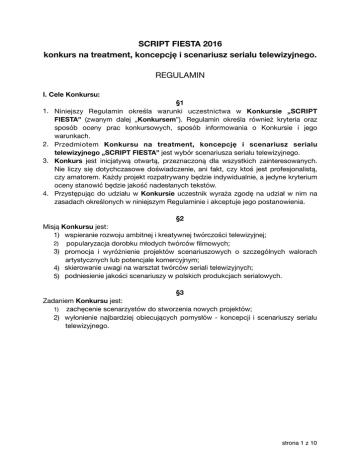 SCRIPT FIESTA 2016 konkurs na treatment, koncepcję i scenariusz serialu telewizyjnego. REGULAMIN I. Cele Konkursu: 1. 2. 3. 4. §1 Niniejszy Regulamin określa warunki uczestnictwa w Konkursie „SCRIPT FIESTA” (zwanym dalej „Konkursem”). Regulamin określa również kryteria oraz sposób oceny prac konkursowych, sposób informowania o Konkursie i jego warunkach. Przedmiotem Konkursu na treatment, koncepcję i scenariusz serialu telewizyjnego „SCRIPT FIESTA” jest wybór scenariusza serialu telewizyjnego. Konkurs jest inicjatywą otwartą, przeznaczoną dla wszystkich zainteresowanych. Nie liczy się dotychczasowe doświadczenie, ani fakt, czy ktoś jest profesjonalistą, czy amatorem. Każdy projekt rozpatrywany będzie indywidualnie, a jedyne kryterium oceny stanowić będzie jakość nadesłanych tekstów. Przystępując do udziału w Konkursie uczestnik wyraża zgodę na udział w nim na zasadach określonych w niniejszym Regulaminie i akceptuje jego postanowienia. §2 Misją Konkursu jest: 1) wspieranie rozwoju ambitnej i kreatywnej twórczości telewizyjnej; 2) popularyzacja dorobku młodych twórców filmowych; 3) promocja i wyróżnienie projektów scenariuszowych o szczególnych walorach artystycznych lub potencjale komercyjnym; 4) skierowanie uwagi na warsztat twórców seriali telewizyjnych; 5) podniesienie jakości scenariuszy w polskich produkcjach serialowych. §3 Zadaniem Konkursu jest: 1) zachęcenie scenarzystów do stworzenia nowych projektów; 2) wyłonienie najbardziej obiecujących pomysłów - koncepcji i scenariuszy serialu telewizyjnego. strona 1 z 10 II. Formuła Konkursu: §4 1. Organizatorami Konkursu są: 1) PAISA FILMS Sp. z o.o. z siedzibą w Warszawie przy ulicy Złotej 77 lok. 30, 00-819 Warszawa, zarejestrowana w Sądzie Rejonowym dla m.st. Warszawy, XIII Wydział Gospodarczy Krajowego Rejestru Sądowego pod numerem: KRS 0000240797; REGON 140215137; NIP 123-106-29-58, 2) Warszawska Szkoła Filmowa - Uczelnia, z siedzibą przy ul. Generała Zajączka, 7, 01-518 Warszawa, NIP: 525-251-78-28, REGON: 145821227, 3) Fundacja Edukacji i Sztuki Filmowej Macieja Ślesickiego i Bogusława Lindy LATERNA MAGICA z siedzibą: 01-518 Warszawa, ul. Generała Zajączka 7, wpisana do Krajowego Rejestru Sądowego przez Sąd Rejonowy dla m. st. Warszawy, XIII Wydział Gospodarczy Krajowego Rejestru Sądowego pod numerem KRS 0000196575, numer NIP: 123-101-38-88, REGON: 015678489; zwani dalej, na potrzeby niniejszego regulaminu, Organizatorami. 2. Sponsorem Nagrody w Konkursie, o której mowa w §35 ust.1 Regulaminu, jest PAISA FILMS Sp. z o.o., zaś Sponsorem Wyróżnienia, o którym mowa w §35 ust. 3 jest POLSAT S.A., zwani dalej, na potrzeby niniejszego Regulaminu, Sponsorem. 3. Partnerem Konkursu jest KIPA - KRAJOWA IZBA PRODUCENTÓW AUDIOWIZUALNYCH, zwany dalej, na potrzeby niniejszego Regulaminu, Partnerem. 4. Konkurs organizowany jest na obszarze Rzeczypospolitej Polskiej, w okresie od dnia 17 grudnia 2015 roku do dnia 8 kwietnia 2016 roku. §5 Wszelkie autorskie prawa majątkowe do formuły i koncepcji artystycznej Konkursu posiadają Organizatorzy. §6 Za całość spraw związanych z przygotowaniem i przebiegiem Konkursu odpowiedzialny jest Koordynator Organizacyjny, powoływany przez Organizatorów i Partnera, posiadający decydujący głos w kwestiach spornych, nieobjętych regulaminem lub wymagających dodatkowych interpretacji. §7 Organizatorzy mogą zaprosić do współudziału w organizacji Konkursu inne jednostki państwowe, społeczne i prywatne, które zamierzają wnieść swój rzeczowy lub finansowy wkład w przygotowanie i realizację Konkursu. §8 W kwestiach nieuregulowanych niniejszym Regulaminem zastosowanie będą miały przepisy kodeksu cywilnego, ustawy o prawie autorskim i prawach pokrewnych oraz inne powszechnie obowiązujące przepisy prawa. strona 2 z 10 III. Zasady uczestnictwa - wstęp §9 Konkurs podzielony jest na 2 etapy: ogólny i finałowy: 1) W I etapie Konkursu każdy Uczestnik może nadesłać dowolną liczbę koncepcji serialu telewizyjnego. 2) Do II etapu Konkursu zostaną zaproszeni wyłącznie zwycięzcy I etapu („Finaliści”) w liczbie od 3 do 10 finalistów. §10 1. Poprzez koncepcję serialu telewizyjnego rozumie się dokument liczący od 5 do 10 stron, sporządzony na przygotowanym przez Organizatorów szablonie, zawierający: 1) tytuł serialu; 2) ogólne założenia serialu telewizyjnego (gatunek, długość odcinka, ilość odcinków w sezonie, zakładana grupa docelowa); 3) opis pomysłu na serial telewizyjny - 3 zdania; 4) zarys głównych postaci - po 500 znaków ze spacjami o każdej z postaci; 5) treatment pierwszego odcinka - maksymalnie 1800 znaków ze spacjami; 6) zarys fabularny pierwszego sezonu - maksymalnie 1800 znaków ze spacjami; 7) trzy kompletne sceny dialogowe z odcinka pilotowego napisane w formacie scenariusza filmowego. 2. Uczestnik konkursu może nadesłać dowolną ilość koncepcji. §11 Koncepcje serialu telewizyjnego do udziału w Konkursie mogą zgłaszać wyłącznie osoby fizyczne (zwane dalej Uczestnikiem), które w dniu przystąpienia do Konkursu posiadają pełną zdolność do czynności prawnych oraz pełne prawo do dysponowania zgłaszanym tekstem. W Konkursie mogą wziąć udział również zespoły osób, dokonujące zgłoszenia jako jeden uczestnik (zbiorowy). W takim przypadku osoby te traktowane będą jako współtwórcy zgłoszonych do udziału w Konkursie tekstów. §12 Zasady udziału w Konkursie określa wyłącznie niniejszy Regulamin. Wszelkie materiały promocyjno - reklamowe mają jedynie charakter informacyjny. §13 Organizatorzy nie ponoszą odpowiedzialności za koncepcje seriali telewizyjnych, które nie dotarły do nich, lub dotarły z opóźnieniem, na skutek przyczyn niezależnych (np. opóźnienie ze strony firm, które realizowały wysyłkę). strona 3 z 10 §14 Udział w Konkursie jest całkowicie bezpłatny. Koszty dostarczenia pracy w Konkursie pok