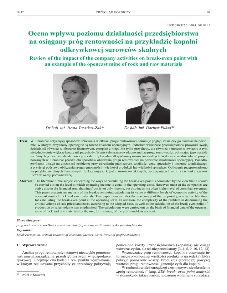 Nr 12 PRZEGLĄD GÓRNICZY 99 UKD 330.322.5: 330.4: 001.891.3 Ocena wpływu poziomu działalności przedsiębiorstwa na osiągany próg rentowności na przykładzie kopalni odkrywkowej surowców skalnych Review of the impact of the company activities on break-even point with an example of the opencast mine of rock and raw materials Dr hab. inż. Beata Trzaskuś-Żak*) Dr hab. inż. Dariusz Fuksa*) Treść: W literaturze dotyczącej sposobów obliczania wielkości progu rentowności dominuje pogląd, że należy go określać na poziomie, w którym przychody operacyjne są równe kosztom operacyjnym. Jednakże większość przedsiębiorstw prowadzi swoją działalność również w obszarze finansowym, czerpiąc z niego nie tylko przychody, ale również ponosząc w związku z tym niejednokrotnie większe koszty niż przychody. W artykule przeprowadzono analizę progu rentowności, obliczając jego wartość na różnych poziomach działalności gospodarczej kopalni odkrywkowej surowców skalnych. Wykazano niedokładność proponowanych w literaturze przedmiotu sposobów obliczania progu rentowności na poziomie działalności operacyjnej. Ponadto, zwrócono uwagę na złożoność problemu przy określaniu granicznych wielkości ceny sprzedaży i kosztów wynikającego z przyjętej podstawy obliczania progu rentowności - wielkości produkcji lub wielkości sprzedaży. Obliczenia przeprowadzono na przykładzie danych finansowych funkcjonującej kopalni surowców skalnych, zaczerpniętych m.in. z rachunku zysków i strat w wersji porównawczej. Abstract: The literature of the subject concerning the ways of calculating the break-even point is dominated by the view that it should be carried out on the level at which operating income is equal to the operating costs. However, most of the companies are active also in the financial area, drawing from it not only income, but also incurring often higher level of costs than revenues. This paper presents an analysis of the break-even point, calculating its value at different levels of economic activity of the opencast mine of rock and raw materials. This paper demonstrates the inaccuracy of the proposal given by the literature for calculating the break-even point at the operating level. In addition, the complexity of the problem in determining the critical volume of sale prices and costs, according to the adopted base, as well as the calculation of the break-even point of production or sales volume was emphasized. The calculations were carried out on the basis of financial data of the opencast mine of rock and raw materials by the use, for instance, of the profit-and-loss account. Słowa kluczowe: próg rentowności, wielkości graniczne, koszty, poziomy rozliczania zysku przedsiębiorstw Key words: break even-point, critical volumes of economic factors, costs, levels of profit calculation 1. Wprowadzenie Analiza progu rentowności stanowi niezwykle pomocny instrument zarządzania przedsiębiorstwem w gospodarce rynkowej. Obejmuje ona badanie tzw. punktu wyrównania, w którym realizowane przychody ze sprzedaży pokrywają *) AGH w Krakowie poniesione koszty. Przedsiębiorstwo (kopalnia) nie osiąga wówczas zysku, ale też nie ponosi straty [3, 4, 5, 9, 10, 12, 13]. Wyznaczając próg rentowności, kopalnia otrzymuje informacje o koniecznej wielkości produkcji (sprzedaży), która pokryje ponoszone koszty. Produkcja (sprzedaż) powyżej wartości progu rentowności generuje zysk dla kopalni. W rachunkowości zarządczej często używa się określenia „próg rentowności” (ang. BEP break- even point analysis) w stosunku do takiej wartości poziomu wolumenu sprzedaży, 100 PRZEGLĄD GÓRNICZY przy której przychody operacyjne są równe kosztom operacyjnym (zysk brutto ze sprzedaży jest równy zero) lub przychody pokrywają wszystkie koszty (zysk netto jest równy zero). Przez analogię można jednak przenieść określenie progu rentowności na każdą zmienną i w stosunku do każdej miary [8]. Próg rentowności stanowi kluczowe narzędzie w Systemie Informacji Planistycznej (SIP) w koncepcji operacyjnej rachunkowości zarządczej nastawionej na planowanie, kontrolę i modelowanie wyników w krótkim okresie. Narzędzie to wykorzystywane jest najczęściej przy ocenie wpływu zmian poszczególnych wskaźników objętych analizą: koszty-rozmiary produkcji-zysk (ang. CVP cost-volume-profit analysis). Wskaźnikami tymi są: jednostkowa cena sprzedaży, rozmiary produkcji (sprzedaży), jednostkowe koszty zmienne oraz koszty stałe [7]. 2. Wyznaczanie progu rentowności na różnych poziomach działalności gospodarczej kopalni odkrywkowej surowców skalnych Rachunek zysków i strat (rachunek wyników) jest zestawieniem osiągniętych w danym roku obrotowym przychodów ustalonych zgodnie z zasadą memoriałową z kosztami poniesionymi w danym roku obrotowym, współmiernymi do ustalonych przychodów. Rachunek wyników może być sporządzany w wariancie porównawczym i wariancie kalkulacyjnym (tab. 1). Różnica pomiędzy tymi wariantami przejawia się w sposobie ujmowania kosztów wytworzenia wyrobów ponoszonych przez jednostkę, co jest wynikiem przyjętego sposobu ewidencji księgowej (tzw. wariantów). Oba warianty rachunku zysków i strat konstruowane są według tej samej zasady, zwanej drabinkową, która zestawia naprzemiennie osiągnięte przychody i poniesione koszty, w odniesieniu na poszczególne poziomy (segmenty) działalności gospodarczej przedsiębior- 2015 stwa. Segmenty ujęte w rachunku wyników odpowiadają typowemu schematowi działalności gospodarczej przedsiębiorstwa (kopalni). Działalność operacyjna przedsiębiorstwa jest podstawowym rodzajem działalności, której efektem może być osiągnięcie zysku lub poniesienie straty. Można ją podzielić na podstawową działalność operacyjną oraz pozostałą działalność operacyjną. Podstawowa działalność operacyjna obejmuje operacje, które stanowią zasadni