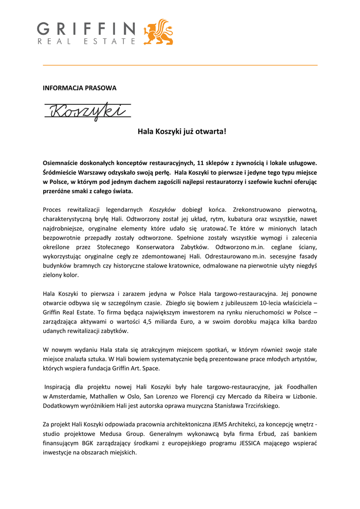 INFORMACJA PRASOWA Hala Koszyki już otwarta! Osiemnaście doskonałych konceptów restauracyjnych, 11 sklepów z żywnością i lokale usługowe. Śródmieście Warszawy odzyskało swoją perłę. Hala Koszyki to pierwsze i jedyne tego typu miejsce w Polsce, w którym pod jednym dachem zagościli najlepsi restauratorzy i szefowie kuchni oferując przeróżne smaki z całego świata. Proces rewitalizacji legendarnych Koszyków dobiegł końca. Zrekonstruowano pierwotną, charakterystyczną bryłę Hali. Odtworzony został jej układ, rytm, kubatura oraz wszystkie, nawet najdrobniejsze, oryginalne elementy które udało się uratować. Te które w minionych latach bezpowrotnie przepadły zostały odtworzone. Spełnione zostały wszystkie wymogi i zalecenia określone przez Stołecznego Konserwatora Zabytków. Odtworzono m.in. ceglane ściany, wykorzystując oryginalne cegły ze zdemontowanej Hali. Odrestaurowano m.in. secesyjne fasady budynków bramnych czy historyczne stalowe kratownice, odmalowane na pierwotnie użyty niegdyś zielony kolor. Hala Koszyki to pierwsza i zarazem jedyna w Polsce Hala targowo-restauracyjna. Jej ponowne otwarcie odbywa się w szczególnym czasie. Zbiegło się bowiem z jubileuszem 10-lecia właściciela – Griffin Real Estate. To firma będąca największym inwestorem na rynku nieruchomości w Polsce – zarządzająca aktywami o wartości 4,5 miliarda Euro, a w swoim dorobku mająca kilka bardzo udanych rewitalizacji zabytków. W nowym wydaniu Hala stała się atrakcyjnym miejscem spotkań, w którym również swoje stałe miejsce znalazła sztuka. W Hali bowiem systematycznie będą prezentowane prace młodych artystów, których wspiera fundacja Griffin Art. Space. Inspiracją dla projektu nowej Hali Koszyki były hale targowo-restauracyjne, jak Foodhallen w Amsterdamie, Mathallen w Oslo, San Lorenzo we Florencji czy Mercado da Ribeira w Lizbonie. Dodatkowym wyróżnikiem Hali jest autorska oprawa muzyczna Stanisława Trzcińskiego. Za projekt Hali Koszyki odpowiada pracownia architektoniczna JEMS Architekci, za koncepcję wnętrz studio projektowe Medusa Group. Generalnym wykonawcą była firma Erbud, zaś bankiem finansującym BGK zarządzający środkami z europejskiego programu JESSICA mającego wspierać inwestycje na obszarach miejskich.