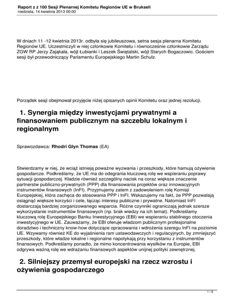 Raport z z 100 Sesji Plenarnej Komitetu Regionów UE w Brukseli niedziela, 14 kwietnia 2013 00:00 W dniach 11 -12 kwietnia 2013r. odbyła się jubileuszowa, setna sesja plenarna Komitetu Regionów UE. Uczestniczyli w niej członkowie Komitetu i równocześnie członkowie Zarządu ZGW RP Jerzy Zająkała, wójt Łubianki i Leszek Świętalski, wójt Starych Bogaczowic. Gościem sesji był przewodniczący Parlamentu Europejskiego Martin Schulz. Porządek sesji obejmował przyjęcie niżej opisanych opinii Komitetu oraz jednej rezolucji. 1. Synergia między inwestycjami prywatnymi a finansowaniem publicznym na szczeblu lokalnym i regionalnym Sprawozdawca: Rhodri Glyn Thomas (EA) Stwierdzamy w niej, że wciąż istnieją poważne wyzwania i przeszkody, które hamują ożywienie gospodarcze. Podkreślamy, że UE ma do odegrania kluczową rolę we wspieraniu poprawy sytuacji gospodarczej. Kładzie również szczególny nacisk na coraz większe znaczenie partnerstw publiczno-prywatnych (PPP) dla finansowania projektów oraz innowacyjnych instrumentów finansowych (InFI). Przyjmujemy zatem z zadowoleniem rolę Komisji Europejskiej, która zachęca do stosowania PPP i InFI. Wskazujemy na fakt, że PPP pozwalają osiągnąć większe korzyści i cele, łącząc interesy publiczne i prywatne. Natomiast InFI dostarczają bardziej zorganizowanego wsparcia. Różne czynniki ograniczają jednak szersze wykorzystanie instrumentów finansowych (np. brak wiedzy na ich temat). Podkreślamy kluczową rolę Europejskiego Banku Inwestycyjnego (EBI) we wspieraniu stabilnego otoczenia inwestycyjnego w UE. Zauważamy, że EBI oferuje władzom publicznym profesjonalne doradztwo i techniczny know-how dotyczące opracowania i wdrożenia szeregu InFI na poziomie UE. Wzywamy również KE do wyjaśnienia ram ustawodawczych i regulacyjnych, by zmniejszyć przeszkody, które władze lokalne i regionalne napotykają przy korzystaniu z instrumentów finansowych. Podkreślamy ponadto, że mimo koncentrowania wysiłków na Europie, EBI odgrywa ważną rolę we wdrażaniu finansowych aspektów unijnej polityki zewnętrznej. 2. Silniejszy przemysł europejski na rzecz wzrostu i ożywienia gospodarczego 1/6 Raport z z 100 Sesji Plenarnej Komitetu Regionów UE w Brukseli niedziela, 14 kwietnia 2013 00:00 Sprawozdawca: Claude Gewerc (PSE) Opinia dotyczy ułatwiania inwestycji w nowe technologie i innowacje, dostępu do rynków, dostępu do rynków finansowych i kapitałowych oraz kluczowej roli kapitału ludzkiego i zarządzania. Zgadzamy się z większością treści komunikatu i wzywamy do tego, by finansowanie przemysłu stało się głównym elementem architektury finansowej i walutowej UE. Wyrażamy jednak ubolewanie, że wymiar terytorialny polityki przemysłowej wspomina się jedynie mimochodem. Podkreślamy m.in. potrzebę nawiązania dialogu społecznego i terytorialnego, szerszego zaangażowania władz lokalnych i regionalnych w te strategię, zwiększenia bezpieczeństwa i podniesienia poziomu konkurencyjności w UE. Proponujemy również zawarcie paktów terytorialnych umożliwiających organizację różnych szczebli współpracy. Sugerujemy, aby przedmiotowe sprawy były tematem jednolitego dokumentu programowego i aby powiązane z nim inwestycje zostały włączone do serii pożyczek udzielanych przez EBI. Wnosimy do Komisji o przestudiowanie możliwości utworzenia nowej kategorii pośredniej przedsiębiorstw, pomiędzy MŚP a dużym przedsiębiorstwem. 3. Wytyczne UE dotyczące pomocy państwa na rzecz wspomagania i restrukturyzacji przedsiębiorstw przeżywających trudności Sprawozdawca: Christophe Rouillon (PSE) Podkreślamy znaczenie tej kwestii dla władz lokalnych i regionalnych, jako że samorządy są głównymi dostarczycielami tego rodzaju pomocy. Wyrażamy zadowolenie z przedłużenia obowiązywania wytycznych z 2004 r. i domagamy się formalnego wniosku o opinię skierowanego do Komitetu Regionów, by mógł on uczestniczyć w drugich konsultacjach przewidzianych wiosną 2013 r. Uważamy, że możliwość interwencji publicznej na rzecz przedsiębiorstw przeżywających trudności nie może być ograniczona tylko do okresów kryzysu, choć nie należy w tym uwzględniać przedsiębiorstw bez perspektyw na przyszłość. Domagamy się, aby w razie restrukturyzacji interweniowała między-agencyjna grupa zadaniowa Komisji Europejskiej, i aby grupa ta uzyskała bardziej formalną i solidną podstawę prawną. Zwracamy się do Komisji Europejskiej, aby utworzyła i udostępniła w internecie bazę danych zawierającą wyczerpujące informacje na temat wszystkich przypadków pomocy publicznej na poziomie unijnym, krajowym i regionalnym. Opowiadamy się za utrzymaniem obecnej definicji przedsiębiorstw przeżywających trudności, ale sprzeciwiamy się ewentualnemu ograniczeniu zakresu stosowania wytycznych do przedsiębiorstw będących przedmiotem formalnego postępowania upadłościowego. Proponujemy wprowadzenie progów de minimis w wypadku 2/6 Raport z z 100 Sesji Plenarnej Komitetu Regionów UE w Brukseli niedziela, 14 kwietnia 2013 00:00 pomocy państwa przeznaczonej na ratowanie i restrukturyzację przedsiębiorstw i sugerujemy, aby Komisja Europejska zastąpiła obecne progi widełkami o wartości minimalnej 20% dla średnich przedsiębiorstw i 30% dla dużych przedsiębiorstw. Proponujemy, aby maksymalny okres pomocy na rzecz ratowania przedsiębiorstw został wydłużony do sześciu miesięcy, z możliwością jednorazowego przedłużenia na sześć miesięcy, i wzywamy do podniesienia maksymalnej łącznej kwoty pomocy państwa w celu ratowania i restrukturyzacji do 15 mln EUR. 4. Wsparcie UE na rzecz zrównoważonych przemian w społeczeństwach w okresie transformacji Sprawozdawca: Maciej Kobyliński, prezydent Słupska (PSE) Podkreślamy potrzebę włączenia władz lokalnych i regionalnych w działania na rzecz wspierania zrównoważonych przemian w społeczeństwach w okresie transformacj