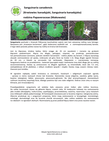 Sanguinaria canadensis (Krwiowiec kanadyjski, Sanguinaria kanadyjska) rodzina Papaveraceae (Makowate) Sanguinaria pochodzi z Ameryki Północnej (wschodniej części), jest tam wiosenną rośliną runa leśnego. Nazywana jest „krwawym korzeniem”, gdyż skaleczona wydziela sok o ciemnopomarańczowej barwie. Z tego także powodu polska nazwa tej rośliny to krwica lub krwiowiec. Jest to kłączowa, drobna bylina, która osiąga ok. 25 cm wysokości i rozrasta się grubymi kłączami podziemnymi. Kłącza ma długie, pełzające, mięsiste, na przekroju pomarańczowe lub pomarańczowo‐czerwone, pokryte cienkimi korzeniami ‐ roślina płytko się korzeni. Z kłącza wyrastają okazałe ciemnozielone od spodu, srebrzyste od góry liście (w liczbie 1‐2). Mają długie ogonki liściowe do 20 cm, a blaszki są sercowate lub nerkowate, klapowane z czerwonawą nerwacją. Sanguinaria kwitnie na przedwiośniu ‐ kwiecień (początek maja) i kwitnienie trwa dość długo jak na roślinę wczesnowiosenną. Kwiaty są umieszczone na długich ogonkach, są śnieżnobiałe, duże (do 7,5 cm), wielopłatkowe (8‐16 płatków), z żółtym środkiem (pręciki i słupki). Kwiaty mają czasem różowy nalot. Owocem jest torebka. W ogrodzie najlepiej sadzić krwiowca w cienistych, kwaśnych i wilgotnych częściach ogrodu ‐ uprawa w cieniu wyższych drzew lub krzewów. Stanowisko raczej wilgotne, zasobne, gleby żyzne, kwaśne (obojętne), lekkie, piaszczyste, piaszczysto‐gliniaste. Na zbyt przesychających stanowiskach roślinom wcześniej zasychają liście, dlatego powinno być ono stale wilgotne. Dobrze znosi zimy w naszym klimacie, jest mrozoodporna. Prawdopodobnie sanguinaria od wieków była używana przez Indian jako roślina lecznicza. Do celów leczniczych używa się głównie kłącza, czasem ziela. W medycynie ludowej ma zastosowanie jako środek żółciopędny, rozkurczowy, uspokajający, przeciwbólowy, nasenny, nasercowy i przy nieżytach oraz infekcjach układu pokarmowego. W homeopatii stosowana jest w leczeniu migreny i alergicznej astmy. Obecnie produkuje się z sanguinarii preparaty, które mają zastosowanie w laryngologii, stomatologii, onkologii, dermatologii oraz do leczenia chorób wirusowych. Jako roślina ozdobna ma zastosowanie na rabatach i w ogrodach skalnych. Rozmnażamy ją przez podział kłączy latem oraz przez wysiew nasion. Miejski Ogród Botaniczny w Zabrzu www.mob‐zabrze.pl