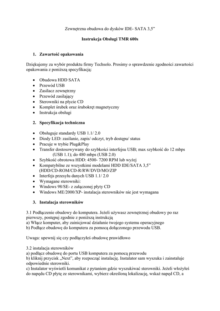 Zewnętrzna obudowa do dysków IDE- SATA 3,5” Instrukcja Obsługi TMR 600s 1. Zawartość opakowania Dziękujemy za wybór produktu firmy Techsolo. Prosimy o sprawdzenie zgodności zawartości opakowania z poniższą specyfikacją: • • • • • • • Obudowa HDD SATA Przewód USB Zasilacz zewnętrzny Przewód zasilający Sterowniki na płycie CD Komplet śrubek oraz śrubokręt magnetyczny Instrukcja obsługi 2. Specyfikacja techniczna • • • • • • • • • • Obsługuje standardy USB 1.1/ 2.0 Diody LED: zasilanie, zapis/ odczyt, tryb dostępu/ status Pracuje w trybie Plug&Play Transfer dostosowywany do szybkości interfejsu USB; max szybkość do 12 mbps (USB 1.1); do 480 mbps (USB 2.0) Szybkość obrotowa HDD: 4500- 7200 RPM lub wyżej Kompatybilne ze wszystkimi modelami HDD IDE/SATA 3,5” (HDD/CD-ROM/CD-R/RW/DVD/MO/ZIP Interfejs przesyłu danych USB 1.1/ 2.0 Wymagane sterowniki: Windows 98/SE- z załączonej płyty CD Windows ME/2000/XP- instalacja sterowników nie jest wymagana 3. Instalacja sterowników 3.1 Podłączenie obudowy do komputera. Jeżeli używasz zewnętrznej obudowy po raz pierwszy, postępuj zgodnie z poniższą instrukcją a) Włącz komputer, aby zainicjować działanie twojego systemu operacyjnego b) Podłącz obudowę do komputera za pomocą dołączonego przewodu USB. Uwaga: upewnij się czy podłączyłeś obudowę prawidłowo 3.2 instalacja sterowników a) podłącz obudowę do portu USB komputera za pomocą przewodu b) kliknij przycisk „Next”, aby rozpocząć instalację. Instalator sam wyszuka i zainstaluje odpowiednie sterowniki. c) Instalator wyświetli komunikat z pytaniem gdzie wyszukiwać sterowniki. Jeżeli włożyłeś do napędu CD płytę ze sterownikami, wybierz określoną lokalizację, wskaż napęd CD, a następnie katalog odpowiadający twojemu systemowi operacyjnemu. Zatwierdź wybór klikając „o.k”, oraz „Next” d) Instalator powinien odnaleźć właściwe pliki. Jeżeli pojawi się informacja o ich braku, wróć do punktu C i wybierz poprawną lokalizację. e) Instalator jest przeznaczony dla systemów Windows 98/ SE. Pozostałe systemy nie wymagają instalacji dodatkowych sterowników. 4. Zarządzanie dyskiem twardym 4.1 Podział dysku na partycje pod systemem Windows 98/ ME a) Kliknij Start> Programy> Tryb MS Dos. Wpisz w oknie dialogowym fdisk i zatwierdź klawiszem ENTER; naciśnij Y, aby uaktywnić obsługę dużych dysków b) Wybierz opcję 5 i podaj prawidłowy nr dysku, aby przełączyć się z aktualnie używanego, na nowy dysk twardy. c) Wybierz opcje 1, aby stworzyć partycję DOS lub partycje logiczne d) Po zakończeniu partycjonowania systemu, wykonaj restart komputera. Musisz również odłączyć kieszeń z dyskiem od komputera. Po ponownym podłączeniu i uruchomieniu, w oknie „Mój Komputer” pojawią się poszczególne partycje dysku. 4.2. Podział dysku na partycje pod systemem Windows 2000/XP a) Kliknij Start, następnie Ustawienia> Panel sterowania> Wydajność i konserwacja b) Kliknij Narzędzia administracyjne> Zarządzanie komputerem. Postępuj zgodnie z instrukcjami, aby założyć poszczególne partycje 5. Odłączenie obudowy od komputera. Przed odłączeniem obudowy od komputera w czasie pracy, koniecznie kliknij w ikonę Odłącz na pasku zadań. Pominięcie tego kroku może spowodować utratę danych na dysku twardym. 6. Montaż dysku twardego Odkręć śruby na spodzie obudowy Zdejmij górną pokrywę i podłącz przewody z dyskiem twardym Włóż HDD do wnętrza obudowy Przykręć HDD do spodniej części obudowy za pomocą śrubek dołączonych w zestawie Podłącz przewód zasilający Załóż górną pokrywę i przykręć śruby Uwaga: Jeżeli zakupiona obudowa nie jest w komplecie z HDD, wkładając do niej nowy dysk, musisz pamiętać o utworzeniu partycji i sformatowaniu dysku. Aby uzyskać szczegółowe informacje, skontaktuj się ze swoim sprzedawcą.