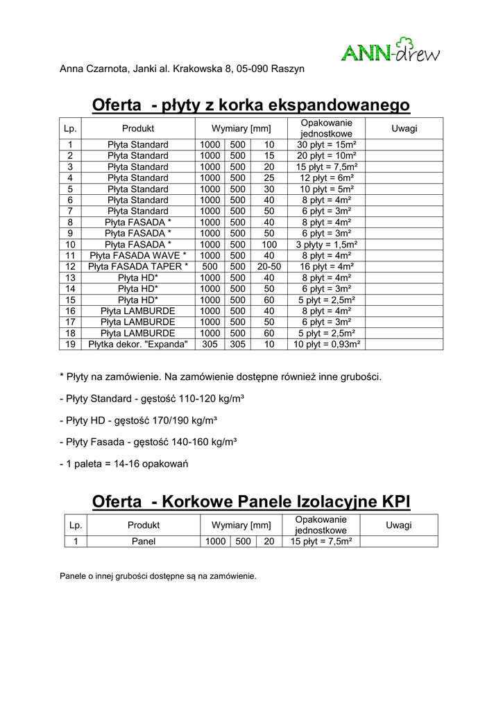 Anna Czarnota, Janki al. Krakowska 8, 05-090 Raszyn Oferta - płyty z korka ekspandowanego Lp. Produkt 1 2 3 4 5 6 7 8 9 10 11 12 13 14 15 16 17 18 19 Płyta Standard Płyta Standard Płyta Standard Płyta Standard Płyta Standard Płyta Standard Płyta Standard Płyta FASADA * Płyta FASADA * Płyta FASADA * Płyta FASADA WAVE * Płyta FASADA TAPER * Płyta HD* Płyta HD* Płyta HD* Płyta LAMBURDE Płyta LAMBURDE Płyta LAMBURDE Płytka dekor. "Expanda" Wymiary [mm] 1000 1000 1000 1000 1000 1000 1000 1000 1000 1000 1000 500 1000 1000 1000 1000 1000 1000 305 500 500 500 500 500 500 500 500 500 500 500 500 500 500 500 500 500 500 305 10 15 20 25 30 40 50 40 50 100 40 20-50 40 50 60 40 50 60 10 Opakowanie jednostkowe 30 płyt = 15m² 20 płyt = 10m² 15 płyt = 7,5m² 12 płyt = 6m² 10 płyt = 5m² 8 płyt = 4m² 6 płyt = 3m² 8 płyt = 4m² 6 płyt = 3m² 3 płyty = 1,5m² 8 płyt = 4m² 16 płyt = 4m² 8 płyt = 4m² 6 płyt = 3m² 5 płyt = 2,5m² 8 płyt = 4m² 6 płyt = 3m² 5 płyt = 2,5m² 10 płyt = 0,93m² Uwagi * Płyty na zamówienie. Na zamówienie dostępne również inne grubości. - Płyty Standard - gęstość 110-120 kg/m³ - Płyty HD - gęstość 170/190 kg/m³ - Płyty Fasada - gęstość 140-160 kg/m³ - 1 paleta = 14-16 opakowań Oferta - Korkowe Panele Izolacyjne KPI Lp. Produkt 1 Panel Wymiary [mm] 1000 500 Panele o innej grubości dostępne są na zamówienie. 20 Opakowanie jednostkowe 15 płyt = 7,5m² Uwagi