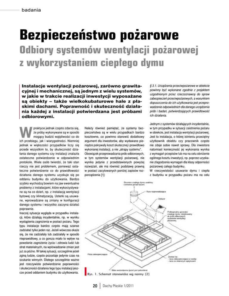 badania Bezpieczeństwo pożarowe Odbiory systemów wentylacji pożarowej z wykorzystaniem ciepłego dymu Instalacje wentylacji pożarowej, zarówno grawitacyjnej i mechanicznej, są jednym z wielu systemów, w jakie w trakcie realizacji inwestycji wyposażane są obiekty – także wielkokubaturowe hale z płaskimi dachami. Poprawność i skuteczność działania każdej z instalacji potwierdzana jest próbami odbiorowymi. W praktyce jednak często zdarza się, że próby wykonywane są w sposób mogący budzić wątpliwości co do ich przebiegu, jak i wiarygodności. Niemniej jednak w większości przypadków liczy się przede wszystkim to, by skuteczność działania danego systemu czy instalacji znalazła ostateczne potwierdzenie w odpowiednim protokole. Wiele osób twierdzi, że taki stan rzeczy nie jest problemem, ponieważ ostateczne potwierdzenie co do prawidłowości działania danego systemu uzyskuje się po oddaniu budynku do użytkowania. Bardzo szybko wychodzą bowiem na jaw ewentualne problemy z instalacjami, które wykorzystywane są na co dzień, np. z instalacją wentylacji bytowej czy klimatyzacją. Usterki są usuwane, wprowadzane są zmiany w konfiguracji danego systemu i wszystko zaczyna działać poprawnie. Inaczej sytuacja wygląda w przypadku instalacji, które działają incydentalnie, np. w wyniku wystąpienia zagrożenia w postaci pożaru. Tego typu instalacje bardzo często mają szanse zadziałać tylko jeden raz. Jeżeli wówczas okaże się, że nie zadziałały lub zadziałały w sposób nieprawidłowy, a co gorsza miało to wpływ na powstanie zagrożenie życia i zdrowia ludzi lub strat materialnych, na wprowadzanie zmian jest już za późno. W takiej sytuacji, szczególnie jeżeli zginą ludzie, często pozostaje jedynie czas na szukanie winnych. Dlatego szczególnie ważne jest rzeczywiste potwierdzenie poprawności i skuteczności działania tego typu instalacji jeszcze przed oddaniem budynku do użytkowania. Należy również pamiętać, że systemy bezpieczeństwa są w wielu przypadkach bardzo kosztowne, co powinno stanowić dodatkowy argument dla inwestorów, aby wydawane pieniądze pokrywały koszt skutecznej i prawidłowo wykonanej instalacji, a nie „atrapy systemu”. Obowiązek przeprowadzania prób odbiorowych, w tym systemów wentylacji pożarowej, nie wynika jedynie z przedstawionych powyżej rozważań, ale ma również podstawę prawną w postaci zacytowanych poniżej zapisów rozporządzenia [1]: Rys. 1. Schemat stanowiska wg normy [2] 20 Dachy Płaskie 1/2011 § 3.1. Urządzenia przeciwpożarowe w obiekcie powinny być wykonane zgodnie z projektem uzgodnionym przez rzeczoznawcę do spraw zabezpieczeń przeciwpożarowych, a warunkiem dopuszczenia do ich użytkowania jest przeprowadzenie odpowiednich dla danego urządzenia prób i badań, potwierdzających prawidłowość ich działania. Jednym z systemów działających incydentalnie, w tym przypadku w sytuacji zaistnienia pożaru w obiekcie, jest instalacja wentylacji pożarowej. Jest to instalacja, o której istnieniu przeciętny użytkownik obiektu czy pracownik często nie zdaje sobie nawet sprawy. Dla inwestora natomiast konieczność jej wykonania wynika z wymagań przepisów lub ma na celu obniżenie ogólnego kosztu inwestycji, np. poprzez uzyskanie złagodzenia wymagań dla klasy odporności pożarowej całego budynku. W rzeczywistości usuwanie dymu i ciepła z budynku w przypadku pożaru ma na celu badania Fot. 1. Próby z ciepłym dymem w hali magazynowej [3] Fot. 2. Stanowisko do przeprowadzania prób z gorącym dymem przygotowane do badania [3] Fot. 3. Stanowisko do przeprowadzania prób z gorącym dymem w trakcie badania [3] zapewnienie bezpiecznych warunków ewakuacji osób przebywających w budynku oraz bezpieczeństwa konstrukcji. Próby z wykorzystaniem ciepłego dymu są najlepszą dostępną aktualnie metodą, która pozwala na zweryfikowanie poprawności i skuteczności tego systemu. Ponieważ w Polsce wymagania dotyczące sposobu wykonywania prób z ciepłym dymem nie zostały jak dotąd opisane, większość firm i instytucji zajmująca się ich wykonywaniem posługuje się normą AS 4391—1999 Australian Standard™ Smoke management systems - Hot smoke test lub wytycznymi brytyjskiego instytutu BRE. W dokumentach tych można znaleźć zarówno opis procedur badawczych, jak również ogólne wymagania sprzętowe. Zasadność wykonywania badań z wykorzystaniem ciepłego dymu, m.in. dla grawitacyjnych instalacji wentylacji pożarowej z klapami oddymiającymi zamontowanymi w dachu płaskim, została potwierdzona przez międzynarodowe grono ekspertów, którzy spotkali się w ubiegłym roku w Hinwil w Szwajcarii w ramach cyklu „Fire and Smoke Expert Event”. W ich opinii próby z wykorzystaniem zimnego dymu są całkowicie niereprezentatywne dla systemów związanych z bezpieczeństwem pożarowym w obiektach budowlanych. [4] spalania spirytusu. Spirytus w określonych ilościach spalany jest w tacach wykonanych ze stali nierdzewnej. Tace te mają znormalizowane rozmiary, co pozwala na dobranie odpowiedniej dla analizowanego obiektu mocy pożaru testowego. Tace wykonane zgodnie z normą [2] pozwalają na osiąganie mocy pożaru testowego w przedziale od 11 do 1500 kW. Moc pożaru dobierana jest w taki sposób, aby nie spowodowała strat w obiekcie i nie uruchomiła instalacji tryskaczowej bądź innych urządzeń. W celu ochrony przed wysoką temperaturą podłoża, na którym lokalizowane jest stanowisko badawcze, tace ze spirytusem wyposażone są w stopki dystansowe i dodatkowo umieszczane w tacach z wodą. W razie konieczności stosuje się dodatkowe maty izolacyjne. Wytworzona przez aparaturę kolumna konwekcyjna dymu o określonej i bezpiecznej temperaturze kształtem zbliżona jest do kolumny powstającej podczas rzeczywistego pożaru, dlatego też próby z wykorzystaniem ciepłego dymu są zdecydowanie bardziej realistyczne niż stosowanie zimnego dymu 