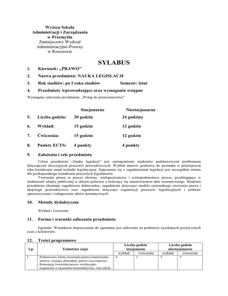 WyŜsza Szkoła Administracji i Zarządzania w Przemyślu Zamiejscowy Wydział Administracyjno-Prawny w Rzeszowie SYLABUS 1. Kierunek: „PRAWO” 2. Nazwa przedmiotu: NAUKA LEGISLACJI 3. Rok studiów: po I roku studiów 4. Przedmioty wprowadzające oraz wymagania wstępne Semestr: letni Wymagane zaliczenie przedmiotu: „Wstęp do prawoznawstwa” Stacjonarne Niestacjonarne 5. Liczba godzin: 30 godzin 24 godziny 6. Wykład: 15 godzin 12 godzin 7. Ćwiczenia: 15 godzin 12 godzin 8. Punkty ECTS: 4 punkty 4 punkty 9. ZałoŜenia i cele przedmiotu Celem przedmiotu „Nauka legislacji” jest zaznajomienie studentów podstawowymi problemami dotyczącymi decyzyjnych procesów prawodawczych. Wykład stanowi podstawę do poznania w późniejszym toku kształcenia zasad techniki legislacyjnej. Zapoznanie się z zagadnieniami legislacji jest szczególnie istotne dla profesjonalnego kształcenia przyszłych legislatorów. Tworzenie prawa to proces złoŜony, wielopoziomowy i wielopodmiotowy proces, przebiegający w strukturach władzy publicznej w danym państwie a kończący się ustanowieniem aktu normatywnego. Struktura przedmiotu obejmuje zagadnienia doktrynalne, zagadnienia dotyczące modelu racjonalnego tworzenia prawa i aksjologii prawodawstwa oraz zagadnienia dotyczące organizacji procesów legislacyjnych i podstaw opracowywanie i redagowanie aktów normatywnych. 10. Metody dydaktyczne Wykład i ćwiczenia 11. Forma i warunki zaliczenia przedmiotu Egzamin. Warunkiem dopuszczenia do egzaminu jest zaliczenie na podstawie uzyskanych pozytywnych ocen z kolokwiów. 12. Lp. I Treści programowe Liczba godzin stacjonarne wykład ćwiczenia Tematyka zajęć Podstawowe formy tworzenia prawa (stanowienie, umowa, wiąŜący precedens, prawo zwyczajowe). Koncepcje tworzenia prawa: ewolucyjnoorganiczne a racjonalno-konstruktywne, rola szkoły 4 3 Liczba godzin niestacjonarne wykład ćwiczenia 3 3 historyczne w kształtowaniu nauki legislacji, koncepcje polityki prawa, teoria racjonalnego tworzenia prawa. Aksjologia prawodawstwa. Organizacja procesów prawotwórczych. Aspekt proceduralny stanowienia prawa: faza przedparlamentarna, parlamentarna i postparlamentarna. Rządowe procesy legislacyjne – tworzenie aktów wykonawczych. Procesy tworzenia prawa miejscowego. Nauka o akcie normatywnym – opracowanie i redagowanie, struktura, rodzaje przepisów prawnych. Język prawny i jego cechy. Podstawowe zasady techniki prawodawczej: budowa ustawy i aktu wykonawczego. Nowelizacja aktu, tekst jednolity. II III IV 13. 1. 2. 3. 1 6 8 1 5 6 4 4 3 3 Literatura podstawowa Kustra E., Racjonalny ustawodawca. Analiza teoretyczno-prawna, Toruń 1980. Wronkowska S., Problemy racjonalnego tworzenia prawa, Poznan 1982. Wróblewski J., Teoria racjonalnego tworzenia prawa, Wrocław-Warszawa-Kraków-Gdańsk-Łódź, 1985. 14. 1. 2. Literatura uzupełniająca Wronkowska S., Zieliński M., Problemy i zasady redagowania tekstów prawnych, Warszawa 1993. Leszczyński L., Podejmowanie decyzji prawnych. Tworzenie i stosowanie prawa, Zamość 2003. 15. Nazwisko osoby prowadzącej zajęcia na studiach stacjonarnych - wykład: dr hab. A. Korybski - ćwiczenia: dr D. Ferenc-Kopeć 16. Nazwisko osoby prowadzącej zajęcia na studiach niestacjonarnych - wykład: dr hab. A. Korybski - ćwiczenia: dr D. Ferenc-Kopeć