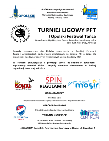 Pod Honorowymi patronatami Prezydenta Miasta Opola Marszałka Województwa Opolskiego Polskiej Federacji Tańca TURNIEJ LIGOWY PFT I Opolski Festiwal Tańca Disco Dance, Hip-Hop, Jazz Dance, Tańce Par, Inne formy tańca solo, duet, małe grupy, formacje Zawody przeznaczone dla klubów zrzeszonych w Polskiej Federacji Tańca i organizacjach partnerskich działających na terenie RP, a także dla organizacji międzynarodowych wchodzących w skład rodziny IDO. W ramach popularyzacji i promocji tańca, do udziału w zawodach zapraszamy również kluby i zespoły taneczne niezrzeszone w żadnej organizacji tanecznej w Polsce. REGULAMIN ORGANIZATORZY Fundacja Spin Niepubliczna Placówka Artystyczna -Studio Tańca Royal Dance Center WSPÓŁORGANIZATOR Miejski Ośrodek Sportu i Rekreacji w Opolu TERMIN i MIEJSCE 29 listopada 2014 - sobota - warsztaty 30 listopada 2014 - niedziela - turniej „GWARDIA” Kompleks Rekreacyjno-Sportowy w Opolu, ul. Kowalska 2 CELE TURNIEJU popularyzacja i propagowanie rozwoju tańca nowoczesnego konfrontacja dorobku artystycznego i wymiana doświadczeń pomiędzy klubami i trenerami rywalizacja Fair Play oraz wspólna integracja tancerzy i trenerów z całego kraju promocja Miasta Opole promocja województwa opolskiego wyłonienie najlepszych tancerzy i zespołów na poszczególnych poziomach zaawansowania oraz w poszczególnych kategoriach wiekowych i stylach tańca KATEGORIE WIEKOWE i KONKURENCJE TANECZNE Poziomy zaawansowania Disco Dance, Hip-Hop, Jazz Dance, Tańce Par solo & duo: SOLO DZIEWCZĘTA/CHŁOPCY- sposób klasyfikacji (do czasu uruchomienia bazy danych) E (debiuty) tancerze dla których ten turniej będzie pierwszym turniejem w życiu. D (begginers) tancerze „bardzo początkujący”, którzy już tańczyli w turniejach, ale nie zakwalifikowali się do finału oraz tancerze, dla których ten turniej będzie pierwszym turniejem w życiu. C (rising stars) tancerze „początkujący”, którzy tańczyli w turniejach i byli w finałach. B (stars) tancerze „średniozaawansowani”, którzy już tańczyli w turniejach zdobywając miejsca medalowe. A (elita) tancerze średnio zaawansowani i zaawansowani od 1/4 F KM IDO. S (master) tancerze zaawansowani finaliści i półfinaliści KM IDO. Dziewczęta - sposób rozgrywania konkurencji solo: w klasach lub klasach łączonych. Chłopcy - sposób rozgrywania konkurencji solo: w klasach łączonych E+D+C oraz B+A+S DUETY wg. IDO: dzieci (2003 i młodsi), juniorzy (2002-1999), dorośli (1998 i starsi) sposób rozgrywania duetów: w klasach łączonych: E+D; C+B oraz A+S UWAGA! Tancerze startują zgodnie z klasami uzyskanymi na turniejach ligowych w Szczecinie i Karczewie. W przypadku gdy jest to pierwszy start o przypisaniu tancerza do poszczególnej klasy tanecznej decyduje instruktor/trener na podstawie dotychczasowych osiągnięć zawodnika. KOMISJA SĘDZIOWSKA Turniej oceniać będzie Komisja Sędziowska powołana i zatwierdzona przez Komisję ds. Sędziów Polskiej Federacji Tańca i Komisja skrutacyjna. W skład Komisji Sędziowskiej wchodzić będą licencjonowani Sędziowie PFT oraz w miarę potrzeby licencjonowani sędziowie partnerskich organizacji tanecznych. NAGRODY Certyfikaty uczestnictwa dla wszystkich klubów i zespołów biorących udział w zawodach. Dyplomy dla wszystkich finalistów. Medale za miejsca 1-3 dla solistów i duetów. Puchary za 1 miejsca na w poziomach zaawansowania „A-S” (solo, duo) Puchary za 1 miejsca małych grup i formacji, pozostałe miejsca medalowe i medale. DYSCYPLINY i KONKURENCJE TANECZNE - I OPOLSKI FESTIWAL TAŃCA ZASTRZEGAMY SOBIE MOŻLIWOŚĆ ZMIAN W ZALEŻNOŚCI OD ILOŚCI ZGŁOSZEŃ. Niedziela 30 listopada - JAZZ DANCE Kategorie Solo dziewczęta Solo chłopcy Małe Grupy (3-7 osób) Formacje (8-24 osób) Czas Prezentacji OBOWIĄZUJE TECHNIKA JAZZ DANCE ! Eliminacje: Short program - czas prezentacji 1 minuta. Finał: prezentacja indywidualna do czas prezentacji 1:452:15. Do finału może zakwalifikować się maksymalnie: w klasach E,D,C,:3 osoby, natomiast w klasach B,A,S:6 osób. Wiek Dzieci: Do 11 lat (2003 i młodsi) Juniorzy: 12-15 lat (2002-1999) Seniorzy: 16+ (1996 i starsi) Muzyka musi zostać dostarczona do akustyka na pendrive USB przed eliminacjami. (muzyka własna) Od 2 min. 30 sek. do 3 min. 00 sek. (max.) (muzyka własna) Od 2 min. 30 sek. do 4 min. 00 sek. (max.) (muzyka własna) Niedziela 30 listopada - Disco Dance Kategorie Solo dziewczęta Solo chłopcy Duety Małe Grupy (3-7 osób) Formacje (8-24 osób) Czas Prezentacji - Prezentacja otwierająca ok. 30 sek. nie oceniana - Prezentacja główna 40 sek - 1 min. w zależności od poziomu zaawansowania - Prezentacja zamykająca ok. 30 sek. (muzyka organizatora) Dzieci 1 min 30 sek Juniorzy i seniorzy 2 min. 00 sek. (muzyka organizatora) Od 2 min. 30 sek. do 3 min. 00 sek. (max.) (muzyka własna) Wiek Dzieci do lat 7: 7- lat (2007 i młodsi) Dzieci: 8-11 lat (2006-2003) Juniorzy: 12-15 lat (2002-1999) Seniorzy: 16+ (1996 i starsi) Niedziela 30 listopada - INNE PROPOZYCJE TANECZNE Kategorie Małe Grupy (3-7 osób) Formacje (8-24 tancerzy) Czas Prezentacji Dzieci 1 min 30 sek Juniorzy i seniorzy 2 min. 00 sek. Wiek Dzieci : Do 11 lat (2007 i młodsi) (muzyka własna) Juniorzy : 12-15 lat (2002-2001) Od 2 min. 30 sek. do 3 min. 00 sek. (max.) - dzieci Dorośli: Od 2 min. 30 sek. do 4 min. 00 sek. (max.) - juniorzy 16+ (1998 i starsi) i dorośli. Dopuszczalne style: Show Dance, etiuda taneczna, inscenizacja taneczna, modern (muzyka własna) Niedziela 30 listopada - Tańce Par Salsa Pary, Merengue Pary, Bachata Pary, Salsa Solo Shines, Latin Show (tylko Małe grupy i Formacje) Kategorie Czas Prezentacji Wiek Solo dziewczęta - Prezentacja otwierająca ok. 30 sek. nie oceniana Dzieci do lat 7: Solo chłopcy - Prezentacja główna 40 sek - 1 min. w zależności od 7- lat (2007 i młodsi) Duety (pary) poziomu zaawansowania Dzieci: - Prezentacja zamykająca ok. 30 sek. 8-11 lat (2006-2003) (muzyka org