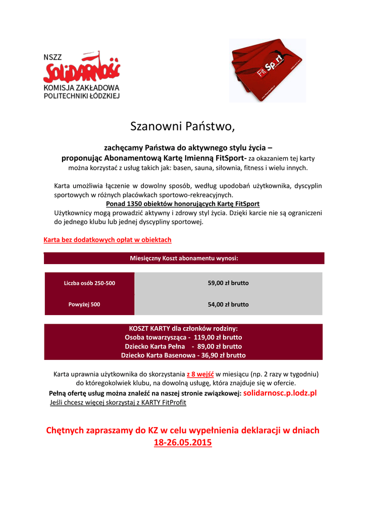 Szanowni Państwo, zachęcamy Państwa do aktywnego stylu życia – proponując Abonamentową Kartę Imienną FitSport- za okazaniem tej karty można korzystać z usług takich jak: basen, sauna, siłownia, fitness i wielu innych. Karta umożliwia łączenie w dowolny sposób, według upodobań użytkownika, dyscyplin sportowych w różnych placówkach sportowo-rekreacyjnych. Ponad 1350 obiektów honorujących Kartę FitSport Użytkownicy mogą prowadzić aktywny i zdrowy styl życia. Dzięki karcie nie są ograniczeni do jednego klubu lub jednej dyscypliny sportowej. Karta bez dodatkowych opłat w obiektach Miesięczny Koszt abonamentu wynosi: Liczba osób 250-500 Powyżej 500 59,00 zł brutto 54,00 zł brutto KOSZT KARTY dla członków rodziny: Osoba towarzysząca - 119,00 zł brutto Dziecko Karta Pełna - 89,00 zł brutto Dziecko Karta Basenowa - 36,90 zł brutto Karta uprawnia użytkownika do skorzystania z 8 wejść w miesiącu (np. 2 razy w tygodniu) do któregokolwiek klubu, na dowolną usługę, która znajduje się w ofercie. Pełną ofertę usług można znaleźć na naszej stronie związkowej: solidarnosc.p.lodz.pl Jeśli chcesz więcej skorzystaj z KARTY FitProfit Chętnych zapraszamy do KZ w celu wypełnienia deklaracji w dniach 18-26.05.2015