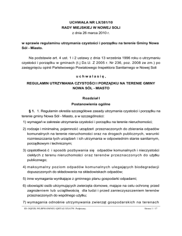 UCHWAŁA NR LX/381/10 RADY MIEJSKIEJ W NOWEJ SOLI z dnia 26 marca 2010 r. w sprawie regulaminu utrzymania czystości i porządku na terenie Gminy Nowa Sól - Miasto. Na podstawie art. 4 ust. 1 i 2 ustawy z dnia 13 września 1996 roku o utrzymaniu czystości i porządku w gminach (t.j Dz.U. Z 2005 r. Nr 236, poz. 2008 ze zm.) po zasięgnięciu opinii Państwowego Powiatowego Inspektora Sanitarnego w Nowej Soli u c h w a l a s i ę , REGULAMIN UTRZYMANIA CZYSTOŚCI I PORZĄDKU NA TERENIE GMINY NOWA SÓL - MIASTO Rozdział I Postanowienia ogólne § 1. 1. Regulamin określa szczegółowe zasady utrzymania czystości i porządku na terenie gminy Nowa Sól - Miasto, a w szczególności: 1) wymagań w zakresie utrzymania czystości i porządku na terenie nieruchomości; 2) rodzaje i minimalną pojemność urządzeń przeznaczonych do zbierania odpadów komunalnych na terenie nieruchomości oraz na drogach publicznych, warunki rozmieszczania tych urządzeń i ich utrzymania w odpowiednim stanie sanitarnym, porządkowym i technicznym; 3) częstotliwoś ć i sposób pozbywania się odpadów komunalnych i nieczystości ciekłych z terenu nieruchomości oraz terenów przeznaczonych do użytku publicznego; 4) maksymalny poziom odpadów komunalnych ulegających biodegradacji dopuszczonych do składowania na składowiskach odpadów; 5) inne wymagania wynikające z gminnego planu gospodarki odpadami; 6) obowiązki osób utrzymujących zwierzęta domowe, mające na celu ochronę przed zagrożeniem lub uciążliwością dla ludzi i przed zanieczyszczeniem terenów przeznaczonych do wspólnego użytku; 7) wymagania odnośnie utrzymywania zwierząt gospodarskich na terenach zakazu ich utrzymywania na ID:wyłączonych z produkcji rolniczej, w tym także OQFZK-WLBPH-OMNEU-QHTAZ-XXATW. Podpisany. Strona 1 / 17 określonych obszarach lub w poszczególnych nieruchomościach; 8) wyznaczenie obszarów podlegających obowiązkowej deratyzacji i terminy jej przeprowadzania. 2. W sprawach dotyczących utrzymania czystości i porządku na terenie gminy Nowa Sól - Miasto nieuregulowanych niniejszym regulaminem stosuje się przepisy ustawy 6) obowiązki osób utrzymujących zwierzęta domowe, mające na celu ochronę przed zagrożeniem lub uciążliwością dla ludzi i przed zanieczyszczeniem terenów przeznaczonych do wspólnego użytku; 7) wymagania odnośnie utrzymywania zwierząt gospodarskich na terenach wyłączonych z produkcji rolniczej, w tym także zakazu ich utrzymywania na określonych obszarach lub w poszczególnych nieruchomościach; 8) wyznaczenie obszarów podlegających obowiązkowej deratyzacji i terminy jej przeprowadzania. 2. W sprawach dotyczących utrzymania czystości i porządku na terenie gminy Nowa Sól - Miasto nieuregulowanych niniejszym regulaminem stosuje się przepisy ustawy z dnia 13 września 1996 roku o utrzymaniu czystości i porządku w gminach (t.j Dz.U.z 2005r. Nr 236, poz.2008 ze zm.). 3. Zasady postępowania i gospodarowania odpadami komunalnymi, a w szczególności zbieranie, odbiór, transport, odzysk, zagospodarowywanie i unieszkodliwianie, muszą być prowadzone zgodnie z Planem Gospodarki Odpadami dla Gminy Miejskiej Nowa Sól na lata 2004 - 2015. 4. W sprawach dotyczących zasad postępowania i gospodarowania odpadami nieuregulowanych niniejszą uchwałą, stosuje się przepisy ustawy z dnia 27 kwietnia 2001r. o odpadach ( t.j. Dz. U. 2007 r. Nr 39, poz. 251 ze zm.), ustawy z dnia 11 maja 2001r. o obowiązkach przedsiębiorców w zakresie gospodarowania niektórymi odpadami oraz o opłacie produktowej i opłacie depozytowej ( t.j. Dz. U.z 2007 r. Nr 90, poz. 607 ze zm.), ustawy z dnia 11 maja 2001 r. o opakowaniach i odpadach opakowaniowych (Dz. U. Nr 63, poz. 638 ze zm.), ustawy z dnia 29 lipca 2005 r. o zużytym sprzęcie elektrycznym i elektronicznym (Dz. U. Nr 180, poz. 1495 ze zm). Rozdział II Wymagania w zakresie utrzymania czystości i porządku na terenie nieruchomości oraz w miejscach publicznych § 2. Właściciele nieruchomości oraz właściciele lub najemcy lokali zobowiązani są do utrzymania na ich terenie porządku, czystości oraz należytego stanu sanitarnohigienicznego przez: 1) wyposażenie nieruchomości w urządzenia służące do zbierania odpadów komunalnych tj. pojemniki o pojemności od 0,06 m3 do 1,2 m3 lub kontenery o pojemnośc i o d 1 , 1 m 3 d o 1 0 , 0 m 3 o r a z u t r z y m y w a n i e t y c h u r ządzeń w odpowiednim stanie sanitarnym, porządkowy i technicznym; 2) prowadzenie selektywnego zbierania następujących rodzajów odpadów; a) ulegających biodegradacji, b) komunalnych, c) opakowaniowych, d) wielkogabarytowych, ID: OQFZK-WLBPH-OMNEU-QHTAZ-XXATW. Podpisany. Strona 2 / 17 e) budowlanych, f) niebezpiecznych 3) uprzątanie błota, śniegu, lodu i innych zanieczyszczeń z chodników położonych a) ulegających biodegradacji, b) komunalnych, c) opakowaniowych, d) wielkogabarytowych, e) budowlanych, f) niebezpiecznych 3) uprzątanie błota, śniegu, lodu i innych zanieczyszczeń z chodników położonych wzdłuż nieruchomości oraz innych części nieruchomośc i służących do użytku publicznego niezwłocznie po ich powstaniu. Przez niezwłoczne uprzątnięcie należy rozumieć uprzątnięcie zanieczyszczeń w dniu powstania; 4) likwidację gołoledzi poprzez posypywanie piaskiem chodników położonych wzdłuż nieruchomości oraz innych części nieruchomości służących do użytku publicznego; 5) niezwłoczne usuwanie z terenu nieruchomości materiału rozbiórkowego i resztek materiałów budowlanych, powstałych w wyniku remontu i modernizacji lokali i budynków; § 3. Właściciel nieruchomości, na której prowadzone jest targowisko, zobowiązany jest do: 1) wyposażenia nieruchomości w odpowiednią iloś ć koszy, pojemników lub kontenerów do gromadzenia odpadów oraz ich codziennego opróżniania; 2) bieżącego sprzątania terenu nieruchomości, w szczególności niezwłocznie po zakończeniu działalności w