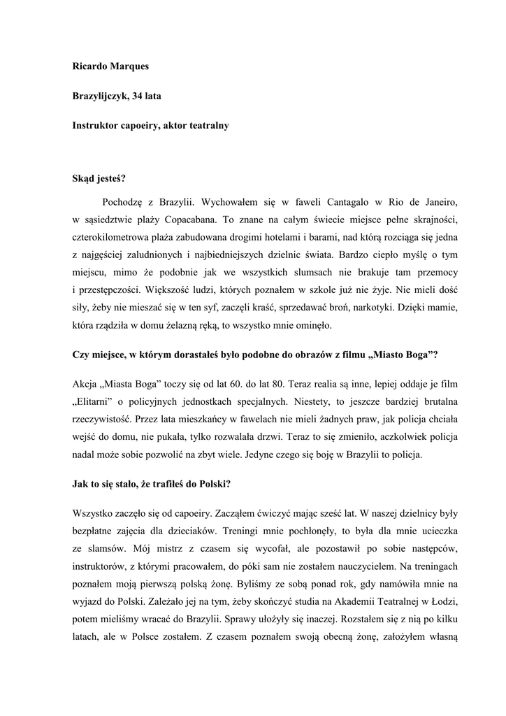 Ricardo Marques Brazylijczyk, 34 lata Instruktor capoeiry, aktor teatralny Skąd jesteś? Pochodzę z Brazylii. Wychowałem się w faweli Cantagalo w Rio de Janeiro, w sąsiedztwie plaży Copacabana. To znane na całym świecie miejsce pełne skrajności, czterokilometrowa plaża zabudowana drogimi hotelami i barami, nad którą rozciąga się jedna z najgęściej zaludnionych i najbiedniejszych dzielnic świata. Bardzo ciepło myślę o tym miejscu, mimo że podobnie jak we wszystkich slumsach nie brakuje tam przemocy i przestępczości. Większość ludzi, których poznałem w szkole już nie żyje. Nie mieli dość siły, żeby nie mieszać się w ten syf, zaczęli kraść, sprzedawać broń, narkotyki. Dzięki mamie, która rządziła w domu żelazną ręką, to wszystko mnie ominęło. Czy miejsce, w którym dorastałeś było podobne do obrazów z filmu „Miasto Boga”? Akcja „Miasta Boga” toczy się od lat 60. do lat 80. Teraz realia są inne, lepiej oddaje je film „Elitarni” o policyjnych jednostkach specjalnych. Niestety, to jeszcze bardziej brutalna rzeczywistość. Przez lata mieszkańcy w fawelach nie mieli żadnych praw, jak policja chciała wejść do domu, nie pukała, tylko rozwalała drzwi. Teraz to się zmieniło, aczkolwiek policja nadal może sobie pozwolić na zbyt wiele. Jedyne czego się boję w Brazylii to policja. Jak to się stało, że trafiłeś do Polski? Wszystko zaczęło się od capoeiry. Zacząłem ćwiczyć mając sześć lat. W naszej dzielnicy były bezpłatne zajęcia dla dzieciaków. Treningi mnie pochłonęły, to była dla mnie ucieczka ze slamsów. Mój mistrz z czasem się wycofał, ale pozostawił po sobie następców, instruktorów, z którymi pracowałem, do póki sam nie zostałem nauczycielem. Na treningach poznałem moją pierwszą polską żonę. Byliśmy ze sobą ponad rok, gdy namówiła mnie na wyjazd do Polski. Zależało jej na tym, żeby skończyć studia na Akademii Teatralnej w Łodzi, potem mieliśmy wracać do Brazylii. Sprawy ułożyły się inaczej. Rozstałem się z nią po kilku latach, ale w Polsce zostałem. Z czasem poznałem swoją obecną żonę, założyłem własną działalność gospodarczą, uczę capoeiry, mam w Polsce dwójkę dzieci. Na razie nie planuję powrotu. Od początku zamierzałeś uczyć w Polsce capoeiry? Tak. Zajmowałem się tym całe życie, kończyłem kursy instruktorskie, między innymi specjalistyczne kursy dotyczące pracy z dziećmi. Moja dziewczyna była po szkole baletowej, miała pomóc mi nawiązać w Warszawie kontakty. Nie miałeś problemów z uzyskaniem wizy? Dostałem trzymiesięczną wizę turystyczną. Na osiem dni przed jej wygaśnięciem wzięliśmy ślub. W Urzędzie do Spraw Cudzoziemców musieliśmy przejść rozmowy, które miały sprawdzić wiarygodność naszego związku. To było okropne. Czujesz się jak na przesłuchaniu, urzędnicy pytają o rzeczy, na które człowiek nie zwraca uwagi. Co moja żona jadła trzy dni temu na śniadanie. Skąd mam wiedzieć? Nie pamiętam co sam jadłem, a co dopiero moja żona. Biurokracja niewiarygodna. A jak wyglądała Twoja droga zawodowa? Na początku pewną przeszkodą był język. Robiłem zakupy tylko w supermarketach samoobsługowych, a na zajęciach potrzebowałem tłumacza. Kiedy moja żona wyjechała do Łodzi kończyć studia, byłem zdany tylko na siebie. Chodziłem wszędzie ze słownikiem, ale dałem radę. Doszlifowałem też angielski. Dzisiaj posługuję się w mowie i piśmie polskim, angielskim, hiszpańskim i portugalskim. Dosyć szybko zacząłem prowadzić swoja pierwszą grupę. Teraz pracuję głównie z dziećmi. Prowadzę zajęcia w przedszkolach, a nawet żłobkach. Na bazie capoeiry prowadzę zajęcia ułatwiające dzieciom poznanie własnego ciała. Mało kto wie, jak jest silny i... kruchy jednocześnie. Gdy na zajęciach w Wyższej Szkole Pedagogicznej powiedziałem uczestnikom, że będziemy stawać na rękach nie wierzyli, że są w stanie to zrobić. Wydaje mi się, że częściowo wynika to z różnic w wychowaniu dzieci w Polsce i w Brazylii. Na czym one polegają? Odnoszę wrażenie, że w Polsce rodzice bardzo boją się o swoje dzieci. U nas dzieciaki dużo czasu spędzają na ulicy. Może nie są tak zadbane, ale mają dużo swobody, biegają po podwórkach, uczą się od rówieśników. Mają szansę spróbować wielu rzeczy. Ja nauczyłem się robić salto od kolegów. Rodzice w Polsce są trochę nadopiekuńczy, boją się o swoje dzieci i w efekcie te dzieci też się boją. W ramach cyklu spotkań „Rodzinne niedziele” w kinie Muranów prowadziłem warsztaty dla rodzin. Kiedy prosiłem rodziców, żeby asekurowali swoje dzieci podczas chodzenia na rękach, widziałem, że w oczach niektórych maluje się groza. Jedna z matek, ignorując moje kompetencje i wieloletnie doświadczenie, próbowała przekonać mnie, że takie ćwiczenia niechybnie prowadzą do śmierci. Zresztą miałem okazję oglądać jak wygląda wychowanie fizyczne w polskich szkołach państwowych i powiem szczerze, to jest... skandal. Jakie jeszcze różnice kulturowe dostrzegasz? Generalizując, Polacy są bardziej zamknięci w sobie niż Brazylijczycy, bardziej formalni. To oficjalne podejście czuć nawet w stosunku do znajomych. W Brazylii jeżeli mijasz czyjś dom i nie zapukasz mogą się na ciebie obrazić, tymczasem w Polsce pojawienie się u kogoś bez uprzedzenia może być odebrane jako robienie kłopotu gospodarzom. Dzisiaj już mam to przerobione, nawet sam się zrobiłem bardziej oficjalny, ale pierwsze święta Bożego Narodzenia, to był dla mnie największy szok kulturowy w życiu. U nas święta są po to, żeby odwiedzić wszystkich, których się lubi. Chodzi się od domu do domu i u każdego trzeba spróbować przynajmniej jednej potrawy. Kiedy się okazało, że w Polsce spędza się Boże Narodzenie w domu, w otoczeniu najbliższej rodziny nie mogłem w to uwierzyć. Przecież to miały b
