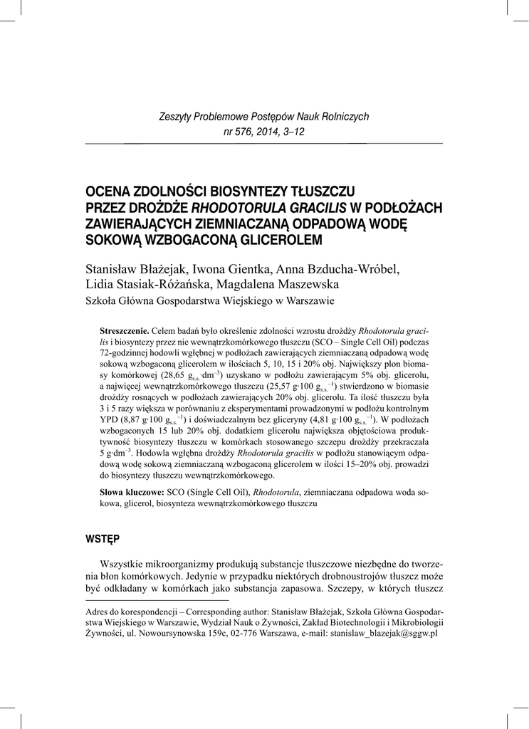 Zeszyty Problemowe Postępów Nauk Rolniczych nr 576, 2014, 3–12 OCENA ZDOLNOŚCI BIOSYNTEZY TŁUSZCZU PRZEZ DROŻDŻE RHODOTORULA GRACILIS W PODŁOŻACH ZAWIERAJĄCYCH ZIEMNIACZANĄ ODPADOWĄ WODĘ SOKOWĄ WZBOGACONĄ GLICEROLEM Stanisław Błażejak, Iwona Gientka, Anna Bzducha-Wróbel, Lidia Stasiak-Różańska, Magdalena Maszewska Szkoła Główna Gospodarstwa Wiejskiego w Warszawie Streszczenie. Celem badań było określenie zdolności wzrostu drożdży Rhodotorula gracilis i biosyntezy przez nie wewnątrzkomórkowego tłuszczu (SCO – Single Cell Oil) podczas 72-godzinnej hodowli wgłębnej w podłożach zawierających ziemniaczaną odpadową wodę sokową wzbogaconą glicerolem w ilościach 5, 10, 15 i 20% obj. Największy plon biomasy komórkowej (28,65 gs.s.·dm–3) uzyskano w podłożu zawierającym 5% obj. glicerolu, a najwięcej wewnątrzkomórkowego tłuszczu (25,57 g·100 gs.s.–1) stwierdzono w biomasie drożdży rosnących w podłożach zawierających 20% obj. glicerolu. Ta ilość tłuszczu była 3 i 5 razy większa w porównaniu z eksperymentami prowadzonymi w podłożu kontrolnym YPD (8,87 g·100 gs.s.–1) i doświadczalnym bez gliceryny (4,81 g·100 gs.s.–1). W podłożach wzbogaconych 15 lub 20% obj. dodatkiem glicerolu największa objętościowa produktywność biosyntezy tłuszczu w komórkach stosowanego szczepu drożdży przekraczała 5 g·dm–3. Hodowla wgłębna drożdży Rhodotorula gracilis w podłożu stanowiącym odpadową wodę sokową ziemniaczaną wzbogaconą glicerolem w ilości 15–20% obj. prowadzi do biosyntezy tłuszczu wewnątrzkomórkowego. Słowa kluczowe: SCO (Single Cell Oil), Rhodotorula, ziemniaczana odpadowa woda sokowa, glicerol, biosynteza wewnątrzkomórkowego tłuszczu WSTĘP Wszystkie mikroorganizmy produkują substancje tłuszczowe niezbędne do tworzenia błon komórkowych. Jedynie w przypadku niektórych drobnoustrojów tłuszcz może być odkładany w komórkach jako substancja zapasowa. Szczepy, w których tłuszcz Adres do korespondencji – Corresponding author: Stanisław Błażejak, Szkoła Główna Gospodarstwa Wiejskiego w Warszawie, Wydział Nauk o Żywności, Zakład Biotechnologii i Mikrobiologii Żywności, ul. Nowoursynowska 159c, 02-776 Warszawa, e-mail: [email protected] 4 S. Błażejak, I. Gientka, A. Bzducha-Wróbel i inni może stanowić więcej niż 20% suchej substancji biomasy nazywa się „olejogennymi” (ang. oleaginous) [Ratledge 2002, Ratledge 2004, Karatay i Donmez 2010]. Produkcja olejów pochodzenia mikrobiologicznego SCO (ang. Single Cell Oil), w porównaniu do otrzymywanych z tradycyjnych surowców roślinnych lub zwierzęcych, niesie ze sobą wiele korzyści. Jest niezależna od klimatu, wymaga stosunkowo niewiele pracy ludzkiej, cykl produkcji jest krótki, a skład kwasów tłuszczowych może być modyfikowany zmianami parametrów środowiska hodowlanego biomasy [Komorowski i Błażejak 2011]. Ze względu na zawartość wielonienasyconych kwasów tłuszczowych, olej mikrobiologiczny może być stosowany jako dodatek do preparatów w żywieniu ludzi lub w postaci biomasy komórkowej, jako wysokoenergetyczny dodatek paszowy dla zwierząt. Spośród poznanych szczepów drożdży olejogennych większość należy do rodzajów Cryptococcus, Lipomyces, Candida, Yarrowia i Rhodotorula [Li i in. 2008, Ageitos i in. 2011]. Drożdże z gatunku Rhodotorula gracilis są anamorficzną formą Rhodosporidium toruloides, zaliczaną do rodziny Sporidiobolaceae, rzędu Sporidiales, klasy Urediniomycetes i gromady podstawczaków (Basidiomycota) w królestwie grzybów (Fungi) [Fell i in. 1998]. Poza biosyntezą karotenoidów (beta-karoten, torulen, torularodyna), które nadają koloniom różowo-łososiowe zabarwienie, wykazują szczególną zdolność wewnątrzkomórkowego gromadzenia tłuszczu jako substancji zapasowej [Buzzini i in. 2007, Saenge i in. 2011]. Biosynteza lipidów w komórkach drożdży olejogennych rozpoczyna się zazwyczaj w obecności dużej zawartości źródła węgla w podłożu oraz ograniczonego dostępu do źródła azotu. Niedobór azotu prowadzi do zmniejszenia aktywności dehydrogenazy izocytrynianowej w cyklu Krebsa i zwiększonej produkcji cytrynianu, który poprzez błonę mitochondrialną zostaje przeniesiony do cytozolu komórkowego. Warto zaznaczyć, iż w komórkach drożdży olejogennych zawartość cytrynianu jest 3–4-krotnie wyższa niż u tych o niewielkiej zdolności do biosyntezy lipidów, a dodatkowo obecne są cytoplazmatyczne liazy cytrynianowe [Evans i in. 1983]. Następnie cytrynian w cytozolu ulega przekształceniu do acetylo-CoA przy udziale liazy ATP-cytrynianowej. W kolejnym etapie karboksylacja acetylo-CoA (wymaga witamin z grupy B, zwłaszcza biotyny) prowadzi do powstania malonylo-CoA, który wraz z drugą cząsteczką acetylo-CoA są substratami w syntezie łańcucha kwasów tłuszczowych. Proces syntezy tłuszczu w postaci trójglicerydów w komórkach drożdży zachodzi w ciałkach lipidowych, tzw. LB (ang. Lipid Bodies), oraz retikulum endoplazmatycznym [Ageitos i in. 2011]. Pozyskiwanie tłuszczu mikrobiologicznego z olejogennych szczepów drożdży z wykorzystaniem alternatywnych źródeł przyswajalnych form węgla, azotu, fosforu i składników mineralnych może być jednym ze sposobów utylizacji odpadów przemysłowych. Rolę podstawowych składników pożywki do hodowli drobnoustrojów mogą spełniać odpadowa gliceryna z produkcji biodiesla i odpadowa ziemniaczana woda sokowa. Produkcja biodiesla w warunkach krajowych osiągnęła poziom ok. 500 tys. ton, co wygenerowało ok. 100 tys. ton fazy glicerynowej zawierającej 50–60% gliceryny [Borychowski 2012]. Jednocześnie w ostatnich latach roczna produkcja skrobi ziemniaczanej kształtuje się na poziomie ok. 100–150 tys. ton, co z kolei wymaga zagospodarowania odpadowej wody sokowej powstającej po termiczno-kwasowej koagulacji białek z soku ziemniaczanego. Zeszyty Problemowe Postępó