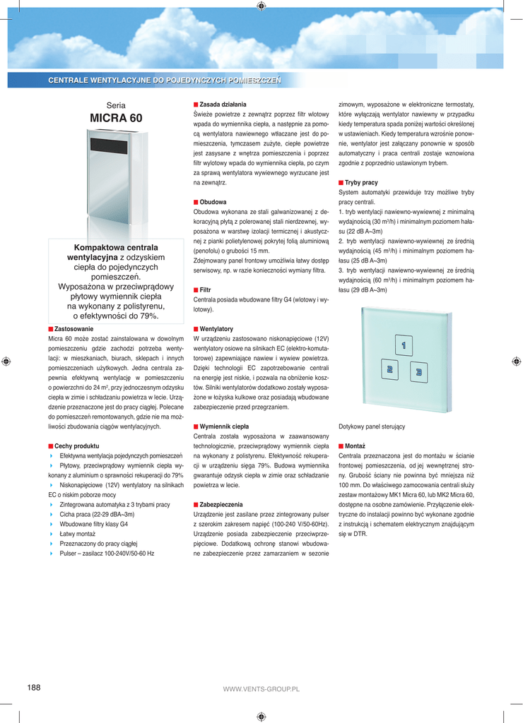 CENTRALE WENTYLACYJNE DO POJEDYNCZYCH POMIESZCZEŃ Seria MICRA 60 Kompaktowa centrala wentylacyjna z odzyskiem ciepła do pojedynczych pomieszczeń. Wyposażona w przeciwprądowy płytowy wymiennik ciepła na wykonany z polistyrenu, o efektywności do 79%. Zastosowanie Micra 60 może zostać zainstalowana w dowolnym pomieszczeniu gdzie zachodzi potrzeba wentylacji: w mieszkaniach, biurach, sklepach i innych pomieszczeniach użytkowych. Jedna centrala zapewnia efektywną wentylację w pomieszczeniu o powierzchni do 24 m2, przy jednoczesnym odzysku ciepła w zimie i schładzaniu powietrza w lecie. Urządzenie przeznaczone jest do pracy ciągłej. Polecane do pomieszczeń remontowanych, gdzie nie ma możliwości zbudowania ciągów wentylacyjnych. Cechy produktu Efektywna wentylacja pojedynczych pomieszczeń Płytowy, przeciwprądowy wymiennik ciepła wykonany z aluminium o sprawności rekuperacji do 79% Niskonapięciowe (12V) wentylatory na silnikach EC o niskim poborze mocy Zintegrowana automatyka z 3 trybami pracy Cicha praca (22-29 dBA~3m) Wbudowane filtry klasy G4 Łatwy montaż Przeznaczony do pracy ciągłej Pulser – zasilacz 100-240V/50-60 Hz 188 Zasada działania Świeże powietrze z zewnątrz poprzez filtr wlotowy wpada do wymiennika ciepła, a następnie za pomocą wentylatora nawiewnego wtłaczane jest do pomieszczenia, tymczasem zużyte, ciepłe powietrze jest zasysane z wnętrza pomieszczenia i poprzez filtr wylotowy wpada do wymiennika ciepła, po czym za sprawą wentylatora wywiewnego wyrzucane jest na zewnątrz. Obudowa Obudowa wykonana ze stali galwanizowanej z dekoracyjną płytą z polerowanej stali nierdzewnej, wyposażona w warstwę izolacji termicznej i akustycznej z pianki polietylenowej pokrytej folią aluminiową (penofolu) o grubości 15 mm. Zdejmowany panel frontowy umożliwia łatwy dostęp serwisowy, np. w razie konieczności wymiany filtra. Filtr Centrala posiada wbudowane filtry G4 (wlotowy i wy- zimowym, wyposażone w elektroniczne termostaty, które wyłączają wentylator nawiewny w przypadku kiedy temperatura spada poniżej wartości określonej w ustawieniach. Kiedy temperatura wzrośnie ponownie, wentylator jest załączany ponownie w sposób automatyczny i praca centrali zostaje wznowiona zgodnie z poprzednio ustawionym trybem. Tryby pracy System automatyki przewiduje trzy możliwe tryby pracy centrali. 1. tryb wentylacji nawiewno-wywiewnej z minimalną wydajnością (30 m3/h) i minimalnym poziomem hałasu (22 dB A~3m) 2. tryb wentylacji nawiewno-wywiewnej ze średnią wydajnością (45 m3/h) i minimalnym poziomem hałasu (25 dB A~3m) 3. tryb wentylacji nawiewno-wywiewnej ze średnią wydajnością (60 m3/h) i minimalnym poziomem hałasu (29 dB A~3m) lotowy). Wentylatory W urządzeniu zastosowano niskonapięciowe (12V) wentylatory osiowe na silnikach EC (elektro-komutatorowe) zapewniające nawiew i wywiew powietrza. Dzięki technologii EC zapotrzebowanie centrali na energię jest niskie, i pozwala na obniżenie kosztów. Silniki wentylatorów dodatkowo zostały wyposażone w łożyska kulkowe oraz posiadają wbudowane zabezpieczenie przed przegrzaniem. Wymiennik ciepła Centrala została wyposażona w zaawansowany technologicznie, przeciwprądowy wymiennik ciepła na wykonany z polistyrenu. Efektywność rekuperacji w urządzeniu sięga 79%. Budowa wymiennika gwarantuje odzysk ciepła w zimie oraz schładzanie powietrza w lecie. Zabezpieczenia Urządzenie jest zasilane przez zintegrowany pulser z szerokim zakresem napięć (100-240 V/50-60Hz). Urządzenie posiada zabezpieczenie przeciwprzepięciowe. Dodatkową ochronę stanowi wbudowane zabezpieczenie przez zamarzaniem w sezonie WWW.VENTS-GROUP.PL Dotykowy panel sterujący Montaż Centrala przeznaczona jest do montażu w ścianie frontowej pomieszczenia, od jej wewnętrznej strony. Grubość ściany nie powinna być mniejsza niż 100 mm. Do właściwego zamocowania centrali służy zestaw montażowy MK1 Micra 60, lub MK2 Micra 60, dostępne na osobne zamówienie. Przyłączenie elektryczne do instalacji powinno być wykonane zgodnie z instrukcją i schematem elektrycznym znajdującym się w DTR. WWW.VENTS-GROUP.PL Charakterystyki techniczne: MICRA 60 Tryby pracy 1 2 Napięcie (V) 3 100-240/50-60 Hz Moc (W) 4,2 9,6 15,4 Pobór prądu (A) 0,02 0,04 0,07 Wydajność (m /h) 3 Prędkość obrotowa (min-1) Poziom hałasu [dB (A) ~3m] Klasa bezpieczeństwa 30 45 60 1165 1720 2685 22 25 29 IP 22 IP 22 IP 22 Wymiary (mm): 181 395 MICRA 522 122 MK1 Micra 60: Służy do ułatwienia montażu centrali i zapewnienia urządzeniu idealnego dopasowania wszystkich elementów. Zestaw zawiera: Dwa kanały wentylacyjne z PCV o śr. 125 mm i długości 500 mm Kartonowe płyty montażowe (2 szt.) NB Micra 60 Podwójny metalowy wylot zewnętrzny z okapem. WWW.VENTS-GROUP.PL SYSTEMY WENTYLACJI DO POJEDYNCZYCH POMIESZCZEŃ Akcesoria MK2 Micra 60: Dwa kanały wentylacyjne z PCV o śr. 125 mm i długości 500 mm Kartonowe płyty montażowe (2 szt) Podwójny metalowy wylot zewnętrzny z okapem 189