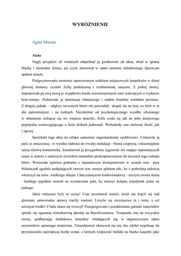 WYRÓŻNIENIE Agata Marzec Niobe Nagły przypływ sił witalnych odepchnął ją gwałtownie od okna, ubrał w spraną bluzkę i niemodne dżinsy, po czym skierował w samo centrum zaludnionego lipcowym upałem miasta. Pielgrzymowanie misternie opracowanym szlakiem miejscowych lumpeksów w dzień głównej dostawy czyniło Zofię podnieconą i rozdrażnioną zarazem. Z jednej strony, imponowała jej swą mocą ta wyjątkowa horda zezwierzęconych istot walczących o wydarcie byle-szmaty. Podniecała ją dominacja silniejszego i cudnie brutalna werbalna przemoc. Z drugiej jednak – odgłosy toczonych bitew nie pozwalały skupić się na tym, co było w te dni najważniejsze – na trofeach. Niezależnie od psychologicznego wysiłku włożonego w stłumienie rodzącej się we wnętrzu anarchii, Zofia czuła się jak na polu dziejowego pojedynku rozstrzygającego o losie dzikich jednostek. Wzbudzały one zarówno litość, jak i zgrozę. Spotykała tego dnia na szlaku samoistne nagromadzenie osobliwości. Ciekawiła ją pani ze zniszczoną - w wyniku słabości do trwałej ondulacji - blond czupryną i nieumiejętnie użytą różową konturówką. Zastanawiał ją przygarbiony jegomość nie mający najmniejszych szans w starciu z samiczym żywiołem naturalnie predysponowanym do toczenia tego rodzaju bitew. Wzruszała sędziwa grubaska z tajemniczym dostojeństwem w oczach oraz para bliźniaczek zgodnie podążających zawsze tym samym splotem ulic, by z podwójną radością wkroczyć na teren wielkiego sklepu. Charyzmatyczni konkwistadorzy - niczym zwarta armia - każdego tygodnia wracali na wyznaczone pole, by stoczyć kolejny pojedynek jeden na jednego. Jakże mityczne były to sceny! Czas przestawał istnieć, świat nie kręcił się nad głowami, uniwersalne sprawy traciły wartość. Liczyło się zwycięstwo tu i teraz, a cel uświęcał środki! Z ładu chaos się tworzył! Posegregowane i pooddzielane gatunki materiałów splotły się ogromną różnobarwną płachtę na Bucefocentaura. Trzepotała ona na wszystkie strony, podburzając dodatkowo instynkty władających nią w orgiastycznym tańcu uczestników upiornego misterium. Triumfatorem okazywał się ten, kto zdołał wepchnąć do przymierzalni największą liczbę szmat, z których większość trafiała na biurko kasjerki jako odpowiadająca wyjątkowo elastycznym parametrom agresora. Nauczone pokory pakowaczki uwijały się bez słowa jak mrówki i tylko niezmienny wyraz ich twarzy decydował o panowaniu kobiet nad tłumem. Towarzystwo wewnątrz tego wielkiego magazynu przebrań i form było wyjątkowo głośne, czego Zofia nie potrafiła zrozumieć. Należało przecież skupić siły na wyrywaniu, przepychaniu się, odtrącaniu i barykadowaniu. Tymczasem wokół rozlegał się rozpraszający czyny bazarowy szmer rozmów lub monologów. Zofia odważyła się zbliżyć do blond czupryny, żeby wsłuchać się w treść wypowiadanych przez nią magicznych zaklęć. Niestety, najwyraźniej nie była godna współuczestniczenia w tajemnicy. Wataha wygłodniałych sępów napierała na nią coraz silniej. Oddaliła się więc od epicentrum i wylądowała przy zakurzonych płaszczach rozwieszonych na drewnianych wieszakach. Fetor wydobywał się z nich potworny, ale Zofia czuła się w tym miejscu dobrze. Stopniowo oddalając się od rozszalałej masy, mimowolnie stała się świadkiem komicznej sytuacji, która rozegrała się przy największej przymierzalni. Otóż zdarzyło się, że w chwili, gdy blond czupryna wtargnęła na teren intymny wyznaczony przez ciemnozieloną kurtynę i zaczęła przymierzać z trudem zdobyte kostiumy, obok niej pojawiła się nagle przed lustrem spocona emerytka, zakładając na głowę pomięty niegdyś-kapelusz. Wrzask rozległ się przeraźliwy, blondyna stała przed twarzami ciekawskich w samej bieliźnie, obnażając wszystkie niedoskonałości swego ciała. Zastygła w zawstydzeniu, próbując nerwowo zakrywać dłońmi najbardziej zniekształcone partie luźnego fantomu. A gapili się wszyscy! Jedynie spocona emerytka nie czuła niezręczności sytuacji, wciąż niewinnie oglądając kapelusz, który ledwo mieścił się na jej kwadratowej głowie. Coś tam do siebie szeptała, poprawiła lustro, w końcu zdjęła opieszale nakrycie, wrzuciła je na kupę szmat w drewnianej skrzyni i powędrowała dalej. Ale blondyna nie dała za wygraną, przyspieszyła kroku i udała się za nią, wykrzykując raz po raz niecenzuralne słowa i wymachując rękoma. A wszystko w pięknej oprawie zszarzałego stanika i odsłaniających lewy pośladek majtek. Tylko ciemnozielona kurtyna kpiąco powiewała, odbijając swoje chytre spojrzenie w lustrze. Nikt nie zwrócił uwagi na staruszkę, która odważyła się złamać prawa kolejki i skorzystać z poczucia poszanowania wieku, którego to obecność prawdopodobnie wyczuła instynktownie u blond damy. Niestety, przyszło jej drogo zapłacić za naiwną wiarę w ludzką dobroć - w ciągu zaledwie kilku sekund od pechowego zajścia została wyproszona z – bądź co bądź – kulturalnego lokalu. Blondyna zaatakowała w asyście całego personelu. Zwołany naprędce sąd zakończył się banicją. W kolejce do luster działy się zwykle rzeczy najciekawsze. Zofia uwielbiała brać udział w pojedynkach na spojrzenia. Doszła do wniosku, że mit o mężczyznach-wzrokowcach wyrósł z niedocenienia zdolności kobiet w tej materii. Podczas gdy mężczyźni sycili zmysły kształtami, kolorami i obfitością, kobiety przenikały zjawiska, wybiegały w najrozmaitsze konteksty, sięgały istoty niewidzialnego. Bez wahania jednym spojrzeniem diagnozowały status majątkowy kolejkowicza, jego pozycję społeczną, stopień przebojowości, poziom satysfakcji z życia, a nawet (o zgrozo!) możliwości intelektualne. Te ostatnie i tak nie miały znaczenia w opartym na prawach siły świecie pstrokatych szmat. Sztylety pojawiające się w kolorowych tęczów