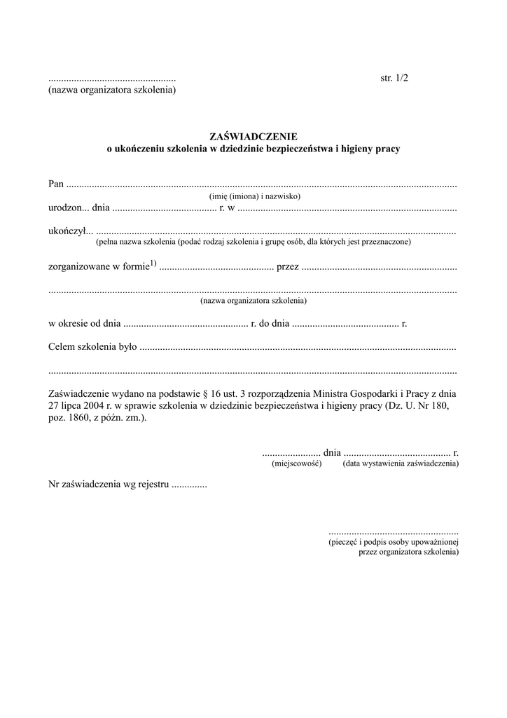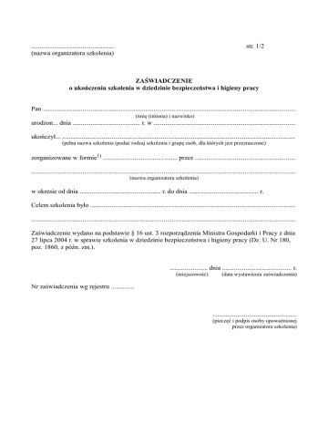 .................................................. (nazwa organizatora szkolenia) str. 1/2 ZAŚWIADCZENIE o ukończeniu szkolenia w dziedzinie bezpieczeństwa i higieny pracy Pan ......................................................................................................................................................... (imię (imiona) i nazwisko) urodzon... dnia ......................................... r. w ...................................................................................... ukończył... ............................................................................................................................................. (pełna nazwa szkolenia (podać rodzaj szkolenia i grupę osób, dla których jest przeznaczone) zorganizowane w formie1) ............................................. przez ............................................................. ................................................................................................................................................................ (nazwa organizatora szkolenia) w okresie od dnia ................................................. r. do dnia .......................................... r. Celem szkolenia było ............................................................................................................................ ................................................................................................................................................................ Zaświadczenie wydano na podstawie § 16 ust. 3 rozporządzenia Ministra Gospodarki i Pracy z dnia 27 lipca 2004 r. w sprawie szkolenia w dziedzinie bezpieczeństwa i higieny pracy (Dz. U. Nr 180, poz. 1860, z późn. zm.). ....................... dnia .......................................... r. (miejscowość) (data wystawienia zaświadczenia) Nr zaświadczenia wg rejestru .............. ................................................... (pieczęć i podpis osoby upoważnionej przez organizatora szkolenia) str. 2/2 Tematyka szkolenia Lp. Temat szkolenia Liczba godzin zajęć teoretycznych Liczba godzin zajęć praktycznych (wykładów) (ćwiczeń) Razem: ______ 1) Wpisać nazwę formy szkolenia zgodnie z § 13 ust. 1 oraz § 15 ust. 1 i 2 rozporządzenia Ministra Gospodarki i Pracy z dnia 27 lipca 2004 r. w sprawie szkolenia w dziedzinie bezpieczeństwa i higieny pracy (Dz. U. Nr 180, poz. 1860, z późn. zm.).