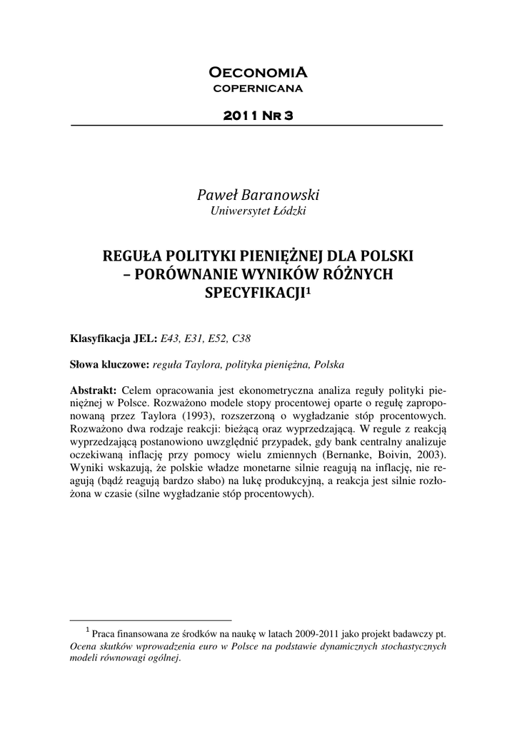 OeconomiA copernicana 2011 Nr 3 Paweł Baranowski Uniwersytet Łódzki REGUŁA POLITYKI PIENIĘŻNEJ DLA POLSKI – PORÓWNANIE WYNIKÓW RÓŻNYCH SPECYFIKACJI1 Klasyfikacja JEL: E43, E31, E52, C38 Słowa kluczowe: reguła Taylora, polityka pieniężna, Polska Abstrakt: Celem opracowania jest ekonometryczna analiza reguły polityki pieniężnej w Polsce. Rozważono modele stopy procentowej oparte o regułę zaproponowaną przez Taylora (1993), rozszerzoną o wygładzanie stóp procentowych. Rozważono dwa rodzaje reakcji: bieżącą oraz wyprzedzającą. W regule z reakcją wyprzedzającą postanowiono uwzględnić przypadek, gdy bank centralny analizuje oczekiwaną inflację przy pomocy wielu zmiennych (Bernanke, Boivin, 2003). Wyniki wskazują, że polskie władze monetarne silnie reagują na inflację, nie reagują (bądź reagują bardzo słabo) na lukę produkcyjną, a reakcja jest silnie rozłożona w czasie (silne wygładzanie stóp procentowych). 1 Praca finansowana ze środków na naukę w latach 2009-2011 jako projekt badawczy pt. Ocena skutków wprowadzenia euro w Polsce na podstawie dynamicznych stochastycznych modeli równowagi ogólnej. 6 Paweł Baranowski MONETARY POLICY RULE FOR POLAND – RESULTS FOR VARIOUS SPECIFACTIONS JEL Classification Codes: E43, E31, E52, C38 Keywords: Taylor Rule, monetary policy, Poland Abstract: The aim of the paper is to analyse monetary policy rules for Poland. We estimate models based on the proposition of Taylor (1993), augmented with interest rate smoothing. We deal with the case of instantaneous as well as forwardlooking relationship between interest rate and inflation. In the latter case, the proposition of data-rich reaction function (Bernanke and Boivin, 2003) was also considered. The evidence show that Polish monetary authority reaction to inflation is strong, contrary to the output gap. In addition, we found strong interest smoothing, which implies time-distributed response of the interest rate. WPROWADZENIE Jednym z kluczowych elementów dynamicznych modeli stochastycznych opartych o paradygmant nowej ekonomii keynesistowskiej jest reguła polityki pieniężnej. Równanie to stanowi domknięcie nominalne modelu, zapewniające samoczynny powrót systemu do równowagi. W zdecydowanej większości prac korzysta się z reguły zaproponowanej przez Taylora (1993). Celem opracowania jest oszacowanie parametrów reguły Taylora dla Polski w wariancie standardowym, w którym władze monetarne reagują na bieżące wartości zmiennych oraz „wyprzedzającym” (forward looking), gdzie występuje reakcja na oczekiwaną inflację. W przypadku reguły forward looking dodatkowo zostanie uwzględnione podejście zaproponowane przez Bernanke i Boivina (2003), pozwalające odzwierciedlić reakcję banku centralnego na wiele zmiennych (data-rich environment) potencjalnie kształtujących przyszłą inflację. REGUŁA TAYLORA – PODSTAWY TEORETYCZNE Reguła Taylora opisuje wahania nominalnych stóp procentowych w zależności od inflacji i luki produkcyjnej. Równanie to w wersji zapro- Reguła polityki pieniężnej dla Polski… 7 ponowanej przez Taylora (1993) posiadało parametry skalibrowane w następującej postaci: i t = 1 + 1,5π t + 0 ,5 x t , (1) gdzie: i – nominalna stopa procentowa, π – stopa inflacji, x – luka produkcyjna. Równanie to stało się punktem wyjścia do innych postaci reguły Taylora. Stosowane obecnie wersje tej reguły zwykle posiadają zmodyfikowaną specyfikację dynamiczną, a ich parametry są estymowane. Jak wskazują modele teoretyczne, ze względu na szeroko rozumianą niepewność (np. co do „prawdziwego” modelu gospodarki lub wynikająca z błędów pomiaru zmiennych) skłania ku ostrożnym, stopniowym reakcjom polityki gospodarczej2. Taki sposób działania banku centralnego, zwany wygładzaniem stóp procentowych (interest rate smoothing), znajduje również potwierdzenie w wielu badaniach empirycznych. Z tego względu specyfikacja dynamiczna uwzględnia wygładzanie stóp procentowych i przedstawia się następująco: ^ i t = i + ρ i t −1 + (1 − ρ )φ π π t + (1 − ρ )φ x x t , (2) gdzie: φ π , φ x – parametry opisujące długookresową reakcję stóp procentowych na odpowiednio: inflację i lukę produkcyjną, ρ – parametr wygładzania stóp procentowych, ^ i – parametr (długookresowa realna stopa procentowa w równowadze). Kolejna modyfikacja pozwala uwzględnić zasadę, że polityka pieniężna powinna być „wyprzedzająca”, tzn. bank centralny powinien kierować się przyszłymi, oczekiwanymi wartościami inflacji3. W ten sposób otrzymujemy regułę Taylora w wariancie „wyprzedzającym” (forward looking). Powstaje oczywiście pytanie, jak odległe oczekiwania powinny być brane pod 2 Ten typ argumentacji zapoczątkował Brainard (1967). Pogląd jest powszechny w literaturze i wynika głównie z faktu, że polityka pieniężna wpływa na inflację z opóźnieniem. 3 8 Paweł Baranowski uwagę przez bank centralny. Z jednej strony horyzont oczekiwań powinien być równy opóźnieniu reakcji gospodarki na zmianę stóp procentowych (co wskazuje na horyzont w granicach 2-6 kwartałów). Z drugiej strony, w miarę wydłużania horyzontu prognozy rośnie jej błąd, co skłania bank centralny do krótszego horyzontu. W niniejszej pracy, podobnie jak w większości prac empirycznych, przyjęto reakcję na inflację oczekiwaną na 1 kwartał naprzód, niemniej jednak założenie to powinno być w przyszłości zweryfikowane empirycznie4. Równanie to, w wersji z omówionym powyżej wygładzaniem stóp procentowych posiada następującą postać: ^ it = i + ρ it −1 + (1 − ρ )φ π E tπ t +1 + (1 − ρ )φ x x t , (3) gdzie: E t – operator racjonalnych oczekiwań. Osobnym przypadkiem rozpatrzonym w opracowaniu jest wariant, w którym bank centralny – pośrednio – reaguje na dużą ilość zmiennych potencjalnie kształtujących inflację. Wariant ten posiada