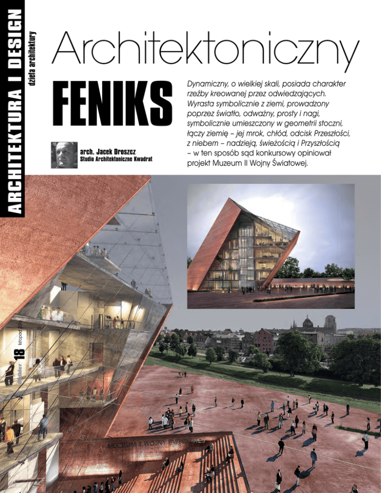 dzieła architektury ARCHITEKTURA I DESIGN listopad 2016 18 Builder Architektoniczny FENIKS arch. Jacek Droszcz Studio Architektoniczne Kwadrat Dynamiczny, o wielkiej skali, posiada charakter rzeźby kreowanej przez odwiedzających. Wyrasta symbolicznie z ziemi, prowadzony poprzez światło, odważny, prosty i nagi, symbolicznie umieszczony w geometrii stoczni, łączy ziemię – jej mrok, chłód, odcisk Przeszłości, z niebem – nadzieją, świeżością i Przyszłością – w ten sposób sąd konkursowy opiniował projekt Muzeum II Wojny Światowej. wego burzenia miasta. W swoich rozważaniach prekoncepcyjnych doszliśmy do wniosku, że żaden obiekt (także Muzeum) stojący w otoczeniu zabytkowych kamienic Głównego Miasta nie powinien z nimi „konkurować”. Powinien być raczej swego rodzaju monumentem – symbolem, w swojej wymowie neutralnym w otoczeniu istniejącej historycznej zabudowy. Stąd pomysł, aby całe Muzeum zanurzyć w ziemi, a ponad nią wydobyć jedynie fragment symbolizujący sprzeciw wobec idei totalitarnych. Wizualizacje arch. Studio Architektoniczne Kwadrat F orma obiektu jest uzewnętrznieniem emocji, jakie wywołał u autorów temat Konkursu. Pomimo tego, że koncepcja przestrzenna Muzeum powstała na bazie emocji związanych z II wojną światową, to nie jest ona w żaden sposób komentarzem do któregokolwiek epizodu wojny, nie jest też próbą przedstawienia jakiejś konkretnej budowli związanej z działaniami wojennymi. Jest po prostu, zewnętrznym wyrazem uczuć, które przeżywa każdy człowiek porażony ogromem tragedii będących wynikiem wojny. Prowadzona przez Hitlera wojna spowodowała wieloletni podział świata na pełnoprawne państwa i ich wasali, na ludzi i „podludzi”, pokryła kontynenty skorupą zniewolenia. Rozerwa- nie tej skorupy nastąpiło dopiero dzięki wspólnemu wysiłkowi zaatakowanych państw. Tę historyczną symbolikę urzeczywistniliśmy w koncepcji Muzeum II Wojny Światowej. Obiekt Muzeum, wyłaniający się spod betonowej skorupy placu i rozrywający ją, ma obrazować sprzeciw wobec totalitaryzmu i konieczność działania przeciwko jego ideom, które za cel stawiają sobie zniewolenie człowieka. Ta śmiała koncepcja przestrzenna jest naszym zdaniem adekwatna do tego, co ma symbolizować, i do rangi miejsca, w którym powstaje. Miejsce w tym wypadku jest szczególnie symboliczne, ponieważ Gdańsk, a w szczególności jego Główne Miasto, został zniszczony w wyniku działań wojennych i celo- Symbolicznym wyrazem związków przeszłości (wojny) z teraźniejszością i przyszłością jest przestrzenny podział Muzeum na trzy strefy: przeszłość – podziemie, teraźniejszość – plac wokół obiektu, przyszłość – nowoczesną w formie dominantę z punktem widokowym. 19 Całe zło wojny ukrywamy pod ziemią, a światełko nadziei dostaje się do środka szczeliną, która powstaje w momencie rozerwania skorupy przykrywającej plac dookoła Muzeum. Właśnie ta szczelina jest osią kompozycyjną całego założenia. Na powierzchni stanowi ona cięcie łączące wnętrze Muzeum ze światem zewnętrznym. Do wnętrza Muzeum wchodzimy pochylnią zawieszoną nad szczeliną, zagłębiając się coraz bardziej w mroczny nastrój podziemia. Takie rozwiązanie głównego wejścia spowoduje stopniową zmianę nastroju zwiedzających: od zwykłej ciekawości, przez wyciszenie, do niepokoju i stanu napięcia emocjonalnego. Ta gradacja emocji jest naszym zdaniem niezbędna do pełnego, świadomego przeżywania i chłonięcia idei antywojennych. Wchodzący do strefy zwiedzania docierają na najniższy po- listopad 2016 Od ciekawości do niepokoju Builder Ogromny budynek taktownie wpisuje się w otoczenie, dając szansę na zostanie ikoną otoczoną ważnymi dla Gdańska elementami historycznymi. Zaproponowane przez autorów minimalne środki architektoniczne z wielką gracją łączą historyczny teren z nowoczesną ideą budynku. Kolor i faktura zaproponowane w projekcie wpisują się z wielką łatwością w koloryt Gdańska, tworząc muzeum na miarę XXI wieku – opinia sądu konkursowego. dzieła architektury ARCHITEKTURA I DESIGN symboliczny wydźwięk – ma prowadzić do przeświadczenia, że propagowanie idei antywojennych daje nadzieję na pokojowe współistnienie ludzi bez względu na poglądy, wyznanie czy rasę. Od Strefy Wejściowej po plac Układ funkcjonalny Muzeum oparliśmy na ogólnym założeniu, że zespoły związane bezpośrednio z funkcjami muzealnymi znajdą się w podziemiach obiektu. I tak umieszczone zostały tam zespoły: Strefy Wejściowej, Sali Konferencyjnej, Sal Wystawowych, Pomieszczeń Technicznych, Pomieszczeń Magazynowych, Parkingów dla zwiedzających (295 MP). W części nadziemnej (dominancie) znalazły się zespoły: Biblioteki i Pomieszczeń Dydaktyczno-Merytorycz- nych. Osobnym obiektem nadziemnym jest jednokondygnacyjny budynek zlokalizowany przy ul. Stara Stocznia, w którym znajdują się Zespół Pomieszczeń Administracyjno-Biurowych oraz Zespół Hotelowy. Całości dopełnia zagospodarowanie terenu, którego głównym elementem jest plac, spełniający funkcje ekspozycyjne, kompozycyjne oraz komunikacyjne (podjazdy dla VIP-ów, autobusów i dostaw). Plac oprócz funkcji kompozycyjnych odgrywa także, w swojej południowej części, rolę powierzchni wystawowych zarezerwowanych dla wystaw plenerowych (znajduje się tam również schron z czasów wojny). Część placu, przylegająca do powierzchni pod wystawy plenerowe, łączy się kompozycyjnie z kanałem Nowej Raduni, gdzie umiejscowiono przystań kajako- Builder 20 listopad 2016 ziom Muzeum (-14 m p.p.t.) i tam rozpoczynają swoją drogę poznania. Szczelina wejściowa wewnątrz budynku przekształca się w oś, na którą nanizany jest program muzeum. Zgodnie ze scenariuszem zwiedzania firmy Tempora zwiedzający przechodzą do coraz to nowych przestrzeni, które obrazują kolejne etapy procesów prowadzący