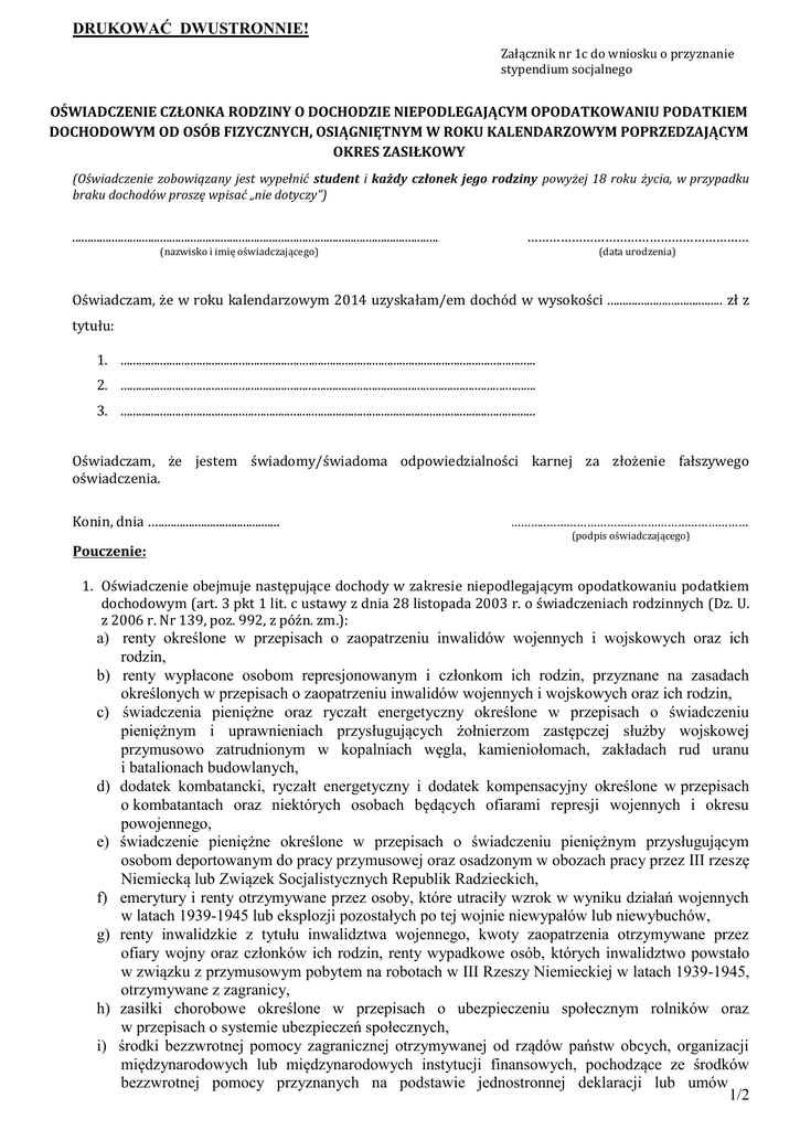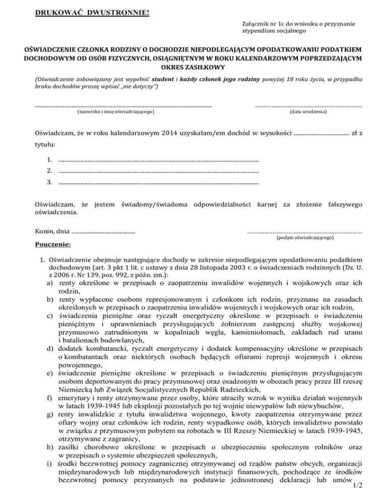DRUKOWAĆ DWUSTRONNIE! Załącznik nr 1c do wniosku o przyznanie stypendium socjalnego OŚWIADCZENIE CZŁONKA RODZINY O DOCHODZIE NIEPODLEGAJĄCYM OPODATKOWANIU PODATKIEM DOCHODOWYM OD OSÓB FIZYCZNYCH, OSIĄGNIĘTNYM W ROKU KALENDARZOWYM POPRZEDZAJĄCYM OKRES ZASIŁKOWY (Oświadczenie zobowiązany jest wypełnić student i każdy członek jego rodziny powyżej 18 roku życia, w przypadku braku dochodów proszę wpisać „nie dotyczy”) ......................................................................................................................... (nazwisko i imię oświadczającego) …………………………………………………… (data urodzenia) Oświadczam, że w roku kalendarzowym 2014 uzyskałam/em dochód w wysokości ...................................... zł z tytułu: 1. ......................................................................................................................................... 2. ......................................................................................................................................... 3. ......................................................................................................................................... Oświadczam, że jestem świadomy/świadoma odpowiedzialności karnej za złożenie fałszywego oświadczenia. Konin, dnia …........................................ Pouczenie: ………..…………………………………………………… (podpis oświadczającego) 1. Oświadczenie obejmuje następujące dochody w zakresie niepodlegającym opodatkowaniu podatkiem dochodowym (art. 3 pkt 1 lit. c ustawy z dnia 28 listopada 2003 r. o świadczeniach rodzinnych (Dz. U. z 2006 r. Nr 139, poz. 992, z późn. zm.): a) renty określone w przepisach o zaopatrzeniu inwalidów wojennych i wojskowych oraz ich rodzin, b) renty wypłacone osobom represjonowanym i członkom ich rodzin, przyznane na zasadach określonych w przepisach o zaopatrzeniu inwalidów wojennych i wojskowych oraz ich rodzin, c) świadczenia pieniężne oraz ryczałt energetyczny określone w przepisach o świadczeniu pieniężnym i uprawnieniach przysługujących żołnierzom zastępczej służby wojskowej przymusowo zatrudnionym w kopalniach węgla, kamieniołomach, zakładach rud uranu i batalionach budowlanych, d) dodatek kombatancki, ryczałt energetyczny i dodatek kompensacyjny określone w przepisach o kombatantach oraz niektórych osobach będących ofiarami represji wojennych i okresu powojennego, e) świadczenie pieniężne określone w przepisach o świadczeniu pieniężnym przysługującym osobom deportowanym do pracy przymusowej oraz osadzonym w obozach pracy przez III rzeszę Niemiecką lub Związek Socjalistycznych Republik Radzieckich, f) emerytury i renty otrzymywane przez osoby, które utraciły wzrok w wyniku działań wojennych w latach 1939-1945 lub eksplozji pozostałych po tej wojnie niewypałów lub niewybuchów, g) renty inwalidzkie z tytułu inwalidztwa wojennego, kwoty zaopatrzenia otrzymywane przez ofiary wojny oraz członków ich rodzin, renty wypadkowe osób, których inwalidztwo powstało w związku z przymusowym pobytem na robotach w III Rzeszy Niemieckiej w latach 1939-1945, otrzymywane z zagranicy, h) zasiłki chorobowe określone w przepisach o ubezpieczeniu społecznym rolników oraz w przepisach o systemie ubezpieczeń społecznych, i) środki bezzwrotnej pomocy zagranicznej otrzymywanej od rządów państw obcych, organizacji międzynarodowych lub międzynarodowych instytucji finansowych, pochodzące ze środków bezzwrotnej pomocy przyznanych na podstawie jednostronnej deklaracji lub umów 1/2 DRUKOWAĆ DWUSTRONNIE! zawartych z tymi państwami, organizacjami lub instytucjami przez Radę Ministrów, właściwego ministra lub agencje rządowe, w tym również w przypadkach, gdy przekazanie tych środków jest dokonywane za pośrednictwem podmiotu upoważnionego do rozdzielenia środków bezzwrotnej pomocy zagranicznej na rzecz podmiotów, którym służyć ma ta pomoc, j) należności ze stosunku pracy lub z tytułu stypendium osób fizycznych mających miejsce zamieszkania na terytorium Rzeczypospolitej Polskiej, przebywających czasowo za granicą – w wysokości odpowiadającej równowartości diet z tytułu podróży służbowej poza granicami kraju ustalonych dla pracowników zatrudnionych w państwowych lub samorządowych jednostkach sfery budżetowej na podstawie ustawy z dnia 26 czerwca 1974 r. – Kodeks pracy (Dz. U. z 2013 r., poz. 1502 z poźn. zm.), k) należności pieniężne wypłacane policjantom, żołnierzom, celnikom i pracownikom jednostek wojskowych i jednostek policyjnych użytych poza granicami państwa w celu udziału w konflikcie zbrojnym lub wzmocnienia sił państwa lub państw sojuszniczych, misji pokojowych, akcji zapobieżenia aktom terroryzmu lub ich skutkom, a także należności pieniężne wypłacone żołnierzom, policjantom, celnikom i pracownikom pełniącym funkcje obserwatorów w misjach pokojowych organizacji międzynarodowych i sił wielonarodowych, l) należności pieniężne ze stosunku służbowego otrzymywane w czasie służby kandydackiej przez funkcjonariuszy Policji, Państwowej Straży Pożarnej, Straży Granicznej i Biura Ochrony Rządu, obliczane za okres, w którym osoby te uzyskały dochód, m) dochody członków rolniczych spółdzielni produkcyjnych z tytułu członkostwa w rolniczej spółdzielni produkcyjnej, pomniejszone o składki na ubezpieczenie społeczne, n) alimenty na rzecz dzieci, o) stypendia doktoranckie i habilitacyjne przyznane na podstawie ustawy z dnia 14 marca 2003 r. o stopniach naukowych i tytule naukowym oraz o stopniach i tytule w zakresie sztuki (Dz. U. Nr 65, poz. 595 z późn. zm.), stypendia doktoranckie określone w art. 200 ustawy z dnia 27 lipca 2005 r. – Prawo o szkolnictwie wyższym (Dz. U. z 2012 r. poz. 572 z późn. zm.), stypendia sportowe przyznane na podstawie ustawy z dnia 25 cze