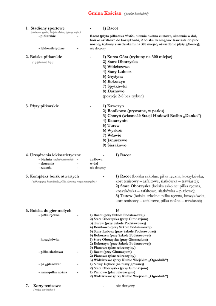 Gmina Kościan 1. Stadiony sportowe - ( powiat kościański) 1) Racot ( boisko – wymiar, bieŜnia okólna, trybuny miejsc ) - piłkarskie - - lekkoatletyczne - 2. Boiska piłkarskie Racot (płyta piłkarska 98x65, bieŜnia okólna ŜuŜlowa, skocznia w dal, boisko asfaltowe do koszykówki, 2 boiska treningowe trawiaste do piłki noŜnej, trybuny z siedziskami na 300 miejsc, oświetlenie płyty głównej); nie dotyczy - 1) Kurza Góra (trybuny na 300 miejsc) 2) Stare Oborzyska 3) Widziszewo 4) Stary Lubosz 5) GryŜyna 6) Kokorzyn 7) Spytkówki 8) Darnowo (pozycje 2-8 bez trybun) - 1) Kawczyn 2) Bonikowo (prywatne, w parku) 3) Choryń (własność Stacji Hodowli Roślin „Danko”) 4) Katarzynin 5) Turew 6) Wyskoć 7) Wławie 8) Januszewo 9) Sierakowo ( z trybunami, bez, ) 3. Płyty piłkarskie 4. Urządzenia lekkoatletyczne - bieŜnia ( rodzaj nawierzchni) - skocznia - rzutnia - - 5. Kompleks boisk otwartych - 1) Racot (boiska szkolne: piłka ręczna, koszykówka, kort tenisowy – asfaltowe, siatkówka – trawiaste); 2) Stare Oborzyska (boiska szkolne: piłka ręczna, koszykówka – asfaltowe, siatkówka – plaŜowe); 3) Turew (boiska szkolne: piłka ręczna, koszykówka, kort tenisowy – asfaltowe, piłka noŜna – trawiaste); - 16 ( piłka ręczna, koszykówka, piłka siatkowa, rodzaj nawierzchni ) 6. Boiska do gier małych - piłka ręczna - - koszykówka - - piłka siatkowa - - ps „plaŜowa” - - mini-piłka noŜna - 7. Korty tenisowe ( rodzaj nawierzchni ) 1) Racot ŜuŜlowa w dal nie dotyczy 1) Racot (przy Szkole Podstawowej) 2) Stare Oborzyska (przy Gimnazjum) 3) Turew (przy Szkole Podstawowej) 4) Bonikowo (przy Szkole Podstawowej) 5) Stary Lubosz (przy Szkole Podstawowej) 6) Kokorzyn (przy Szkole Podstawowej) 1) Stare Oborzyska (przy Gimnazjum) 2) Kokorzyn (przy Szkole Podstawowej) 3) Pianowo (plac rekreacyjny) 1) Racot (przy Gimnazjum) 2) Pianowo (plac rekreacyjny) 3) Widziszewo (przy Klubie Wiejskim „Ogrodnik”) 1) Nowy Dębiec (na plaŜy głównej) 2) Stare Oborzyska (przy Gimnazjum) 1) Pianowo (plac rekreacyjny) 2) Widziszewo (przy Klubie Wiejskim „Ogrodnik”) - nie dotyczy 8. Hale sportowe duŜe - 1) Stare Oborzyska przy Gimnazjum im. Jana Pawła II (trybuny na 300 miejsc); 2) Racot przy Gimnazjum im. Polskich Olimpijczyków (trybuny na 300 miejsc); - nie dotyczy - 1) Bonikowo przy Szkole Podstawowej (bez trybun); 2) Stary Lubosz przy Szkole Podstawowej (bez trybun); - 1) Racot (bez trybun, do Szkoły Podstawowej); - nie dotyczy - nie dotyczy 14. Pływalnie otwarte - nie dotyczy 15. Strzelnice sportowe - 16. Tor kolarski MTB - nie dotyczy - 1) Nowy Dębiec – plaŜa główna nad J. Wonieskim (2 pomosty pływające po 25 m, kąpielisko o szer. 50 m, plaŜa piaszczysta, wypoŜyczalnia sprzętu wodnego – rowery wodne, kajaki, łodzie); - 1) Racot – kryta ujeŜdŜalnia przy Stadninie Koni; 2) Racot – hipodrom Stadniny Koni; 3) Nowy Dębiec – przystań Ŝeglarska Kościańskiego Klubu śeglarskiego; 4) Nowy Dębiec – pole namiotowe i kemping przy Zespole Hotelowo-Gastronomicznym „Niedźwiedź”; ( 44x22 i powyŜej z trybunami, ilość miejsc ) 9. Hale sportowe ( 36x18/19, ilość miejsc ) 10. Sale gimnastyczne ( 24x12 ) 11. Salki gimnastyczne ( 18x9 i mniejsze ) 12. Pawilony sportowe ( w tym specjalistyczne ) 13. Kryte pływalnie ( 25x12,5 ) 1) Widziszewo (strzelnica sportowa do strzelania śrutowego z wiatrówek i pistoletów) ( rodzaj ) 17. Kąpieliska strzeŜone Inne: Sporządził: Mirosław Duda Telefon kontaktowy: (065) 512 – 11 – 25 Data sporządzenia : 27 grudnia 2006r.