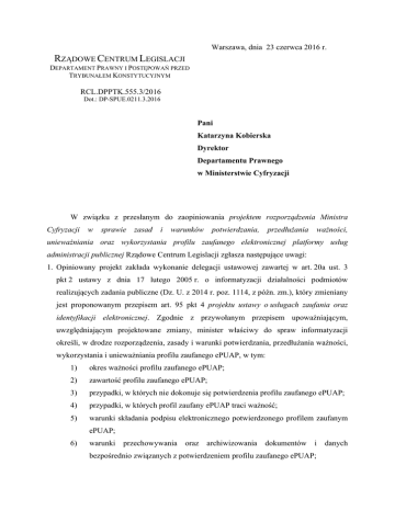 Warszawa, dnia 23 czerwca 2016 r. RZĄDOWE CENTRUM LEGISLACJI DEPARTAMENT PRAWNY I POSTĘPOWAŃ PRZED TRYBUNAŁEM KONSTYTUCYJNYM RCL.DPPTK.555.3/2016 Dot.: DP-SPUE.0211.3.2016 Pani Katarzyna Kobierska Dyrektor Departamentu Prawnego w Ministerstwie Cyfryzacji W związku z przesłanym do zaopiniowania projektem rozporządzenia Ministra Cyfryzacji w sprawie zasad i warunków potwierdzania, przedłużania ważności, unieważniania oraz wykorzystania profilu zaufanego elektronicznej platformy usług administracji publicznej Rządowe Centrum Legislacji zgłasza następujące uwagi: 1. Opiniowany projekt zakłada wykonanie delegacji ustawowej zawartej w art. 20a ust. 3 pkt 2 ustawy z dnia 17 lutego 2005 r. o informatyzacji działalności podmiotów realizujących zadania publiczne (Dz. U. z 2014 r. poz. 1114, z późn. zm.), który zmieniany jest proponowanym przepisem art. 95 pkt 4 projektu ustawy o usługach zaufania oraz identyfikacji elektronicznej. Zgodnie z przywołanym przepisem upoważniającym, uwzględniającym projektowane zmiany, minister właściwy do spraw informatyzacji określi, w drodze rozporządzenia, zasady i warunki potwierdzania, przedłużania ważności, wykorzystania i unieważniania profilu zaufanego ePUAP, w tym: 1) okres ważności profilu zaufanego ePUAP; 2) zawartość profilu zaufanego ePUAP; 3) przypadki, w których nie dokonuje się potwierdzenia profilu zaufanego ePUAP; 4) przypadki, w których profil zaufany ePUAP traci ważność; 5) warunki składania podpisu elektronicznego potwierdzonego profilem zaufanym ePUAP; 6) warunki przechowywania oraz archiwizowania dokumentów i danych bezpośrednio związanych z potwierdzeniem profilu zaufanego ePUAP; 7) wzory wniosku o potwierdzenie, przedłużenie i unieważnienie profilu zaufanego ePUAP; 8) warunki, które powinien spełniać punkt potwierdzający profil zaufany ePUAP; 9) warunki organizacyjne i techniczne dla potwierdzania profilu zaufanego ePUAP przy nieodpłatnym wykorzystaniu środka identyfikacji elektronicznej stosowanego do uwierzytelniania w systemie teleinformatycznym banku krajowego lub innego przedsiębiorcy. Przepisy przedmiotowego rozporządzenia przewidują natomiast szereg regulacji, które swym zakresem wykraczają poza katalog spraw przekazanych do uregulowania w akcie wykonawczym. W tym kontekście należy wskazać przepis: 1) § 1 pkt 6, bowiem wskazuje, że przepisy opiniowanego rozporządzenia określają przechowywanie oraz archiwizowanie dokumentów i danych związanych z potwierdzeniem, przedłużaniem ważności albo unieważnieniem profilu zaufanego ePUAP, podczas gdy delegacja ustawowa przekazała do uregulowania w rozporządzeniu warunki przechowywania oraz archiwizowania jedynie dokumentów i danych związanych z potwierdzeniem profilu zaufanego ePUAP. Analogiczna uwaga dotyczy proponowanego § 18 projektu przewidującego obowiązek przechowywania i archiwizowania dokumentów i danych związanych nie tylko z potwierdzeniem profilu zaufanego ePUAP, ale również z innymi czynnościami dokonywanymi wobec niego. Dodatkowo należy wskazać, iż w § 18 ust. 3 wskazany został również okres, przez który mają być przechowywane przedmiotowe dokumenty, podczas gdy przepis upoważniający nie zawiera dyspozycji w tym zakresie; 2) § 3, w myśl którego „wniosek o potwierdzenie profilu zaufanego ePUAP może złożyć wyłącznie osoba posiadająca pełną zdolność do czynności prawnych”. Proponuje się przeredagowanie omawianej regulacji, tak by wskazywał, iż warunkiem potwierdzenia profilu zaufanego ePUAP jest złożenie wniosku o potwierdzenie tego profilu przez osobę posiadającą pełną zdolność do czynności prawnych; 3) § 9 ust. 3, przewidujący, że „autoryzacja jest dokonywana przy użyciu haseł jednorazowych przesyłanych na wskazany przez użytkownika numer telefonu komórkowego albo środków identyfikacji elektronicznej, stosowanych do uwierzytelniania w systemie teleinformatycznym podmiotu niepublicznego”. Przedmiotowy przepis proponuje się przeredagować i umieścić w § 1 2 omawianego przepisu, jako jeden z elementów jakie zawiera profil zaufany ePUAP. Analogicznego przeredagowania wymagają również § 9 ust. 5-9, § 10 ust. 3, § 12 ust. 5, § 13, § 14 ust. 2, § 17, § 18 ust. 4 oraz § 19 ust. 3 projektowanego rozporządzenia, bowiem obecnie zaproponowana treść tych przepisów budzi zastrzeżenia odnośnie przekroczenia przez nie zakresu delegacji ustawowej. 2. Wątpliwości budzi zaproponowana redakcja § 4 i 5 projektu rozporządzenia, bowiem w § 4 ust. 1 wskazano, że osoba wnioskująca przesyła wniosek na ePUAP, natomiast w § 5 ust. 1 przewiduje, że osoba ta może wniosek złożyć osobiście w punkcie potwierdzającym, dlatego też proponuje się wskazanie w jednym przepisie, że osoba wnioskująca może dokonać potwierdzenia profilu zaufanego ePUAP na wniosek złożony w postaci elektronicznej w ePUAP lub osobiście w punkcie potwierdzającym. Należy przy tym pamiętać również o treści uwagi przedstawionej wyżej do § 3. 3. Projektowaną regulację § 4 ust. 2 proponuje się przenieść do przepisu § 6 określającego elementy procesu potwierdzania profilu zaufanego ePUAP. 4. Proponuje się wskazać rozróżnienie w treści projektowanych przepisów, jakie czynności związane z potwierdzeniem profilu zaufanego ePUAP wykonuje punkt potwierdzający, a jakie jego upoważniony pracownik (§ 6 ust. 2, 4, 6 i 7 projektu). 5. Wskazany na wstępie projekt ustawy w proponowanym art. 20c ust. 1 pkt 2 i 3 ustawy z dnia 17 lutego 2005 r. o informatyzacji działalności podmiotów realizujących zadania publiczne przewiduje m.in obowiązek wskazania „imienia”, natomiast projektowane § 5 ust. 3 pkt 1 oraz § 9 pkt 1 posługują się sformułowaniem „imię (imiona)”. Wobec powyższego proponuje się dostosowanie terminologii projektu do terminologii projektowanych przepisów wskazanej wyżej ustawy. 6. Przepis § 9 ust. 4 wydaje