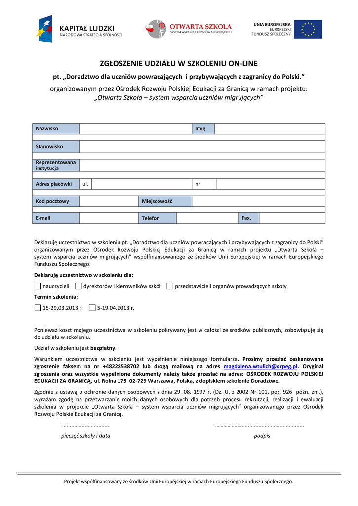 ZGŁOSZENIE UDZIAŁU W SZKOLENIU ON-LINE pt. „Doradztwo dla uczniów powracających i przybywających z zagranicy do Polski.” organizowanym przez Ośrodek Rozwoju Polskiej Edukacji za Granicą w ramach projektu: „Otwarta Szkoła – system wsparcia uczniów migrujących” Nazwisko Imię Stanowisko Reprezentowana instytucja Adres placówki ul. nr Kod pocztowy Miejscowość E-mail Telefon Fax. Deklaruję uczestnictwo w szkoleniu pt. „Doradztwo dla uczniów powracających i przybywających z zagranicy do Polski” organizowanym przez Ośrodek Rozwoju Polskiej Edukacji za Granicą w ramach projektu „Otwarta Szkoła – system wsparcia uczniów migrujących” współfinansowanego ze środków Unii Europejskiej w ramach Europejskiego Funduszu Społecznego. Deklaruję uczestnictwo w szkoleniu dla: nauczycieli dyrektorów i kierowników szkół przedstawicieli organów prowadzących szkoły Termin szkolenia: 15-29.03.2013 r. 5-19.04.2013 r. Ponieważ koszt mojego uczestnictwa w szkoleniu pokrywany jest w całości ze środków publicznych, zobowiązuję się do udziału w szkoleniu. Udział w szkoleniu jest bezpłatny. Warunkiem uczestnictwa w szkoleniu jest wypełnienie niniejszego formularza. Prosimy przesłać zeskanowane zgłoszenie faksem na nr +48228538702 lub drogą mailową na adres [email protected]. Oryginał zgłoszenia oraz wszystkie wypełnione dokumenty należy także przesłać na adres: OŚRODEK ROZWOJU POLSKIEJ EDUKACJI ZA GRANICĄ, ul. Rolna 175 02-729 Warszawa, Polska, z dopiskiem szkolenie Doradztwo. Zgodnie z ustawą o ochronie danych osobowych z dnia 29. 08. 1997 r. (Dz. U. z 2002 Nr 101, poz. 926 późn. zm.), wyrażam zgodę na przetwarzanie moich danych osobowych dla potrzeb procesu rekrutacji, realizacji i ewaluacji szkolenia w projekcie „Otwarta Szkoła – system wsparcia uczniów migrujących” organizowanego przez Ośrodek Rozwoju Polskie Edukacji za Granicą. ................................ pieczęć szkoły i data ……………............................................. podpis Projekt współfinansowany ze środków Unii Europejskiej w ramach Europejskiego Funduszu Społecznego. OŚWIADCZENIE UCZESTNIKA PROJEKTU W związku z przystąpieniem do Projektu pn. „Otwarta Szkoła – system wsparcia uczniów migrujących” realizowanego w ramach Programu Operacyjnego Kapitał Ludzki, oświadczam że przyjmuję do wiadomości, iż: 1) administratorem moich danych osobowych jest Minister Rozwoju Regionalnego pełniący funkcję Instytucji Zarządzającej dla Programu Operacyjnego Kapitał Ludzki, mający siedzibę przy ul. Wspólna 2/4, 00-926 Warszawa; 2) podstawę prawną przetwarzania moich danych osobowych stanowi art. 23 ust. 1 pkt 2 art. 27 ust. 2 pkt 2 ustawy z dnia 29 sierpnia 1997 r. o ochronie danych osobowych (tekst jednolity: DZ.U. z 2002 r. Nr 101 poz. 926, ze zm.) – dane osobowe są niezbędne dla realizacji Programu Operacyjnego Kapitał Ludzki; 3) moje dane osobowe będą przetwarzane wyłącznie w celu udzielenia wsparcia, realizacji projektu „Otwarta Szkoła – system wsparcia uczniów migrujących”, ewaluacji, kontroli, monitoringu i sprawozdawczości w ramach Programu Operacyjnego Kapitał Ludzki (POKL); 4) moje dane osobowe zostały powierzone do przetwarzania Instytucji Wdrażającej/Pośredniczącej Ministerstwu Edukacji Narodowej Departamentowi Funduszy Strukturalnych, Al. J.Ch. Szucha 25, 00-918 Warszawa – beneficjentowi Ośrodkowi Rozwoju Polskiej Edukacji za Granicą, ul. Rolna 175, 02-729 Warszawa oraz podmiotom, które na zlecenie beneficjenta uczestniczą w realizacji projektu – nie zlecono. Moje dane osobowe mogą zostać udostępnione firmom badawczym realizującym na zlecenie Instytucji Zarządzającej POKL, Instytucji Wdrażającej/Instytucji Pośredniczącej lub beneficjenta badania ewaluacyjne w ramach POKL oraz specjalistycznym firmom realizującym na zlecenie Instytucji Zarządzającej POKL lub Instytucji Wdrażającej/Instytucji Pośredniczącej kontrole w ramach POKL; 5) podanie danych jest dobrowolne, aczkolwiek odmowa ich podania jest równoznaczna z brakiem możliwości udzielenia wsparcia w ramach Projektu; 6) mam prawo dostępu do treści swoich danych i ich poprawiania. …..……………………………………… MIEJSCOWOŚĆ I DATA ………………………………………………………. * CZYTELNY PODPIS UCZESTNIKA PROJEKTU * W przypadku deklaracji uczestnictwa osoby nieletniej oświadczenie powinno zostać podpisane zarówno przez daną osobę jak również przez jej prawnego opiekuna. Projekt współfinansowany ze środków Unii Europejskiej w ramach Europejskiego Funduszu Społecznego. Dane wspólne Lp. Nazwa: Program Operacyjny kapitał Ludzki Tytuł projektu: „Otwarta Szkoła – system wsparcia uczniów migrujących” 1 2 Nr projektu: POKL.03.03.03-00-004/10-02 3 Priorytet III Wysoka jakość systemu oświaty 4 Działanie 3.3 Poprawa jakości kształcenia 5 Poddziałanie 3.3.3 Modernizacja treści i metod kształcenia – projekty systemowe 6 Liczba osób niepełnosprawnych objętych wsparciem w ramach projektu - 0 7 Liczba dzieci w wieku od 3 do 5 lat objętych wsparciem w ramach projektu - 0 Dane uczestników projektów, którzy otrzymują wsparcie w ramach EFS Lp. 1 2 Dane uczestnika 3 Płeć 4 5 Wiek w chwili przystępowania do projektu PESEL Wykształcenie 6 7 Dane kontaktowe Nazwa Imię (imiona) Nazwisko K M Opieka nad dziećmi do lat 7 lub opieka nad osobą zależną (tak/nie, podać jaka) 8 9 10 11 Ulica Nr domu Nr lokalu Miejscowość 12 Obszar 13 14 15 16 17 18 Kod pocztowy Województwo Powiat Telefon stacjonarny Telefon komórkowy Adres poczty elektronicznej (e-mail) Status osoby na rynku pracy w chwili przystąpienia do projektu (bezrobotna, 19 20 21 22 23 Dane dodatkowe 24 25 26 27 pracująca ew. gdzie np. administracja państwowa, małe przedsiębiorstwo, średnie/duże itp) Rodzaj przyznanego wsparcia: szkolenie Data rozpoczęcia udziału w projekcie (n