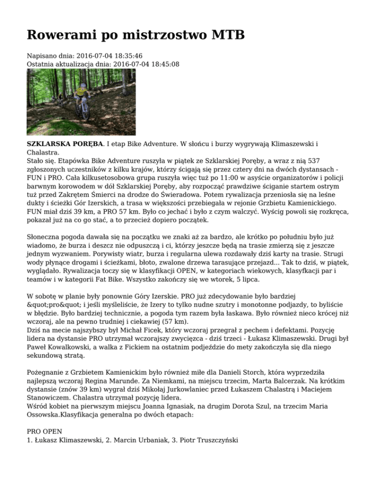 Rowerami po mistrzostwo MTB Napisano dnia: 2016-07-04 18:35:46 Ostatnia aktualizacja dnia: 2016-07-04 18:45:08 SZKLARSKA PORĘBA. I etap Bike Adventure. W słońcu i burzy wygrywają Klimaszewski i Chalastra. Stało się. Etapówka Bike Adventure ruszyła w piątek ze Szklarskiej Poręby, a wraz z nią 537 zgłoszonych uczestników z kilku krajów, którzy ścigają się przez cztery dni na dwóch dystansach FUN i PRO. Cała kilkusetosobowa grupa ruszyła więc tuż po 11:00 w asyście organizatorów i policji barwnym korowodem w dół Szklarskiej Poręby, aby rozpocząć prawdziwe ściganie startem ostrym tuż przed Zakrętem Śmierci na drodze do Świeradowa. Potem rywalizacja przeniosła się na leśne dukty i ścieżki Gór Izerskich, a trasa w większości przebiegała w rejonie Grzbietu Kamienickiego. FUN miał dziś 39 km, a PRO 57 km. Było co jechać i było z czym walczyć. Wyścig powoli się rozkręca, pokazał już na co go stać, a to przecież dopiero początek. Słoneczna pogoda dawała się na początku we znaki aż za bardzo, ale krótko po południu było już wiadomo, że burza i deszcz nie odpuszczą i ci, którzy jeszcze będą na trasie zmierzą się z jeszcze jednym wyzwaniem. Porywisty wiatr, burza i regularna ulewa rozdawały dziś karty na trasie. Strugi wody płynące drogami i ścieżkami, błoto, zwalone drzewa tarasujące przejazd... Tak to dziś, w piątek, wyglądało. Rywalizacja toczy się w klasyfikacji OPEN, w kategoriach wiekowych, klasyfkacji par i teamów i w kategorii Fat Bike. Wszystko zakończy się we wtorek, 5 lipca. W sobotę w planie były ponownie Góry Izerskie. PRO już zdecydowanie było bardziej "pro" i jeśli myśleliście, że Izery to tylko nudne szutry i monotonne podjazdy, to byliście w błędzie. Było bardziej technicznie, a pogoda tym razem była łaskawa. Było również nieco krócej niż wczoraj, ale na pewno trudniej i ciekawiej (57 km). Dziś na mecie najszybszy był Michał Ficek, który wczoraj przegrał z pechem i defektami. Pozycję lidera na dystansie PRO utrzymał wczorajszy zwycięzca - dziś trzeci - Łukasz Klimaszewski. Drugi był Paweł Kowalkowski, a walka z Fickiem na ostatnim podjeździe do mety zakończyła się dla niego sekundową stratą. Pożegnanie z Grzbietem Kamienickim było również miłe dla Danieli Storch, która wyprzedziła najlepszą wczoraj Regina Marunde. Za Niemkami, na miejscu trzecim, Marta Balcerzak. Na krótkim dystansie (znów 39 km) wygrał dziś Mikołaj Jurkowlaniec przed Łukaszem Chalastrą i Maciejem Stanowiczem. Chalastra utrzymał pozycję lidera. Wśród kobiet na pierwszym miejscu Joanna Ignasiak, na drugim Dorota Szul, na trzecim Maria Ossowska.Klasyfikacja generalna po dwóch etapach: PRO OPEN 1. Łukasz Klimaszewski, 2. Marcin Urbaniak, 3. Piotr Truszczyński PRO Kobiety 1. Regina Marunde, 2. Agnieszka Uroda-Hampelska, 3. Daniela Storch FUN OPEN 1. Łukasz Chalastra, 2. Mikołaj Jurkowlaniec, 3. Maciej Stanowicz FUN Kobiety 1. Joanna Ignasiak, 2. Maria Ossowska, 3. Dorota Szul