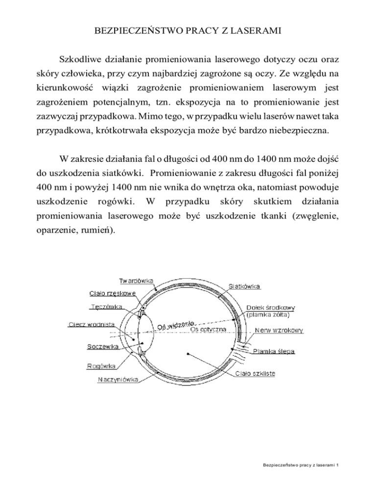 BEZPIECZE¼STWO PRACY Z LASERAMI Szkodliwe dzia»anie promieniowania laserowego dotyczy oczu oraz skóry cz»owieka, przy czym najbardziej zagroóone s oczy. Ze wzgldu na kierunkowoÑ wizki zagroóenie promieniowaniem laserowym jest zagroóeniem potencjalnym, tzn. ekspozycja na to promieniowanie jest zazwyczaj przypadkowa. Mimo tego, w przypadku wielu laserów nawet taka przypadkowa, krótkotrwa»a ekspozycja moóe by bardzo niebezpieczna. W zakresie dzia»ania fal o d»ugoÑci od 400 nm do 1400 nm moóe dojÑ do uszkodzenia siatkówki. Promieniowanie z zakresu d»ugoÑci fal ponióej 400 nm i powyóej 1400 nm nie wnika do wntrza oka, natomiast powoduje uszkodzenie rogówki. W przypadku skóry skutkiem dzia»ania promieniowania laserowego moóe by uszkodzenie tkanki (zwglenie, oparzenie, rumie½). Bezpiecze ½stw o prac y z lase ram i 1 Szkodliwe dzia»anie promieniowania laserowego - wywiera ciÑnienie na tkanki, - powoduje zmiany fotochemiczne, - podgrzewa. W przypadku dzia»ania na wzrok Szkodliwe promieniowanie moóe trafi do obszaru ïrenicy nie tylko bezpoÑrednio z lasera, ale i przypadkowo, poprzez odbicie wizki pierwotnej od róónych przedmiotów znajdujcych si na jej drodze, takich jak np. okienka, kuwety, soczewki, czy szyby okienne. Szczególnie jest to niebezpieczne przy pracy z laserami generujcymi promieniowanie w niewidzialnym zakresie widma. Promieniowanie impulsowe moóe by bardziej niebezpieczne od promieniowania cig»ego. O ile w przypadku promieniowania cig»ego ïrenica moóe odci jego dostp do oka juó na samym pocztku oÑwietlenia wzroku, o tyle w przypadku impulsu jego czas trwania moóe by zbyt krótki dla zareagowania ïrenicy we w»aÑciwy sposób. W przypadku dzia»ania na skór - skóra moóe ulec poparzeniu, uszkodzeniu poprzez nacicie termiczne lub odparowanie w miejscach oddzia»ywania promieniowania laserowego, - d»ugotrwa»e napromieniowanie moóe doprowadzi do mutacji komórkowych, a nawet do zmian nowotworowych w przypadku promieniowania ultrafioletowego, - promieniowanie laserowe moóe spowodowa poraóenie naczy½ krwionoÑnych i koagulacj bia»ek, a takóe destrukcj komórek na skutek dzia»ania fali uderzeniowej wywo»anej impulsem. Bezpiecze ½stw o prac y z lase ram i 2 Szkodliwe skutki oddzia»ywania promieniowania laserowego o róónych d»ugoÑciach fal na skór i oczy Zakres Oczy promieniowania Skóra 100 - 280 nm rumie½, (UV-C) uszkodzenie rogówki 280 - 315 nm twórcze, dzia»ania rako- przyspieszone starzenie skóry (UV-B) 315 - 400 nm (UV-A) 400 - 780 nm katarakta fotoche- oparzenie skóry, ciemnienie miczna pigmentu fotochemiczne i termiczne uszkodzenie siatkówki 780 - 1400 nm (IR-A) oparzenie skóry, reakcje fotoczu»e katarakta, poparzenie siatkówki 1400 - 3000 nm przymglenie rogówki, (IR-B) katarakta, oparzenie rogówki, gwa»towna oparzenie skóry ekspansja pary wodnej 3000 nm - 1 mm oparzenie rogówki (IR-C) Ðwiat»o z pozosta»ych zakresów spektralnych g»ównie wywo»uje oparzenia. Bezpiecze ½stw o prac y z lase ram i 3 Klasy laserów i produktów laserowych Klasa 1 1M Opis Lasery, które s bezpieczne w racjonalnych warunkach pracy. Lasery emitujce promieniowanie w zakresie d»ugoÑci fal od 302,5 nm do 4000 nm, które s bezpieczne w racjonalnych warunkach pracy, ale mog by niebezpieczne podczas patrzenia w wizk przez przyrzdy optyczne. 2 Lasery emitujce promieniowanie widzialne w przedziale d»ugoÑci fal do 700 nm. Ochrona oka jest zapewniona w sposób naturalny przez instynktowne reakcje obronne. (Moc promieniowania do 1 mW) 2M Lasery emitujce promieniowanie widzialne w przedziale d»ugoÑci fal do 700. Ochrona oka jest zapewniona w sposób naturalny przez instynktowne reakcje obronne, ale mog by niebezpieczne podczas patrzenia w wizk przez przyrzdy optyczne. (Moc promieniowania potencjalnie docierajca do oka do 1 mW) 3R Lasery emitujce promieniowanie w zakresie d»ugoÑci fal od 302,5 nm do 1 mm, dla których bezpoÑrednie patrzenie w wizk jest potencjalnie niebezpieczne. (Moc promieniowania do 5 mW) 3B Lasery, które s niebezpieczne podczas bezpoÑredniej ekspozycji promieniowania. Patrzenie na odbicia rozproszone s zwykle bezpieczne. (Moc promieniowania do 500 mW) 4 Lasery, które wytwarzaj niebezpieczne odbicia rozproszone. Mog one powodowa uszkodzenie skóry oraz stwarzaj zagroóenie poóarem. Podczas obs»ugi laserów klasy 4 naleóy zachowa szczególn ostroónoÑ. (Moc promieniowania powyóej 500 mW) Bezpiecze ½stw o prac y z lase ram i 4 Zabezpieczenia i oznaczenia laserów Zabezpieczenia laserów - obudowy ochronne, - specjalne, dostpne tylko dla osób do tego powo»anych, w»czniki lasera, - uk»ady zdalnego sterowania, - wskaïniki poziomów mocy i energii, - itp. Oznaczenia laserów - oznakowanie umoóliwiajce jednoznaczne okreÑlenie klasy zagroóenia, - znaki i napisy ostrzegawcze, - nazwa lasera i wytwórca. Wyposaóenie i oznakowanie pomieszcze½ laboratoryjnych - znaki i napisy ostrzegawcze oraz lampy sygnalizacyjne dzia»ajce podczas pracy lasera, - zminimalizowanie iloÑci powierzchni odbijajcych promieniowanie, - stosowanie dostatecznie silnego oÑwietlenia, wywo»ujcego zwóenie ïrenic, a tym samym ograniczenie iloÑci energii promieniowania wnikajcego do oka. Bezpiecze ½stw o prac y z lase ram i 5