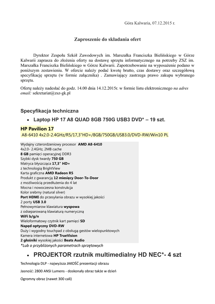 Góra Kalwaria, 07.12.2015 r. Zaproszenie do składania ofert Dyrektor Zespołu Szkół Zawodowych im. Marszałka Franciszka Bielińskiego w Górze Kalwarii zaprasza do złożenia oferty na dostawę sprzętu informatycznego na potrzeby ZSZ im. Marszałka Franciszka Bielińskiego w Górze Kalwarii. Zapotrzebowanie na wyposażenie podano w poniższym zestawieniu. W ofercie należy podać kwotę brutto, czas dostawy oraz szczegółową specyfikację sprzętu (w formie załącznika) . Zamawiający zastrzega prawo zakupu wybranego sprzętu. Ofertę należy nadesłać do godz. 14.00 dnia 14.12.2015r. w formie listu elektronicznego na adres email: [email protected] Specyfikacja techniczna · Laptop HP 17 A8 QUAD 8GB 750G USB3 DVD* – 19 szt. HP Pavilion 17 A8-6410 4x2.0-2.4GHz/R5/17,3"HD+/8GB/750GB/USB3.0/DVD-RW/Win10 PL Wydajny czterordzeniowy procesor AMD A8-6410 4x2.0- 2.4GHz, 2MB cache 8 GB pamięci operacyjnej DDR3 Szybki dysk twardy 750 GB Matryca błyszcząca 17,3" HD+ z technologią BrightView Karta graficzna AMD Radeon R5 Produkt z gwarancją 12 miesięcy Door-To-Door z możliwością przedłużenia do 4 lat Mocna i nowoczesna konstrukcja Kolor srebrny (natural silver) Port HDMI do przesyłania obrazu w wysokiej jakości 2 porty USB 3.0 Pełnowymiarow klawiatura wyspowa z odseparowaną klawiaturą numeryczną WiFi b/g/n Wieloformatowy czytnik kart pamięci SD Napęd optyczny DVD-RW Duży i wygodny touchpad z obsługą gestów wielopunktowych Kamera internetowa HP TrueVision 2 głośniki wysokiej jakości Beats Audio *Lub o przybliżonych parametrach sprzętowych · PROJEKTOR rzutnik multimedialny HD NEC*- 4 szt Technologia DLP - najwyższa JAKOŚĆ prezentacji obrazu Jasność: 2800 ANSI Lumens - doskonały obraz także w dzień Ogromny obraz (nawet 300 cali) Lekki, mobilny, cichy i bardzo prosty w obsłudze, Funkcja zoom - większy obraz z bliskiej odległości, Rozdzielczość: HD optyczna 1024x768, UXGA 1600x1200, Full HD 1920x1080 (max) Prostota połączeń - dwa najpopularniejsze porty: VGA oraz HDMI Idealny do prezentacji biznesowych, szkół, a także kina domowego Proporcja obrazu 4:3 oraz 16:9 Wbudowany głośnik o dobrej mocy Możliwość zamocowania na suficie Pełne sterowanie z pilot *Lub o przybliżonych parametrach sprzętowych · ROUTER D-LINK DWR-921 4G LTE 4XLAN WIFI SIM *- 1 szt. Parametry sieci przewodowej Przepustowość [LAN]100 Mb/s Transfer danych Wi-Fi 802.11n 150 Mbps Transfer danych Wi-Fi 802.11n 150 Mbps Parametry fizyczne Szerokość 190 mm Głębokość 111,5 mm *Lub o przybliżonych parametrach sprzętowych *Lub o przybliżonych parametrach sprzętowych · D-Link DHP-W306AV Internet * - 1 szt. Szybkość przesyłania danych PowerLine: maksymalnie 200 Mb/s (warstwa fizyczna) Ethernet: 10/100 Mb/s (automatyczna negocjacja) Wireless N Prędkość transmisji bezprzewodowej do 300 Mb/s Szyfrowanie sieci bezprzewodowej (WPA/WPA2) Parowanie urządzeń za naciśnięciem jednego przycisku (WPS™) Konfiguracja i zarządzanie System Plug and Play Szyfrowanie łącza AES (128-bitowe) *Lub o przybliżonych parametrach sprzętowych · Internet/siec z gniazdka 230V PLC 200Mbps Netgear x 7kompl* Zestaw NETGEAR Powerline AV 200MBps XAVB 2101 komplet *Lub o przybliżonych parametrach sprzętowych Przygotował: Robert Sobieraj Informatyk ZSZ