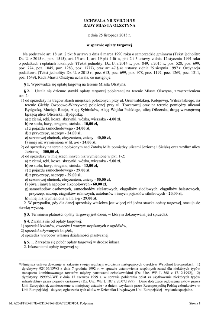 UCHWAŁA NR XVII/201/15 RADY MIASTA OLSZTYNA z dnia 25 listopada 2015 r. w sprawie opłaty targowej Na podstawie art. 18 ust. 2 pkt 8 ustawy z dnia 8 marca 1990 roku o samorządzie gminnym (Tekst jednolity: Dz. U. z 2015 r., poz. 1515), art. 15 ust. 1, art. 19 pkt 1 lit a, pkt 2 i 3 ustawy z dnia 12 stycznia 1991 roku o podatkach i opłatach lokalnych1) (Tekst jednolity: Dz. U. z 2014 r., poz. 849; z 2015 r., poz. 528, poz. 699, poz. 774, poz. 1045, poz. 1283, poz. 1777), oraz art. 47 § 4a ustawy z dnia 29 sierpnia 1997 r. Ordynacja podatkowa (Tekst jednolity: Dz. U. z 2015 r., poz. 613, poz. 699, poz. 978, poz. 1197, poz. 1269, poz. 1311, poz. 1649), Rada Miasta Olsztyna uchwala, co następuje: § 1. Wprowadza się opłatę targową na terenie Miasta Olsztyna. § 2. 1. Ustala się dzienne stawki opłaty targowej pobieranej na terenie Miasta Olsztyna, z zastrzeżeniem ust. 2: 1) od sprzedaży na tragowiskach miejskich położonych przy ul. Grunwaldzkiej, Kolejowej, Wilczyńskiego, na terenie Giełdy Owocowo-Warzywnej położonej przy ul. Towarowej oraz na terenie pomiędzy ulicami Bydgoską, Macieja Rataja, Aleją Sybiraków, Aleją Wojska Polskiego, ulicą Oficerską, drogą wewnętrzną łączącą ulice Oficerską i Bydgoską: a) z ziemi, ręki, kosza, skrzynki, wózka, wieszaka - 4,00 zł, b) ze stołu, ławy, straganu, stoiska - 10,00 zł, c) z pojazdu samochodowego - 24,00 zł, d) z przyczepy, naczepy - 24,00 zł, e) sezonowej choinek, chryzantem, zniczy - 40,00 zł, f) innej niż wymieniona w lit. a-e - 24,00 zł, 2) od sprzedaży na terenie położonym nad Zatoką Miłą pomiędzy ulicami Jeziorną i Sielską oraz wzdłuż ulicy Jeziornej - 300,00 zł, 3) od sprzedaży w miejscach innych niż wymienione w pkt. 1-2: a) z ziemi, ręki, kosza, skrzynki, wózka, wieszaka - 5,00 zł, b) ze stołu, ławy, straganu, stoiska - 13,00 zł, c) z pojazdu samochodowego - 29,00 zł, d) z przyczepy, naczepy - 29,00 zł, e) sezonowej choinek, chryzantem, zniczy - 50,00 zł, f) piwa i innych napojów alkoholowych - 60,00 zł, g) samochodów osobowych, samochodów cieżarowych, ciągników siodłowych, ciągników balastowych, przyczep, naczep, ciągników rolniczych, autobusów i innych pojazdów silnikowych - 20,00 zł, h) innej niż wymieniona w lit. a-g - 29,00 zł. 2. W przypadku, gdy dla danej sprzedaży właściwa jest więcej niż jedna stawka opłaty targowej, stosuje się stawkę wyższą. § 3. Terminem płatności opłaty targowej jest dzień, w którym dokonywana jest sprzedaż. § 4. Zwalnia się od opłaty targowej: 1) sprzedaż kwiatów, owoców i warzyw uzyskanych z ogródków, 2) sprzedaż używanych książek, 3) sprzedaż wyrobów własnej działalności plastycznej. § 5. 1. Zarządza się pobór opłaty targowej w drodze inkasa. 2. Inkasentami opłaty targowej są: 1) Niniejsza ustawa dokonuje w zakresie swojej regulacji wdrożenia następujących dyrektyw Wspólnot Europejskich: 1) dyrektywy 92/106/EWG z dnia 7 grudnia 1992 r. w sprawie ustanowienia wspólnych zasad dla niektórych typów transportu kombinowanego towarów między państwami członkowskimi (Dz. Urz. WE L 368 z 17.12.1992), 2) dyrektywy 1999/62/WE z dnia 17 czerwca 1999 r. w sprawie pobierania opłat za użytkowanie niektórych typów infrastruktury przez pojazdy ciężarowe (Dz. Urz. WE L 187 z 20.07.1999). Dane dotyczące ogłoszenia aktów prawa Unii Europejskiej, zamieszczone w niniejszej ustawie - z dniem uzyskania przez Rzeczpospolitą Polską członkostwa w Unii Europejskiej - dotyczą ogłoszenia tych aktów w Dzienniku Urzędowym Unii Europejskiej - wydanie specjalne. Id: A266FF9D-9F7E-4CDD-8168-2DA7E53D9F54. Podpisany Strona 1 1) Stowarzyszenie Kupców Giełda Owocowo-Warzywna „AGRO-WIT” - na terenie Giełdy OwocowoWarzywnej przy ul. Towarowej, 2) Zakład Targowisk Miejskich - na terenie Miasta Olsztyna, z wyłączeniem Giełdy Owocowo-Warzywnej „AGRO-WIT” przy ul. Towarowej. § 6. 1. Inkasentom opłaty targowej przysługuje wynagrodzenie w wysokości 50% pobranej i terminowo odprowadzonej opłaty targowej. 2. Inkasenci odprowadzają w całości pobraną opłatę targową na rachunek Urzędu Miasta Olsztyna, w terminie do 5 dnia miesiąca następującego po miesiącu, w którym opłatę pobrano. § 7. Wykonanie uchwały powierza się Prezydentowi Olsztyna. § 8. Traci moc Uchwała Nr XXIX/518/12 Rady Miasta Olsztyna z dnia 28 listopada 2012 r. w sprawie opłaty targowej (Dziennik Urzędowy Województwa Warmińsko-Mazurskiego z 2012 r., poz. 3684) oraz Uchwała Nr XLVI/760/13 Rady Miasta Olsztyna z dnia 18 listopada 2013 r. zmieniająca uchwałę Nr XXIX/518/12 Rady Miasta Olsztyna w sprawie opłaty targowej (Dziennik Urzędowy Województwa Warmińsko-Mazurskiego z 2013 r., poz. 3397). § 9. Uchwała wchodzi w życie z dniem 1 stycznia 2016 roku i podlega ogłoszeniu w Dzienniku Urzędowym Województwa Warmińsko-Mazurskiego. PRZEWODNICZĄCA RADY MIASTA Halina Ciunel Id: A266FF9D-9F7E-4CDD-8168-2DA7E53D9F54. Podpisany Strona 2