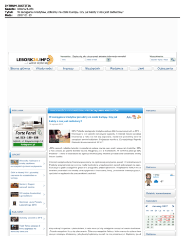 INTRUM JUSTITIA Gazeta: lebork24.info Tytuł: W zaciąganiu kredytów jesteśmy na czele Europy. Czy już każdy z nas jest zadłużony? Data: 2017-01-19 Newsletter: Zapisz się, aby otrzymywać aktualne informacje na maila! Adres e-mail Imię Strona główna Wiadomości REKLAMA Imprezy Niezbędnik Wyszukiwarka: szukany wyraz / fraza Redakcja Linki WIADOMOŚCI > WYDARZENIA > W ZACIĄGANIU KREDYTÓW... W zaciąganiu kredytów jesteśmy na czele Europy. Czy już Ogłoszenia Reklama każdy z nas jest zadłużony? 19 styczeń 2017 52% Polaków zaciągnęło kredyt na zakup dóbr konsumpcyjnych, a 35% – finansuje w ten sposób wakacyjne wyjazdy. I chociaż nasza sytuacja finansowa z roku na rok się poprawia, nadal nie potrafimy dobrze zarządzać swoim budżetem. Co jeszcze wynika z „Europejskiego Raportu Płatności Konsumenckich 2016”? SPORT Weronika Hallmann w ścisłej czołówce europejskich juniorek w pływaniu GOK w Nowej Wsi Lęborskiej zaprasza do uczestnictwa w turnieju „80% naszych rodaków twierdzi, że regularnie opłaca czynsz, gaz, prąd i spłaca raty kredytów. 90% z nas uważa, że jest to bardzo ważne. Najgorzej jest z mandatami. W terminie płaci je 66% Polaków” – mówi w wywiadzie dla agencji informacyjnej infoWire.pl Katarzyna Gosiewska z firmy Intrum Justitia. Chociaż swoją kondycję finansową oceniamy na ogół raczej pozytywnie, ponad 1/3 ankietowanych Polaków przynajmniej raz w życiu miała trudności z uregulowaniem swoich zobowiązań na czas. Sytuacja ta jest szczególnie groźna w przypadku przedsiębiorców. Niepłacenie faktur może bowiem prowadzić do trwałej utraty płynności finansowej firmy, problemów inwestycyjnych, opóźnień w wypłatach dla pracowników i zwolnień. Reklama Teraz Lębork -1° Seniorzy Pogoni wznowili trening VII kolejka Amatorskiej Ligi Siatkówki Ostatnio komentowane Kalendarz Sportowe Laury Powiatu Lęborskiego 2016 January 2017 Pn Wt Śr Cz Pt So KULTURA N 1 Sukcesy tancerek z SP 8 Teatr Tańca Jeszcze 5 Minut zaprasza na warsztaty taneczne Aby uniknąć kłopotów z płatnościami, trzeba nauczyć się umiejętnie zarządzać swoim budżetem. „Przede wszystkim liczy się planowanie. Zbierzmy wszystkie faktury, które mamy do opłacenia w danym miesiącu. Zobaczmy, jaką kwotę będziemy musieli na nie przeznaczyć. Zapłaćmy je od 2 3 4 5 6 7 8 9 10 11 12 13 14 15 16 17 18 19 20 21 22 23 24 25 26 27 28 29 30 31 Reklama INTRUM JUSTITIA Gazeta: lebork24.info Tytuł: W zaciąganiu kredytów jesteśmy na czele Europy. Czy już każdy z nas jest zadłużony? Data: 2017-01-19 Szkoła basu na Stacji Kultura – zapisy Zapraszamy na IX Pomorski Festiwal Piosenki Zimowej "Legendy Błękitnej Krainy" - XI edycja BIZNES Fundusze unijne dla przedsiębiorców razu, nie czekajmy na terminy płatności. Wtedy będziemy wiedzieć, jaką sumą pieniędzy dysponujemy do końca miesiąca, na co możemy sobie pozwolić i jaką kwotę możemy odłożyć” – radzi ekspertka. Do tego konieczna jest oczywiście edukacja finansowa, i to najlepiej – prowadzona już od dziecka. Dlatego ważne, że aż 82% badanych Polaków uczy swoje dzieci zarządzania finansami, a 79% – uważa, że powinna się tym zajmować również szkoła. http://infowire.pl 0 komentarzy: Imię : Zawsze ukrywaj komentarze Ukryj komentarze Przepisz kod do ramki : Firmy z Pomorza rozmawiały o możliwościach inwestycyjnych Mapa Lęborka Darmowe konta bankowe dla wszystkich. Czy propozycja rządu ma sens? Rozkład ZKM Dodaj komentarz Otwarte warsztaty w WSAiB dla osób prowadzących biznes Rozkład PKP Program TV Pomorskie przedsiębiorstwa dbają o kulturę biznesu Wyniki LOTTO Gry Online Kursy walut Dzisiaj jest: Thursday, 19 January 2017 r. Imieniny: Henryka, Mariusza, Erwina LĘBORK24 i wiesz szybciej... Strona główna Mapa strony Dodaj do ulubionych Polityka prywatności RSS Kontakt USERS ONLINE: 17 Prawa autorskie zastrzeżone © 2011 lebork24.info strony www Lębork