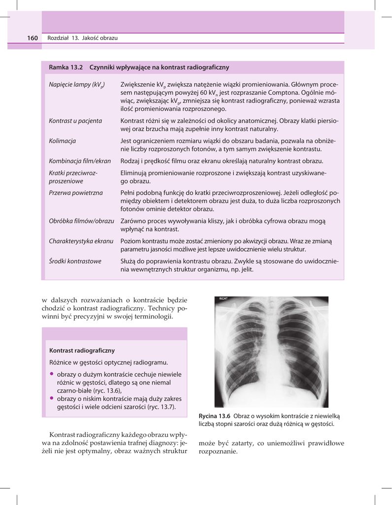160 Rozdział 13. Jakość obrazu Ramka 13.2 Czynniki wpływające na kontrast radiograficzny Napięcie lampy (kVp)Zwiększenie kVp zwiększa natężenie wiązki promieniowania. Głównym procesem następującym powyżej 60 kVn jest rozpraszanie Comptona. Ogólnie mówiąc, zwiększając kVp, zmniejsza się kontrast radiograficzny, ponieważ wzrasta ilość promieniowania rozproszonego. Kontrast u pacjentaKontrast różni się w zależności od okolicy anatomicznej. Obrazy klatki piersiowej oraz brzucha mają zupełnie inny kontrast naturalny. Kolimacja Jest ograniczeniem rozmiaru wiązki do obszaru badania, pozwala na obniżenie liczby rozproszonych fotonów, a tym samym zwiększenie kontrastu. Kombinacja film/ekran Rodzaj i prędkość filmu oraz ekranu określają naturalny kontrast obrazu. Kratki przeciwroz- proszeniowe Eliminują promieniowanie rozproszone i zwiększają kontrast uzyskiwanego obrazu. Przerwa powietrzna Pełni podobną funkcję do kratki przeciwrozproszeniowej. Jeżeli odległość pomiędzy obiektem i detektorem obrazu jest duża, to duża liczba rozproszonych fotonów ominie detektor obrazu. Obróbka filmów/obrazuZarówno proces wywoływania kliszy, jak i obróbka cyfrowa obrazu mogą wpłynąć na kontrast. Charakterystyka ekranuPoziom kontrastu może zostać zmieniony po akwizycji obrazu. Wraz ze zmianą parametru jasności możliwe jest lepsze uwidocznienie wielu struktur. Środki kontrastoweSłużą do poprawienia kontrastu obrazu. Zwykle są stosowane do uwidocznienia wewnętrznych struktur organizmu, np. jelit. w dalszych rozważaniach o kontraście będzie chodzić o kontrast radiograficzny. Technicy powinni być precyzyjni w swojej terminologii. Kontrast radiograficzny Różnice w gęstości optycznej radiogramu. yy obrazy o dużym kontraście cechuje niewiele różnic w gęstości, dlatego są one niemal czarno-białe (ryc. 13.6), yy obrazy o niskim kontraście mają duży zakres gęstości i wiele odcieni szarości (ryc. 13.7). Rycina 13.6 Obraz o wysokim kontraście z niewielką liczbą stopni szarości oraz dużą różnicą w gęstości. Kontrast radiograficzny każdego obrazu wpływa na zdolność postawienia trafnej diagnozy: jeżeli nie jest optymalny, obraz ważnych struktur może być zatarty, co uniemożliwi prawidłowe rozpoznanie.