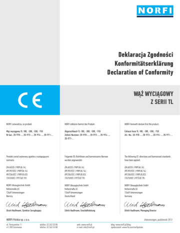 Deklaracja Zgodności Konformitätserklärung Declaration of Conformity WĄŻ WYCIĄGOWY Z SERII TL NORFI zaświadcza, że produkt: NORFI erklären hiermit das Produkt: NORFI herewith declare that the product: Wąż wyciągowy TL-180, -300, -500, -750 Nr kat.: 20-978-..., 20-973-..., 20-974-..., 20-971-... Abgasschlauch TL-180, -300, -500, -750 Artikel-Nummer: 20-978-..., 20-973-..., 20-974-..., 20-971-... Exhaust hose TL-180, -300, -500, -750 Art.-No.: 20-978-..., 20-973-..., 20-974-..., 20-971-... Produkt został wykonany zgodnie z następującymi normami: Folgende EG-Richtlinien und harmonisierte Normen wurden angewendet: The following EC-directives and harmonised standards have been applied: EN 60335 (1989.06.14), 89/392/EEC (1989.06.14), 89/336/EEC (1989.05.03), 73/23/EEC (1973.02.19). EN 60335 (1989.06.14), 89/392/EEC (1989.06.14), 89/336/EEC (1989.05.03), 73/23/EEC (1973.02.19). EN 60335 (1989.06.14), 89/392/EEC (1989.06.14), 89/336/EEC (1989.05.03), 73/23/EEC (1973.02.19). NORFI Absaugtechnik GmbH Kelterstraße 65 72669 Unterensingen Niemcy NORFI Absaugtechnik GmbH Kelterstraße 65 72669 Unterensingen Deutschland NORFI Absaugtechnik GmbH Kelterstraße 65 72669 Unterensingen Germany Ulrich Haußmann, Dyrektor Zarządzający Ulrich Haußmann, Geschäſtsleitung Ulrich Haußmann, Managing Director NORFI Polska sp. z o.o. ul. Partyzantów 11 41-200 Sosnowiec Unterensingen, październik 2013 telefon: 32 263 33 88 telefax: 32 263 33 88 web: www.norfi.pl e-mail: info@norfi.pl blog: www.norfi.pl/blog społeczność: www.fb.com/norfipolska
