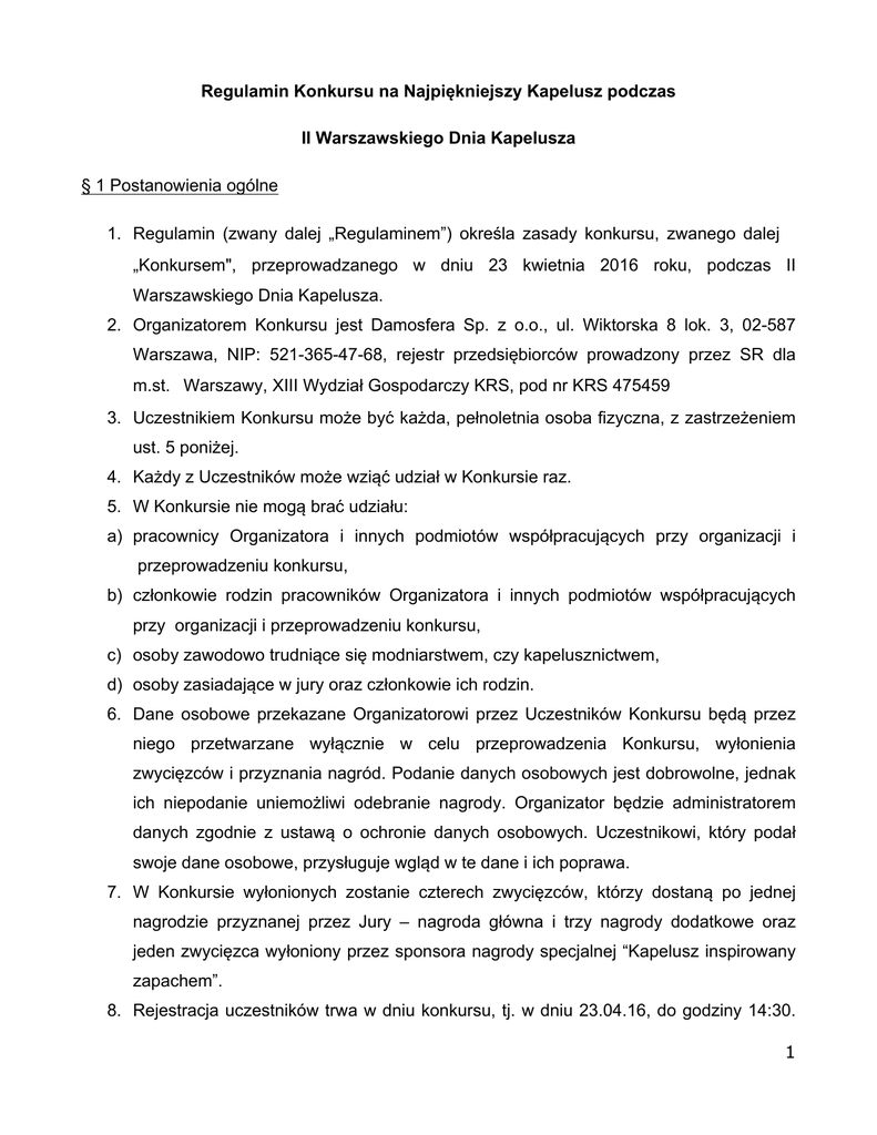 Regulamin Konkursu na Najpiękniejszy Kapelusz podczas II Warszawskiego Dnia Kapelusza § 1 Postanowienia ogólne 1. Regulamin (zwany dalej „Regulaminem”) określa zasady konkursu, zwanego dalej „Konkursem", przeprowadzanego w dniu 23 kwietnia 2016 roku, podczas II Warszawskiego Dnia Kapelusza. 2. Organizatorem Konkursu jest Damosfera Sp. z o.o., ul. Wiktorska 8 lok. 3, 02-587 Warszawa, NIP: 521-365-47-68, rejestr przedsiębiorców prowadzony przez SR dla m.st. Warszawy, XIII Wydział Gospodarczy KRS, pod nr KRS 475459 3. Uczestnikiem Konkursu może być każda, pełnoletnia osoba fizyczna, z zastrzeżeniem ust. 5 poniżej. 4. Każdy z Uczestników może wziąć udział w Konkursie raz. 5. W Konkursie nie mogą brać udziału: a) pracownicy Organizatora i innych podmiotów współpracujących przy organizacji i przeprowadzeniu konkursu, b) członkowie rodzin pracowników Organizatora i innych podmiotów współpracujących przy organizacji i przeprowadzeniu konkursu, c) osoby zawodowo trudniące się modniarstwem, czy kapelusznictwem, d) osoby zasiadające w jury oraz członkowie ich rodzin. 6. Dane osobowe przekazane Organizatorowi przez Uczestników Konkursu będą przez niego przetwarzane wyłącznie w celu przeprowadzenia Konkursu, wyłonienia zwycięzców i przyznania nagród. Podanie danych osobowych jest dobrowolne, jednak ich niepodanie uniemożliwi odebranie nagrody. Organizator będzie administratorem danych zgodnie z ustawą o ochronie danych osobowych. Uczestnikowi, który podał swoje dane osobowe, przysługuje wgląd w te dane i ich poprawa. 7. W Konkursie wyłonionych zostanie czterech zwycięzców, którzy dostaną po jednej nagrodzie przyznanej przez Jury – nagroda główna i trzy nagrody dodatkowe oraz jeden zwycięzca wyłoniony przez sponsora nagrody specjalnej “Kapelusz inspirowany zapachem”. 8. Rejestracja uczestników trwa w dniu konkursu, tj. w dniu 23.04.16, do godziny 14:30. 1 Uczestnik podpisuje kartę zgłoszenia zawierającą zgodę na fotografowanie a także umieszczanie jego zdjęć we wszelkich materiałach Organizatora, Sponsorów i Partnerów, oraz że zapoznał się z Regulaminem. § 2 Zasady Konkursu 1. Wypełniając i podpisując zgłoszenie Uczestnik wyraża zgodę na udział w Konkursie na zasadach określonych w Regulaminie oraz na przetwarzanie jego danych osobowych. 2. Z chwilą zgłoszenia się Uczestnik udziela Organizatorowi bezpłatnej, nieograniczonej czasowo i terytorialnie zgody w zakresie wykonywania majątkowych praw autorskich, w tym w szczególności korzystania ze zdjęć, na których znajdować się będzie uczestnik i wykorzystywania tych zdjęć i jego wizerunku na wszelkich polach eksploatacji, w tym również utrwalania i zwielokrotniania dowolną techniką, wykorzystania w całości lub części, w szczególności rozpowszechniania i publikacji w Internecie w ramach promocji Konkursu. 3. Organizator zastrzega sobie prawo braku dokonania wyboru w przypadku braku zgłoszeń, zgłoszeń niespełniających wymogów Regulaminu, lub dzieła zawierającego treści sprzeczne z dobrymi obyczajami. 4. W Konkursie przyznawane są następujące nagrody: a) Nagroda główna b) I Nagroda dodatkowa c) II Nagroda dodatkowa d) III Nagroda dodatkowa e) Nagroda specjalna przyznana przez sponsora Pure Homme Perfume “Kapelusz inspirowany zapachem. 5. Nagrody otrzymają osoby wyłonione przez Jury Konkursowe, pod przewodnictwem Pani Małgorzaty Zajączkowskiej, z zastrzeżeniem ust. 4 lit. e) powyżej. 6. Zdjęcia wszystkich osób biorących udział w konkursie zostaną opublikowane na portalu www.damosfera.com oraz w serwisie Facebook na stronie Organizatora. 7. Nie ma możliwości zamiany nagrody rzeczowej na ekwiwalent pieniężny ani na inną nagrodę. § 3 Postanowienia końcowe 2 1. Organizator zastrzega, że nie ponosi odpowiedzialności za zdarzenia uniemożliwiające prawidłowe przeprowadzenie Konkursu, których nie był w stanie przewidzieć lub którym nie mógł zapobiec, w szczególności w przypadku zaistnienia zdarzeń losowych w tym siły wyższej, 2. Organizator zastrzega sobie prawo zmiany postanowień Regulaminu w przypadku zmian przepisów prawnych lub innych istotnych zdarzeń mających wpływ na organizowanie Konkursu. 3