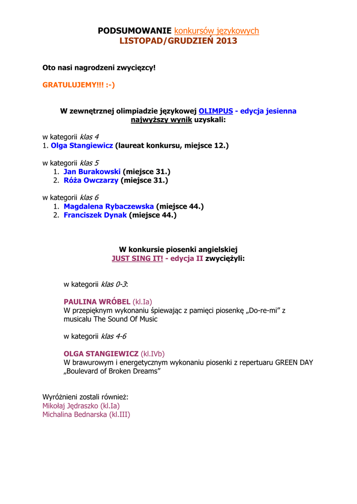 PODSUMOWANIE konkursów językowych LISTOPAD/GRUDZIEŃ 2013 Oto nasi nagrodzeni zwycięzcy! GRATULUJEMY!!! :-) W zewnętrznej olimpiadzie językowej OLIMPUS - edycja jesienna najwyższy wynik uzyskali: w kategorii klas 4 1. Olga Stangiewicz (laureat konkursu, miejsce 12.) w kategorii klas 5 1. Jan Burakowski (miejsce 31.) 2. Róża Owczarzy (miejsce 31.) w kategorii klas 6 1. Magdalena Rybaczewska (miejsce 44.) 2. Franciszek Dynak (miejsce 44.) W konkursie piosenki angielskiej JUST SING IT! - edycja II zwyciężyli: w kategorii klas 0-3: PAULINA WRÓBEL (kl.Ia) W przepięknym wykonaniu śpiewając z pamięci piosenkę „Do-re-mi” z musicalu The Sound Of Music w kategorii klas 4-6 OLGA STANGIEWICZ (kl.IVb) W brawurowym i energetycznym wykonaniu piosenki z repertuaru GREEN DAY „Boulevard of Broken Dreams” Wyróżnieni zostali również: Mikołaj Jędraszko (kl.Ia) Michalina Bednarska (kl.III) Finaliści w konkursie z literowania SPELLING CONTEST z klasy III 1. Weronika Kulas Małgosia Kwasowiec 2. Adam Wyszyński 3. Maja Jędraszko Na wyróżnienie zasługują: 1.Maks Konopacki 2. Michalina Bednarska z klasy IVb 1. Olga Stangiewicz Na wyróżnienie zasługują: 1. Maciej Jastrzębski 2. Anastazja Sadowska z klasy VI 1. Magdalena Rybaczewska 2. Agata Wyszyńska 3. Filip Dynak 4. Przemek Dudek