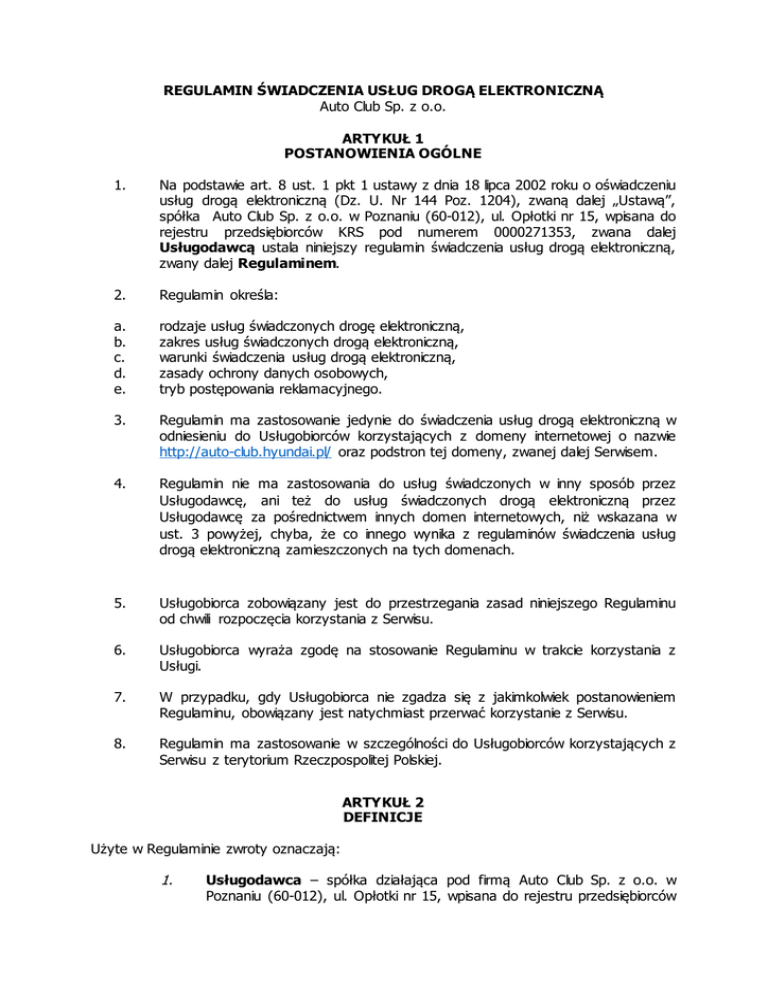 REGULAMIN ŚWIADCZENIA USŁUG DROGĄ ELEKTRONICZNĄ Auto Club Sp. z o.o. ARTYKUŁ 1 POSTANOWIENIA OGÓLNE 1. Na podstawie art. 8 ust. 1 pkt 1 ustawy z dnia 18 lipca 2002 roku o oświadczeniu usług drogą elektroniczną (Dz. U. Nr 144 Poz. 1204), zwaną dalej „Ustawą”, spółka Auto Club Sp. z o.o. w Poznaniu (60-012), ul. Opłotki nr 15, wpisana do rejestru przedsiębiorców KRS pod numerem 0000271353, zwana dalej Usługodawcą ustala niniejszy regulamin świadczenia usług drogą elektroniczną, zwany dalej Regulaminem. 2. Regulamin określa: a. b. c. d. e. rodzaje usług świadczonych drogę elektroniczną, zakres usług świadczonych drogą elektroniczną, warunki świadczenia usług drogą elektroniczną, zasady ochrony danych osobowych, tryb postępowania reklamacyjnego. 3. Regulamin ma zastosowanie jedynie do świadczenia usług drogą elektroniczną w odniesieniu do Usługobiorców korzystających z domeny internetowej o nazwie http://auto-club.hyundai.pl/ oraz podstron tej domeny, zwanej dalej Serwisem. 4. Regulamin nie ma zastosowania do usług świadczonych w inny sposób przez Usługodawcę, ani też do usług świadczonych drogą elektroniczną przez Usługodawcę za pośrednictwem innych domen internetowych, niż wskazana w ust. 3 powyżej, chyba, że co innego wynika z regulaminów świadczenia usług drogą elektroniczną zamieszczonych na tych domenach. 5. Usługobiorca zobowiązany jest do przestrzegania zasad niniejszego Regulaminu od chwili rozpoczęcia korzystania z Serwisu. 6. Usługobiorca wyraża zgodę na stosowanie Regulaminu w trakcie korzystania z Usługi. 7. W przypadku, gdy Usługobiorca nie zgadza się z jakimkolwiek postanowieniem Regulaminu, obowiązany jest natychmiast przerwać korzystanie z Serwisu. 8. Regulamin ma zastosowanie w szczególności do Usługobiorców korzystających z Serwisu z terytorium Rzeczpospolitej Polskiej. ARTYKUŁ 2 DEFINICJE Użyte w Regulaminie zwroty oznaczają: 1. Usługodawca – spółka działająca pod firmą Auto Club Sp. z o.o. w Poznaniu (60-012), ul. Opłotki nr 15, wpisana do rejestru przedsiębiorców KRS pod numerem 0000271353, świadcząca usługi drogą elektroniczną z wykorzystaniem Serwisu. 2. Usługobiorca – każda osoba fizyczna, prawna bądź jednostka organizacyjna nieposiadającą osobowości prawnej, która korzysta z usługi świadczonej przez Usługodawcę z wykorzystaniem Serwisu. 3. Adres Poczty Elektronicznej – oznaczenie systemu teleinformatycznego umożliwiającego porozumiewanie się za pomocą poczty elektronicznej (email), 4. System Teleinformatyczny – zespół współpracujących ze sobą urządzeń informatycznych i oprogramowania, zapewniający przetwarzanie i przechowywanie, także wysyłanie i odbieranie danych przez sieci telekomunikacyjne za pomocą właściwego dla danego rodzaju sieci urządzenia końcowego w rozumieniu przepisów Prawa telekomunikacyjnego. 5. Usługa – usługa świadczona drogą elektroniczną w rozumieniu przepisów Ustawy, przez Usługodawcę. ARTYKUŁ 3 ROZPOCZĘCIE I ZAKOŃCZENIE KORZYSTANIA Z USŁUGI 1. Usługobiorca rozpoczyna korzystanie z Usługi z chwilą rozpoczęcia odbierania danych dostarczanych przez Usługodawcę za pomocą Serwisu. 2. Natychmiast po wyświetleniu się strony głównej Serwisu na monitorze Usługobiorcy, Usługobiorca powinien zapoznać się z treścią Regulaminu, do którego dostęp możliwy jest przy użyciu odpowiedniego odnośnika (linku). 3. Usługobiorca kończy korzystanie z Usługi wraz z zakończeniem odbierania danych dostarczanych przez Usługodawcę za pomocą Serwisu, chyba, że korzysta z usługi „Zapytanie o broszurę”. 4. Usługobiorca może w każdej, dowolnie obranej przez siebie chwili zakończyć korzystanie z Usługi. ARTYKUŁ 4 RODZAJE I ZAKRES USŁUG. 1. W ramach korzystania z Serwisu Usługodawca świadczy następujące usługi: (i) Usługi Informacyjne - polegające na udostępnieniu na indywidualne żądanie Usługobiorcy danych znajdujących się w Serwisie w ten sposób, iż następuje ich wyświetlenie w formie przygotowanej przez Usługodawcę i przetworzonej przez system komputerowy Usługobiorcy, a także zapisaniu tych danych na dysku twardym lub innych nośnikach Usługobiorcy, a dotyczących w szczególności: (a) informacji o produktach, w tym modelach samochodów, wersjach wyposażania, cenach, promocjach, danych technicznych, (b) informacji o usługach serwisowych oferowanych przez Usługodawcę w miejscu prowadzenia działalności, (c) informacji o produktach finansowych i ubezpieczeniowych oferowanych nabywcom samochodów Hyundai, (d) informacji o głównych zasadach gwarancji, (e) informacji o dostępnych akcesoriach do samochodów, (f) informacji o działalności Usługodawcy, (g) informacji o dostępnych do nabycia samochodach używanych w ramach programu Hyundai i-BEST, (ii) Zapytanie o ofertę – umożliwienie nawiązania kontaktu między Usługobiorcą a Usługodawcą w celu prezentacji Usługobiorcy informacji o możliwości nabycia samochodu marki Hyundai, (iii) Jazda Testowa (Jazda Próbna) – umożliwienie nawiązania kontaktu między Usługobiorcą a Usługodawcą w celu umożliwienia obydwu tym podmiotom ustalenia czasu i miejsca odbycia przez Usługobiorcę jazdy testowej (próbnej) dostępnym samochodem marki Hyundai, (iv) Zapytanie o broszurę - udostępnienie Usługobiorcy, na jego życzenie, możliwości pobrania z Serwisu broszury (katalogu) z wykorzystaniem unikalnego linku wygenerowanego na skutek zapytania Usługobiorcy i przesłanego mu na Adres Poczty Elektronicznej. (v) Konfigurator - umożliwienie Usługobiorcy w ramach wyboru spośród dostępnych w Serwisie opcji preferowanej przez Usługobiorcę konfiguracji samochodu, w tym dobrania rodzaju silnika, wyposażenia dodatkowego, skorzystania z dostępnych akcji promocyjnych, akcesoriów, (vi) Kontakt – umożliwienie Usługobiorcy przesłania Usługodawcy wiadomości z wykorzystaniem formularza dostęp
