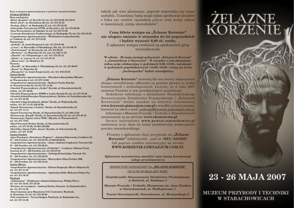 Baza noclegowo−gastronomiczna w powiecie starachowickim: STARACHOWICE Baza noclegowa: −Hotel „Senator”, ul. Krywki 18, tel. (41) 274 03 90, 274 03 91 −Hotel „Świt”, ul. Strzelnicza 29, tel. (41) 274 53 33 −Noclegi „Eden”, ul. Radomska 27, tel. (41) 274 25 55 −Schronisko Turystyczne PTTK, ul. Krywki 1, tel. (41) 274 62 68 −Dom Wycieczkowy, ul. Szkolna 14, tel. (41) 274 74 56 −Centrum Kształcenia Praktycznego, ul. Radomska 72, tel. (41) 275 38 65 −Gospodarstwo Agroturystyczne – Włodzimierz Łańcuchowski, ul. Podlesie 78, tel. (41) 273 19 52 Restauracje: −„Zodiak”, Al. Armii Krajowej 5, tel. (41) 274 67 88 −„Corso”, ul. Marszałka J.Piłsudskiego 103, tel. (41) 274 86 79 −„Pod Sosnami”, ul. Krzosa 9a, tel. (41) 274 90 23 −„Merkury”, ul. Majówka 20, tel. aut. tel. 802 11 53 −„Elanda”, ul. Chłopickiego 1, tel. (41) 273 25 12 −„Ellida”, ul. Lipowa 19, tel. (41) 274 59 48 −„Mona Lisa”, ul. Miodowa 10 Pizzerie: −„Banolli”, ul. Marszałka J. Piłsudskiego 33, tel. (41) 274 66 87 −„Rzym” ul. Majówka 28 −„Margerita” al. Armii Krajowej 21, tel. (41) 275 55 05 Gmina Brody −Gospodarstwo Agroturystyczne – Mirosława Raczyńska; Młynek , ul. Warszawska 4, tel. (41) 271 12 62 −Gospodarstwo Agroturystyczne – Barbara Turek, Krynki, ul. Starachowicka 53, tel.(41) 271 14 50 −Ośrodek Wypoczynkowy „Oczko”, Krynki, ul. Starachowicka 55, tel/fax. (41) 271 66 96 −Ośrodek Wypoczynkowy WSHE w Łodzi, Krynki 53, tel. (41) 271 67 28 −Ośrodek Rehabilitacyjno−Wypoczynkowy, Styków, ul. Świętokrzyska 125, tel. (41) 271 63 86 −Ośrodek Usług Socjalnych „Relax”, Brody, ul. Wójtowska 62, tel/fax. (41) 271 12 44, 249 25 98 −Zajazd, Restauracja „Carmen”, Brody, ul. Starachowicka 16, tel. (41) 271 14 14 −Zajazd Turystyczny Brody, ul. Starachowicka 31, tel. 802 14 30 −Restauracja „Karpik” Brody, ul. Starachowicka 27, tel. (41) 271 65 16 −Restauracja, Zajazd „Szary Wilk”, Młynek, ul. Warszawska 9, tel. (41) 271 18 67 −Motel−Przystań Wodna, Brody, ul. Starachowicka 35, tel/fax. (41) 271 63 92, (0) 604 103 886 −Hotel−Bar, Stacja Paliw „Irena”, Krynki, ul. Ostrowiecka 32, tel/fax. (41) 271 16 26 Gmina Pawłów −Agro−Pensjonat „Świerkowe Wzgórze” – Jolanta Dąbrowska, Grabków 25, 27 – 225 Pawłów, tel. (41) 272 29 70, (0) 604 96 26 25 −Gospodarstwo Agroturystyczne – Anna i Andrzej Trepkowie, Tarczek 120, 27 – 225 Pawłów, tel. (41) 272 29 24 −Gospodarstwo Agroturystyczne „Pytlówka” – Czesława i Marian Pytel, Tarczek 24, 27 – 225 Pawłów, tel. (41) 272 27 81 −Gospodarstwo Agroturystyczne – Jadwiga Kwiećińska, Tarczek 101, 27 – 225 Pawłów, tel. (41) 272 28 38 −Gospodarstwo Agroturystyczne – Mieczysław Glina Pawłów 39B, 27 – 225 Pawłów, tel. (41) 272 16 43 Gmina Mirzec −Gospodarstwo Agroturystyczne – Helena Kasprzyk, Mirzec Majorat 33, tel. (41) 271 31 07 −Gospodarstwo Agroturystyczne – Agnieszka Idzik, Małyszyn Dolny 31a, tel. (41) 271 30 35 Wąchock −„Sabatówka” – Waldemar i Jolanta Sabatowscy, Wielka Wieś 1, tel. (41) 271 22 67, 271 25 28 −Kwatery do wynajęcia – Andrzej Wydra, Parszów, ul. Kamieniczki 6, tel. (41) 271 21 50 −Dom Gościnny przy Klasztorze O.O. Cystersów, Wąchock, ul. Kościelna 14, tel. (41) 271 50 66 −Pole namiotowe – Teresa Śmigas, Wąchock, ul. Radomska 41a, tel. (41) 271 51 65 takich jak wiec plemienny, pogrzeb wojownika czy sceny zaślubin. Uczestnicy będą mogli także spróbować strzałów z łuku czy rzutów rzymskim pilum oraz wziąć udział w inscenizacji „targu niewolników”. Cena biletu wstępu na „Żelazne Korzenie” nie ulegnie zmianie w stosunku do lat poprzednich i będzie wynosić 6,00 zł./ osobę. Z opłacenia wstępu zwolnieni są opiekunowie grup wycieczkowych. W sobotę − 26 maja nastąpi połączenie „Żelaznych Korzeni” z „Jarmarkiem u Starzecha” . W związku z tym planujemy jedną sesję edukacyjną w godzinach 9.00.−12.00., natomiast w godzinach popołudniowych (14.00.−18.00.) wstęp na teren „Archeoparku” będzie nieodpłatny. „Żelazne Korzenie” stanowią dla nas swoisty eksperyment służący uwrażliwieniu odbiorców na przekaz płynący ze źródeł historycznych i archeologicznych. Liczymy, że w roku 2007 zechcecie Państwo w tym przedsięwzięciu uczestniczyć. Dodatkowe informacje o działalności Świętokrzyskiego Stowarzyszenia Dziedzictwa Przemysłowego i „Żelaznych Korzeniach” można uzyskać na witrynie internetowej www.korzenie.gimnazjum.com.pl a wszelkie pytania prosimy kierować na adres e−mail: [email protected] Informacje o Muzeum Przyrody i Techniki w Starachowicach zamieszczone są na serwisie www.ekomuzeum.pl Serwis internetowy www.powiat.starachowice.pl zamieszcza m.in. dane na temat przedsięwzięć promocyjnych powiatu starachowickiego. Prosimy o zgłoszenie chęci przyjazdu na „Żelazne Korzenie” telefonicznie − pod nr (041) 3445291 lub poprzez szablon rezerwacyjny na stronie WWW.KORZENIE.GIMNAZJUM.COM.PL Zgłoszenie uczestnictwa umożliwi nam lepszą koordynację całego przedsięwzięcia SERDECZNIE ZAPRASZAMY NA „ŻELAZNE KORZENIE” OD 23 DO 26 MAJA 2007 ROKU Świętokrzyskie Stowarzyszenie Dziedzictwa Przemysłowego w Kielcach, ul. Zamkowa 5 Muzeum Przyrody i Techniki, Ekomuzeum im. Jana Pazdura w Starachowicach, ul. Wielkopiecowa 1 Powiat Starachowicki, Starachowice, ul. Mrozowskiego 9 pod patronatem Ministerstwa Kultury i Dziedzictwa Narodowego, Wojewody Świętokrzyskiego i Marszałka Województwa Świętokrzyskiego Zapraszamy do udziału w warsztatach archeologicznych na terenie „ARCHEOPARKU” w Muzeum Przyrody i Techniki w Starachowicach w dniach 23−26 maja 2007 W Muzeum najcenniejszym obiektem jest Wielki Piec pochodzący z 1899 r. z zachowanym kompletnym ciągiem technologicznym oraz największa na świecie maszyna parowa, która trafiła do Starachow