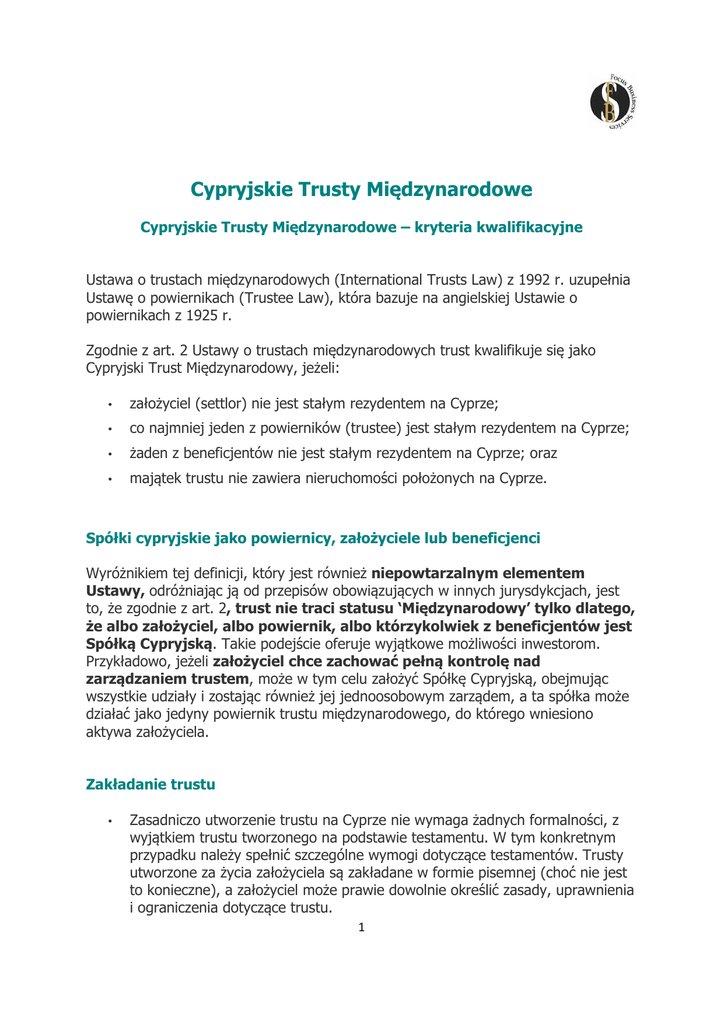 Cypryjskie Trusty Międzynarodowe Cypryjskie Trusty Międzynarodowe – kryteria kwalifikacyjne Ustawa o trustach międzynarodowych (International Trusts Law) z 1992 r. uzupełnia Ustawę o powiernikach (Trustee Law), która bazuje na angielskiej Ustawie o powiernikach z 1925 r. Zgodnie z art. 2 Ustawy o trustach międzynarodowych trust kwalifikuje się jako Cypryjski Trust Międzynarodowy, jeżeli: • założyciel (settlor) nie jest stałym rezydentem na Cyprze; • co najmniej jeden z powierników (trustee) jest stałym rezydentem na Cyprze; • żaden z beneficjentów nie jest stałym rezydentem na Cyprze; oraz • majątek trustu nie zawiera nieruchomości położonych na Cyprze. Spółki cypryjskie jako powiernicy, założyciele lub beneficjenci Wyróżnikiem tej definicji, który jest również niepowtarzalnym elementem Ustawy, odróżniając ją od przepisów obowiązujących w innych jurysdykcjach, jest to, że zgodnie z art. 2, trust nie traci statusu ‘Międzynarodowy’ tylko dlatego, że albo założyciel, albo powiernik, albo którzykolwiek z beneficjentów jest Spółką Cypryjską. Takie podejście oferuje wyjątkowe możliwości inwestorom. Przykładowo, jeżeli założyciel chce zachować pełną kontrolę nad zarządzaniem trustem, może w tym celu założyć Spółkę Cypryjską, obejmując wszystkie udziały i zostając również jej jednoosobowym zarządem, a ta spółka może działać jako jedyny powiernik trustu międzynarodowego, do którego wniesiono aktywa założyciela. Zakładanie trustu • Zasadniczo utworzenie trustu na Cyprze nie wymaga żadnych formalności, z wyjątkiem trustu tworzonego na podstawie testamentu. W tym konkretnym przypadku należy spełnić szczególne wymogi dotyczące testamentów. Trusty utworzone za życia założyciela są zakładane w formie pisemnej (choć nie jest to konieczne), a założyciel może prawie dowolnie określić zasady, uprawnienia i ograniczenia dotyczące trustu. 1 • • • Trust musi jednak spełniać klasyczne wymogi trzech ‘pewności’: pewności woli, przedmiotu i celów. Innymi słowy w instrumencie, na podstawie którego ma powstać trust, założyciel musi wyrazić wolę utworzenia trustu, a środki i beneficjenci trustu muszą być określeni z racjonalną pewnością. Trusty utworzone na Cyprze nie podlegają żadnym wymogom rejestracyjnym ani sprawozdawczym. Aby instrument założycielski trustu został prawidłowo sporządzony, wymagane jest uiszczenie opłaty skarbowej w wysokości 250,00 CYP, bez względu na wartości środków trustu. Poufność Ustawa o trustach międzynarodowych zabrania powiernikom oraz wszelkim innym osobom, w tym funkcjonariuszom rządowym i banku centralnego, ujawniania jakichkolwiek informacji dotyczących trustu. Tylko sąd może nakazać ujawnienie takich informacji, jeżeli ma to istotne znacznie dla wyniku danego postępowania cywilnego lub karnego. Korzyści podatkowe Cypryjskie Trusty Międzynarodowe nie podlegają opodatkowaniu na Cyprze. Opodatkowanie Trustów opiera się na dość skomplikowanych zasadach, lecz występują następujące możliwości wykorzystania trustów do celów optymalizacji podatkowej. Dochód Dywidendy Zyski kapitałowe Całość dochodu, ze sprzedaży i innego, Trustu Międzynarodowego (tj. Trustu, którego majątek i źródła dochodów znajdują się poza Cyprem) nie podlega opodatkowaniu na Cyprze. Dywidendy, odsetki i inne dochody otrzymywane przez Trust od spółki cypryjskiej nie podlegają ani podatkowi dochodowemu ani podatkowi u źródła. Zyski ze zbycia aktywów Trustu Międzynarodowego nie podlegają na Cyprze opodatkowaniu podatkiem od zysków kapitałowych. 2 Emerytura na Cyprze Cudzoziemiec, który tworzy Trust Międzynarodowy na Cyprze i przechodzi na emeryturę na Cyprze jest zwolniony z podatku, jeżeli całość majątku i dochodu znajduje się za granicą, nawet jeśli to on jest beneficjentem. Podatek od nieruchomości Trust Międzynarodowy utworzony na Cyprze do celów planowania podatku od nieruchomości nie podlega na Cyprze podatkowi od nieruchomości. Trusty zwykle są wykorzystywane przez zamożne osoby fizyczne w celu ochrony majątku przed podatkiem od spadków lub podatkiem od zysków kapitałowych w kraju macierzystym. Mogą z nich również korzystać pracownicy zagraniczni, wnosząc do trustu przed repatriacją majątek nabyty w trakcie pracy za granicą – w celu ochrony tego majątku przed opodatkowaniem w swoim kraju macierzystym. Inne mechanizmy ochrony przed podatkami Korzyści pozapodatkowe Planowanie majątku Anonimowość Przechowywanie środków za granicą Ochrona Dzięki Trustowi Cypryjskiemu osoba fizyczna może spowodować, że osoby małoletnie, niepełnosprawne umysłowo lub takie, którym nie można powierzyć zarządu majątkiem tej osoby, będą zabezpieczone finansowo, nawet po jej śmierci. Dzięki Trustowi Cypryjskiemu dana osoba fizyczna może spowodować, że majątek odziedziczy ktoś, kto zgodnie z przepisami obowiązującymi w jej kraju, byłby normalnie wyłączony z dziedziczenia. Osoba fizyczna, która chce pozbyć się majątku osobistego ze względów podatkowych lub innych może wnieść ten majątek do Cypryjskiego Trustu Międzynarodowego. Osoba fizyczna, która chce zachować w tajemnicy, że jest właścicielem spółki, może to osiągnąć tworząc Zarządzany Trust Cypryjski, który będzie posiadaczem udziałów/akcji w tej spółce. Osoba fizyczna, która ma lub może mieć dochody uzyskiwane za granicą, a których nie chce przekazywać do kraju, w którym jest rezydentem, może skierować te dochody do Powierników Cypryjskich w celu przechowywania ich w Zarządzanych Trustach zgodnie z własną wolą. Ustawa o trustach międzynarodowych stanowi, że bez 3 aktywów uszczerbku dla przepisów prawa upadłościowego i likwidacyjnego Cypru lub innego kraju, jeżeli zostanie dowiedzione przed sądem, że trust utworzono z zamiarem popełnienia nadużycia na szkodę 