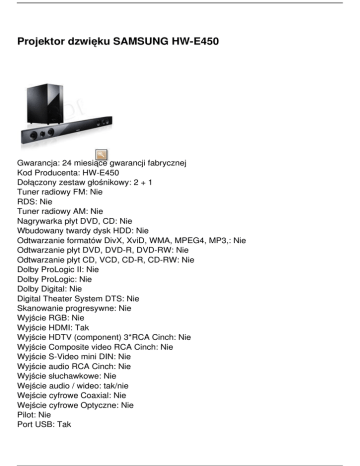 Projektor dzwięku SAMSUNG HW-E450 Gwarancja: 24 miesiące gwarancji fabrycznej Kod Producenta: HW-E450 Dołączony zestaw głośnikowy: 2 + 1 Tuner radiowy FM: Nie RDS: Nie Tuner radiowy AM: Nie Nagrywarka płyt DVD, CD: Nie Wbudowany twardy dysk HDD: Nie Odtwarzanie formatów DivX, XviD, WMA, MPEG4, MP3,: Nie Odtwarzanie płyt DVD, DVD-R, DVD-RW: Nie Odtwarzanie płyt CD, VCD, CD-R, CD-RW: Nie Dolby ProLogic II: Nie Dolby ProLogic: Nie Dolby Digital: Nie Digital Theater System DTS: Nie Skanowanie progresywne: Nie Wyjście RGB: Nie Wyjście HDMI: Tak Wyjście HDTV (component) 3*RCA Cinch: Nie Wyjście Composite video RCA Cinch: Nie Wyjście S-Video mini DIN: Nie Wyjście audio RCA Cinch: Nie Wyjście słuchawkowe: Nie Wejście audio / wideo: tak/nie Wejście cyfrowe Coaxial: Nie Wejście cyfrowe Optyczne: Nie Pilot: Nie Port USB: Tak Czytnik kart pamięci: Nie Moc wzmacniacza - 2x przód: 80 W Moc wzmacniacza - subwoofer: 120 W Informacje dodatkowe: Technologia Depth Rendering produkuje dźwięk 3D równie przestrzenny i realny jak w prawdziwym kinie. Opis: Cyfrowy projektor dźwięku 2.1 marki Samsung. Numer części EAN: 8806071881539 P/N: 8806071881539 P/N:: 8806071881539 Numer części EAN:: 8806085434592 Cena: 847.29 PLN Powered by TCPDF (www.tcpdf.org)