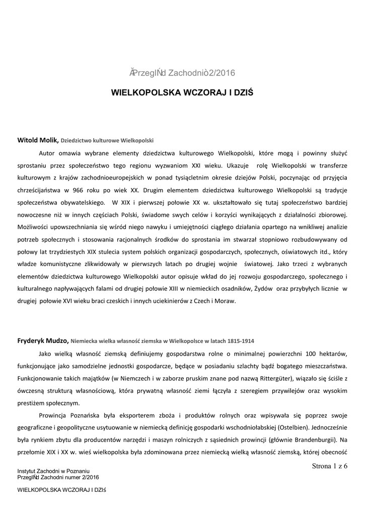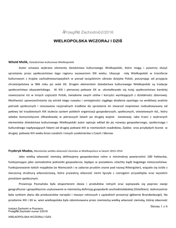 „Przegląd Zachodni” 2/2016 WIELKOPOLSKA WCZORAJ I DZIŚ Witold Molik, Dziedzictwo kulturowe Wielkopolski Autor omawia wybrane elementy dziedzictwa kulturowego Wielkopolski, które mogą i powinny służyć sprostaniu przez społeczeństwo tego regionu wyzwaniom XXI wieku. Ukazuje rolę Wielkopolski w transferze kulturowym z krajów zachodnioeuropejskich w ponad tysiącletnim okresie dziejów Polski, poczynając od przyjęcia chrześcijaństwa w 966 roku po wiek XX. Drugim elementem dziedzictwa kulturowego Wielkopolski są tradycje społeczeństwa obywatelskiego. W XIX i pierwszej połowie XX w. ukształtowało się tutaj społeczeństwo bardziej nowoczesne niż w innych częściach Polski, świadome swych celów i korzyści wynikających z działalności zbiorowej. Możliwości upowszechniania się wśród niego nawyku i umiejętności ciągłego działania opartego na wnikliwej analizie potrzeb społecznych i stosowania racjonalnych środków do sprostania im stwarzał stopniowo rozbudowywany od połowy lat trzydziestych XIX stulecia system polskich organizacji gospodarczych, społecznych, oświatowych itd., który władze komunistyczne zlikwidowały w pierwszych latach po drugiej wojnie światowej. Jako trzeci z wybranych elementów dziedzictwa kulturowego Wielkopolski autor opisuje wkład do jej rozwoju gospodarczego, społecznego i kulturalnego napływających falami od drugiej połowie XIII w niemieckich osadników, Żydów oraz przybyłych licznie w drugiej połowie XVI wieku braci czeskich i innych uciekinierów z Czech i Moraw. Fryderyk Mudzo, Niemiecka wielka własność ziemska w Wielkopolsce w latach 1815-1914 Jako wielką własność ziemską definiujemy gospodarstwa rolne o minimalnej powierzchni 100 hektarów, funkcjonujące jako samodzielne jednostki gospodarcze, będące w posiadaniu szlachty bądź bogatego mieszczaństwa. Funkcjonowanie takich majątków (w Niemczech i w zaborze pruskim znane pod nazwą Rittergüter), wiązało się ściśle z ówczesną strukturą własnościową, która prywatną własność ziemi łączyła z szeregiem przywilejów oraz wysokim prestiżem społecznym. Prowincja Poznańska była eksporterem zboża i produktów rolnych oraz wpisywała się poprzez swoje geograficzne i geopolityczne usytuowanie w niemiecką definicję gospodarki wschodniołabskiej (Ostelbien). Jednocześnie była rynkiem zbytu dla producentów narzędzi i maszyn rolniczych z sąsiednich prowincji (głównie Brandenburgii). Na przełomie XIX i XX w. wieś wielkopolska była zdominowana przez niemiecką wielką własność ziemską, której obecność Instytut Zachodni w Poznaniu Przegląd Zachodni numer 2/2016 WIELKOPOLSKA WCZORAJ I DZIŚ Strona 1 z 6 zdołała w ciągu jednego stulecia związać Wielkopolskę na pozór trwale z Prusami i państwem niemieckim. Udział niemieckich posiadaczy ziemskich w życiu gospodarczym i społecznym Wielkopolski w latach 1815-1914 należy ocenić jako dynamiczny proces transformacji całokształtu Wielkopolski w ciągu jednego stulecia. Zmiany te były odczuwalne nawet w okresie międzywojennym, kiedy to większość posiadaczy owych majątków ziemskich przyjęła obywatelstwo polskie i działała aktywnie w życiu gospodarczym i politycznym II Rzeczpospolitej. Dariusz Jeziorny, Misja pułkownika Harry’ego Wade’a do Polski a wybuch Powstania Wielkopolskiego 27 grudnia 1918 r. w Poznaniu wybuchło powstanie przeciwko Niemcom. Jego celem było doprowadzenie do przynależności Wielkopolski do odradzającej się po latach rozbiorów Rzeczypospolitej. W momencie wybuchu obecny był w Poznaniu brytyjski pułkownik Harry Wade, attaché w Kopenhadze, towarzyszący powracającemu do kraju Ignacemu Paderewskiemu. Artykuł zawiera odpowiedzi na pytanie, czy był on wysłany do stolicy Wielkopolski przez tajne służby, czy wiązało się to z użyczeniem przez Londyn swojego krążownika dla przewiezienia Paderewskiego, czy obecność pułkownika przyczyniła się do wybuchu powstania i jak został oceniony jego pobyt w Poznaniu przez brytyjskie władze. Wojciech Szymon Kowalski, Instytucje giełdowe miasta Poznania w perspektywie historycznej Artykuł jest próbą zarysu ewolucji poznańskich instytucji giełdowych w perspektywie historycznej. Nobilitująca tradycja średniowiecznych Jarmarków Świętojańskich wpisuje się w giełdową genezę miasta, lecz rzeczywistego zaczynu dla zorganizowanego w tej formie handlu upatrywać należy w powstałej w połowie XIX stulecia Posener Börse. Dziwiętnastowieczna spuścizna instytucjonalna w następnym stuleciu przyczyniła się w istotny sposób do ,,złotej ery” Giełdy Zbożowo–Towarowej w Poznaniu, powołanej do życia w odrodzonej już Polsce. W okresie dwudziestolecia międzywojennego Poznań był siedzibą dwóch giełd - oprócz wiodącego rynku rolno–spożywczego, funkcjonowała także giełda pieniężna, nieporównywalnie mniejsza od warszawskiej, lecz będąca liderem wśród giełd regionalnych II Rzeczpospolitej, zlokalizowanych we Lwowie, Łodzi, Krakowie, Wilnie i Katowicach. Po zakończeniu II wojny światowej podjęto próby reaktywacji giełd towarowych w Polsce, w tym także w Poznaniu. Wkrótce jednak okazało się, że zmienione realia polityczne przekreślają możliwość funkcjonowania instytucji będącej symbolem wrogiej ustrojowi socjalistycznemu gospodarki rynkowej. Przełom lat 1989/1990 sprawił, że w 1991 r., po przeszło czterech dekadach w krajobrazie gospodarczym Poznania znów pojawiła się giełda towarowa. Nie powróciła ona do swej ostatniej przedwojennej i powojennej siedziby przy al. Marcinkowskiego 3, ale za lokalizację obrała znajdujący się w dzielnicy Winogrady biurowiec przy ul. Gronowej 20. Po dekadzie obiecującego rozwoju działalność Giełdy Poznańskiej SA będącej m.in. prekursorem towarowych transakcji terminowych w Polsce, została w sposób kontrowersyjny przerwana. Instytut Zachodni w Poznaniu Przegląd Zachodni nume